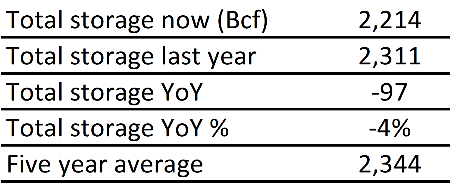 Inventories for the US are now at a deficit of 97 Bcf to last year and a deficit of 130 Bcf to the five-year average. |
