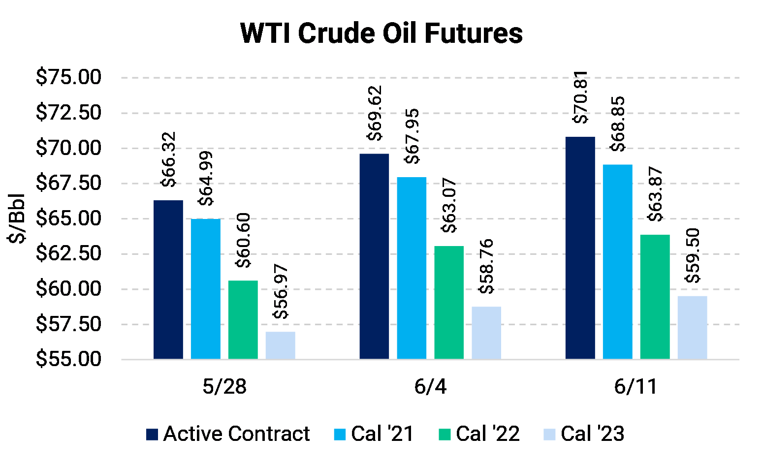 Oil prices rallied for the third consecutive week; WTI settled on Friday at $70.91/Bbl. Although the price trend remains up, there are still three near-term price threats to consider. First, many forecasts of global oil demand recovery through 2H2021 are very optimistic. If demand projections fall short, then prices will respond. Second, Iranian nuclear talks continue to drag on, but a deal that would remove sanctions on its oil seems likely. Third, outside of Iran, OPEC supply increases and the timing of such increases is unknown past July. Up until this point, OPEC has been very good at managing this market’s oil supply.