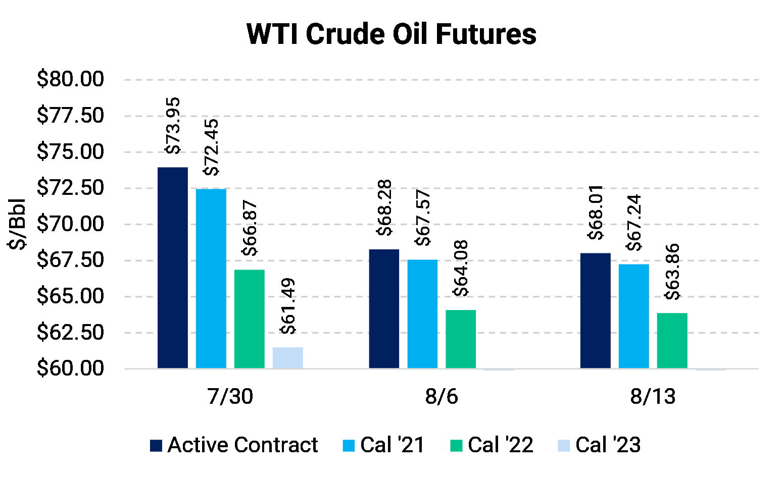 West Texas Intermediate finished the week mostly unchanged from the previous Friday's close of $68.28. However, price was volatile; WTI traded within a $5/Bbl range amid demand concerns stemming from the latest Covid-19 surge.