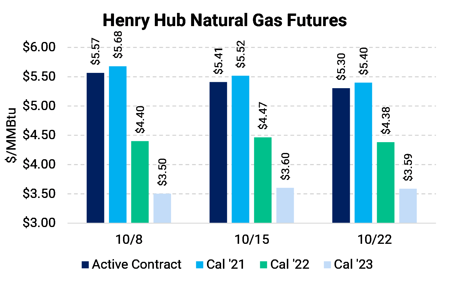 The scarcity of barrels has supported prices, but also led to more backwardation in the forward curve. Backwardation in the oil market has reached extreme levels and can make hedging further down the curve less appealing. However, even Cal 2024 is trading above $63/Bbl, a level at which many of our clients say they are profitable. Want to mitigate the backwardation “penalty?” Costless collars can be an alternative to a swap here if hedges need to be added in Cal 2022 and beyond. The natural put-skew in the market that is usually present in oil options is not as punishing at the moment. This warrants a hard look at using collars instead of swaps.