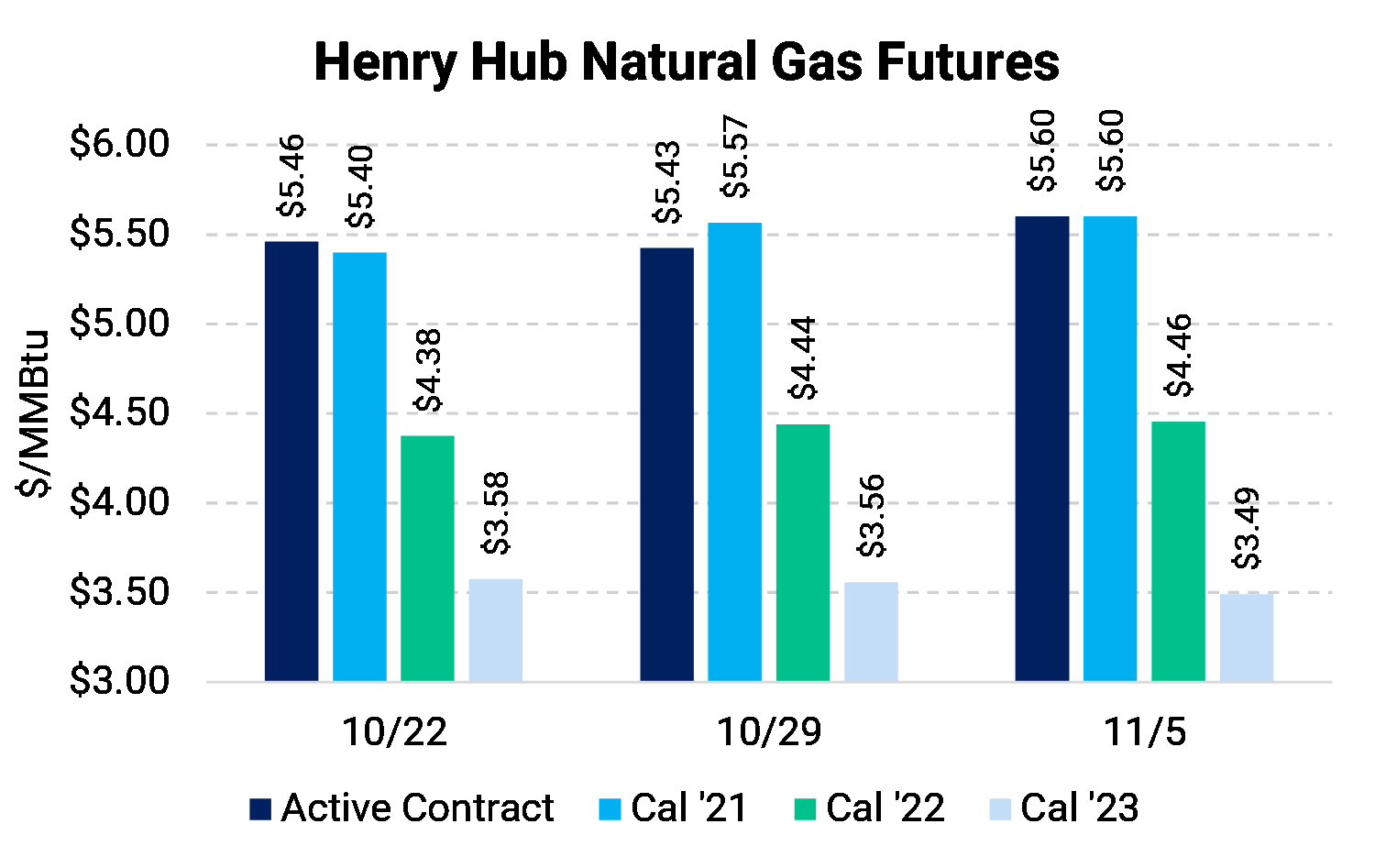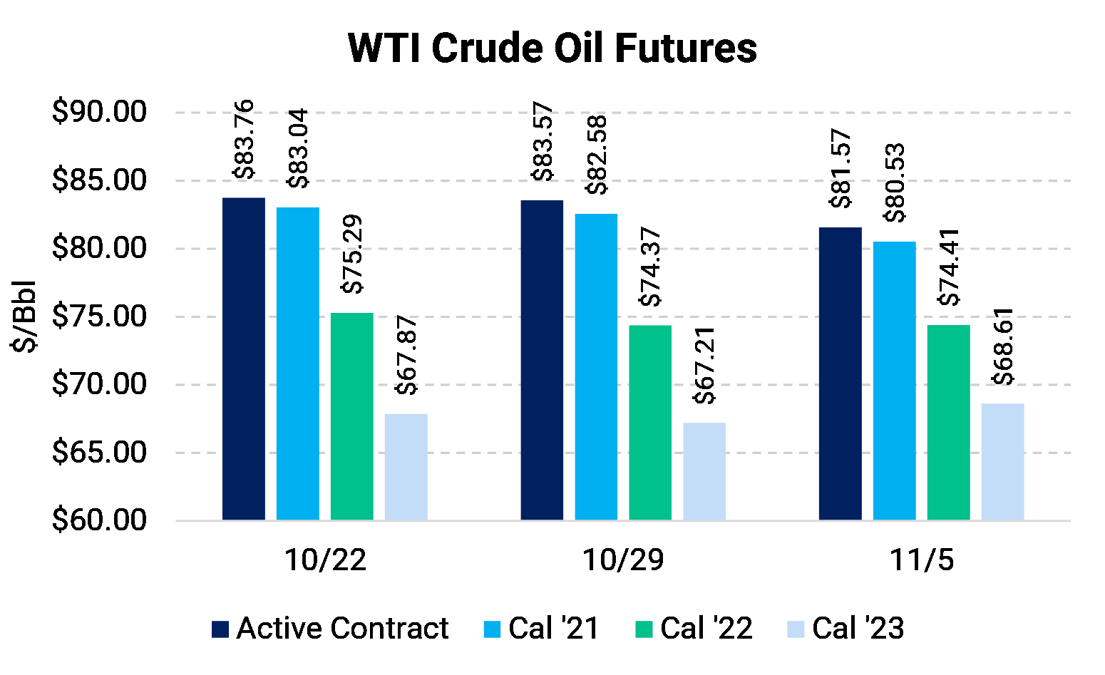 Our recommendations are generally costless collars for hedges, whether producer or consumer, with the possible exception of the next few months in the curve. Producers, if you still need some December or 1Q2022 hedges, the high price of oil may be too good to pass up. Beyond that, into 2022, collars maintain upside price exposure while providing good protection. In 2023, we still like collars, but with a warning: Producers should weigh the backwardation “penalty” against the upside exposure. In many cases, floors (the put option strike) dips down to the low $60s or upper $50s. If that’s not tolerable, swaps are your best choice.