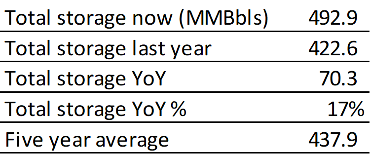 Inventories for the US are now at a surplus of 70.285 MBbls to last year and a surplus of 54.99 MBbls to the five-year average.