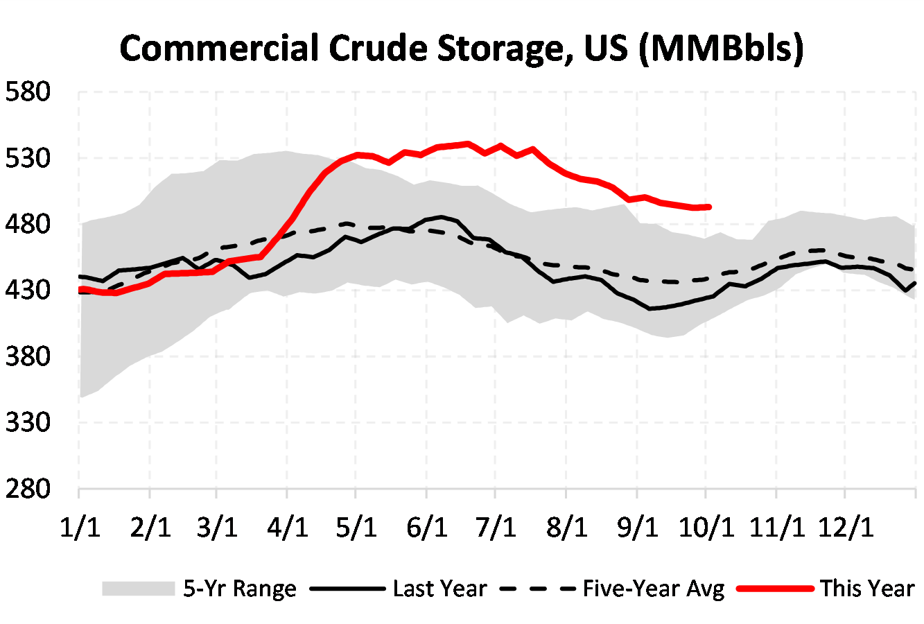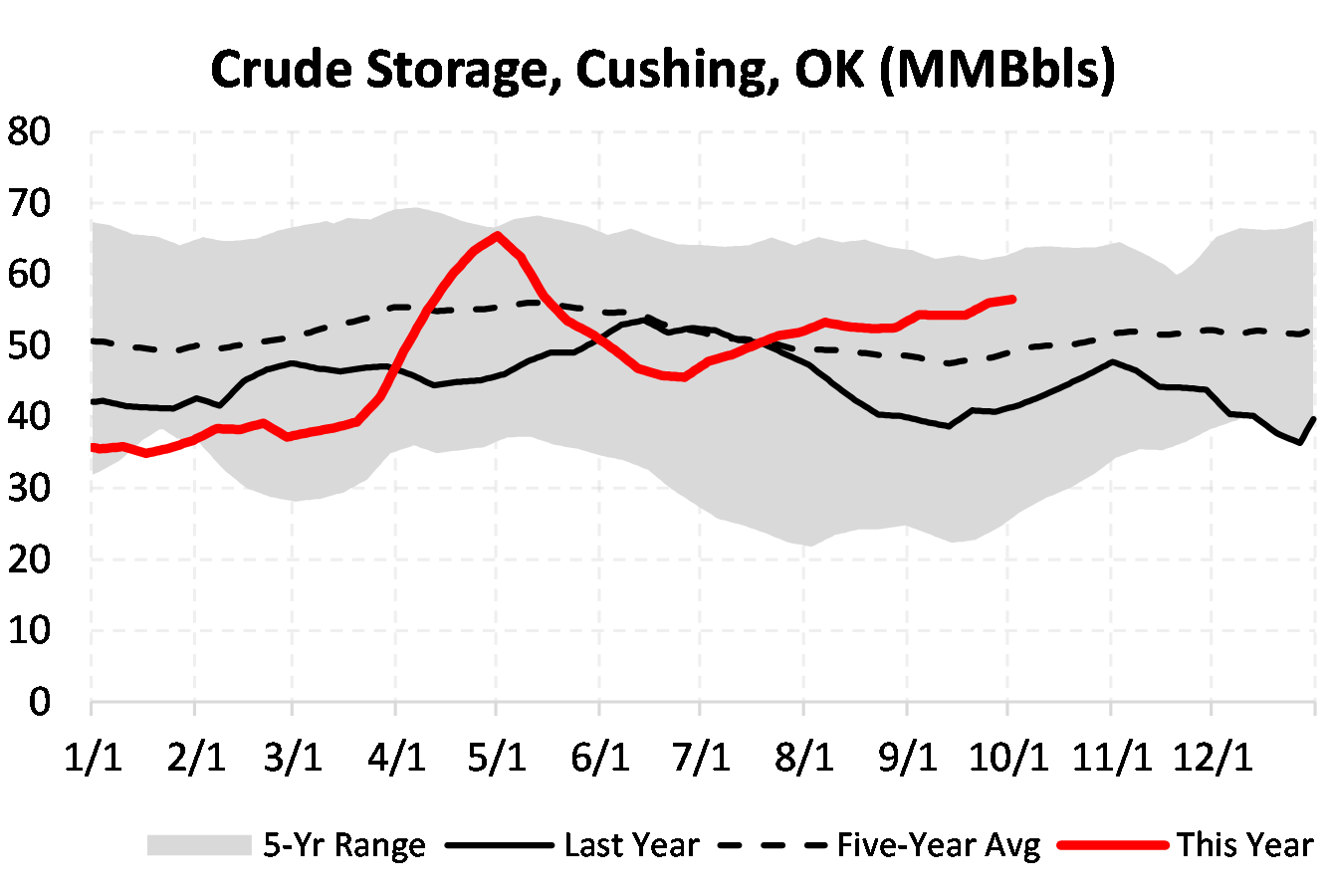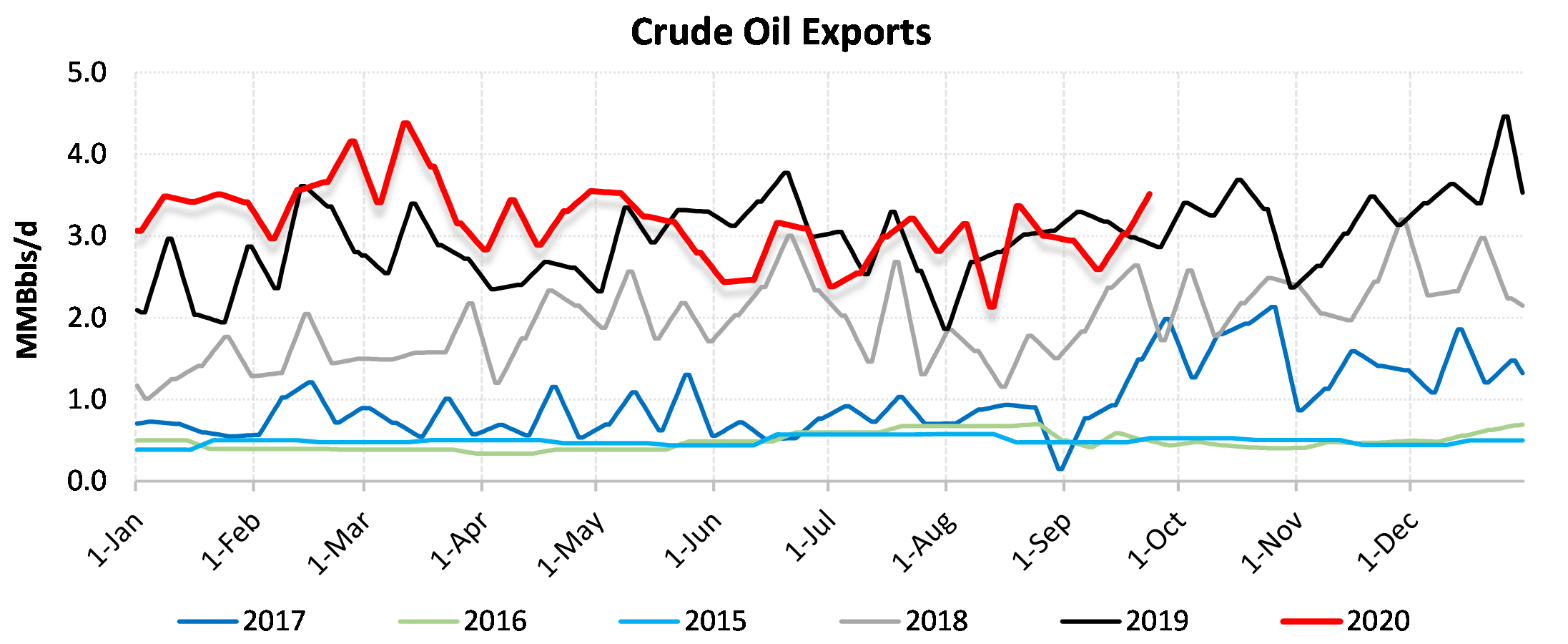 EIA reported a build of 501 MBbls in U.S. crude-oil inventories for the week ending 10/2/2020. This was smaller than the average estimate of -880 MBbls as reported by Bloomberg.