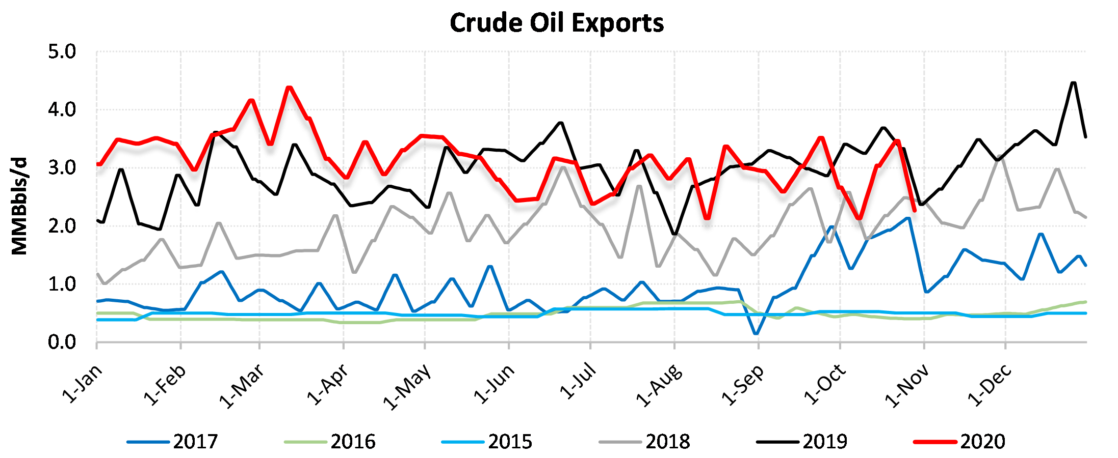 EIA reported a draw of -7998 MBbls in U.S. crude-oil inventories for the week ending 10/30/2020. This was larger than the average estimate of 581 MBbls as reported by Bloomberg.