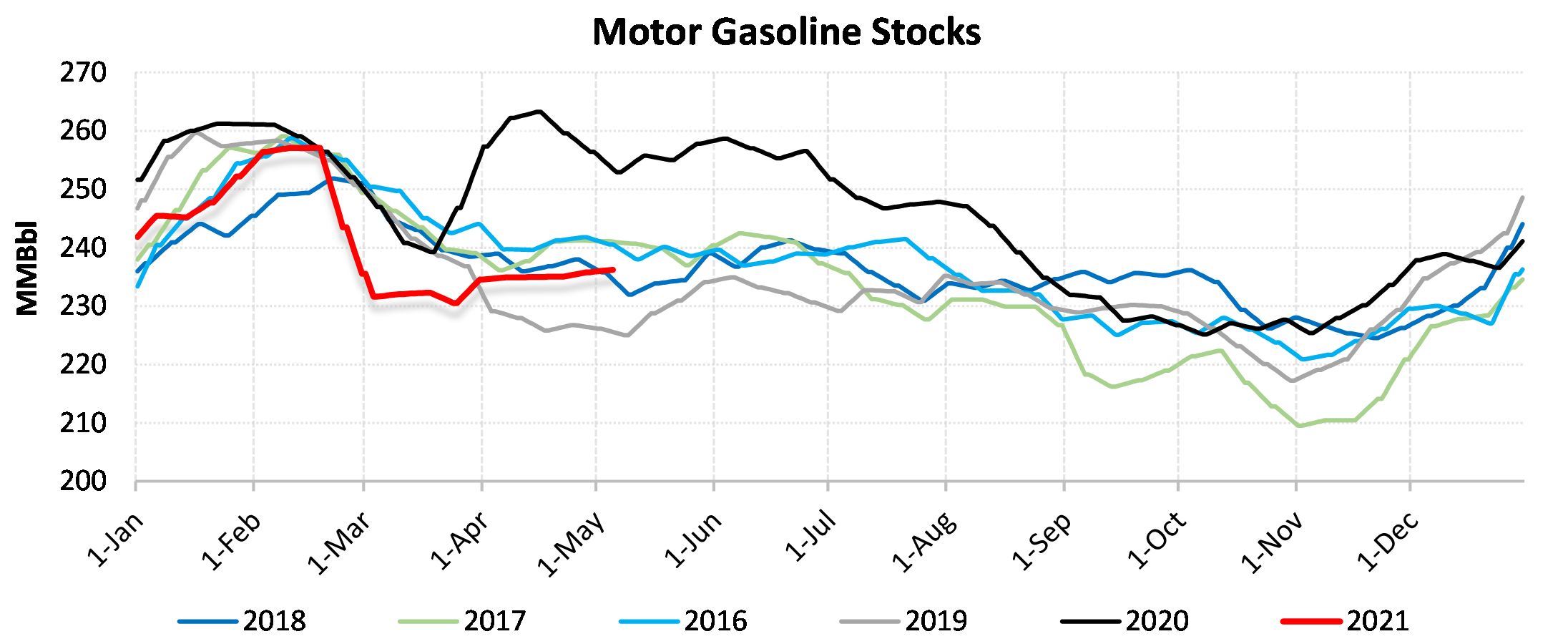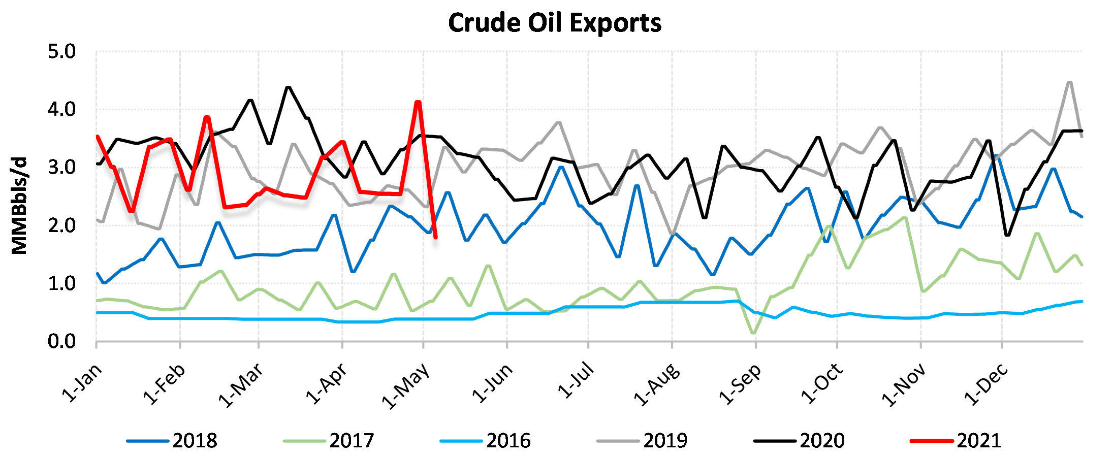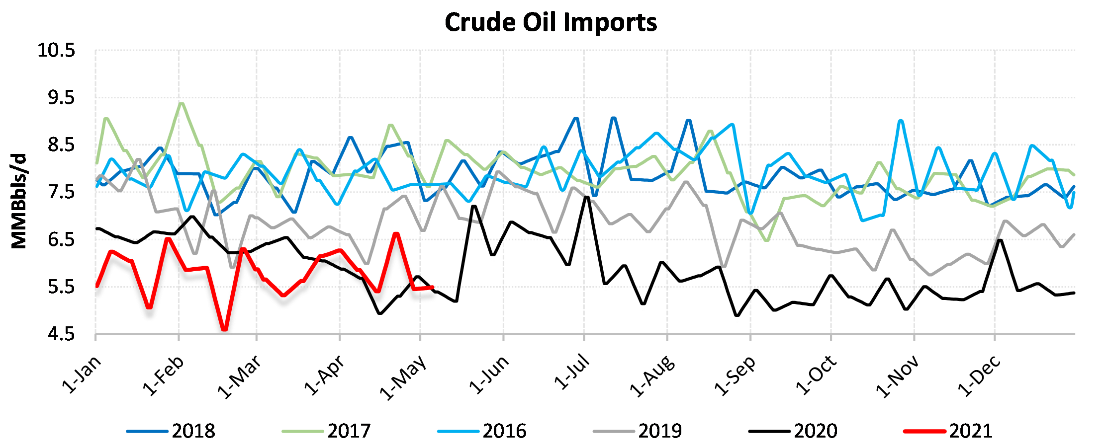 EIA reported a draw of -426 MBbls in U.S. crude-oil inventories for the week ending 5/7/2021. This was smaller than the average estimate of -2200 MBbls as reported by Bloomberg.