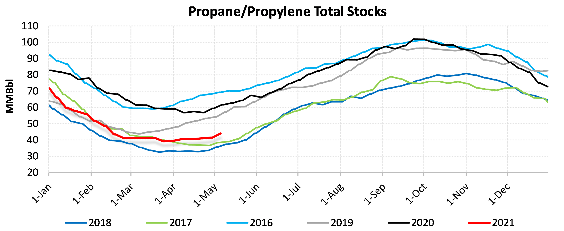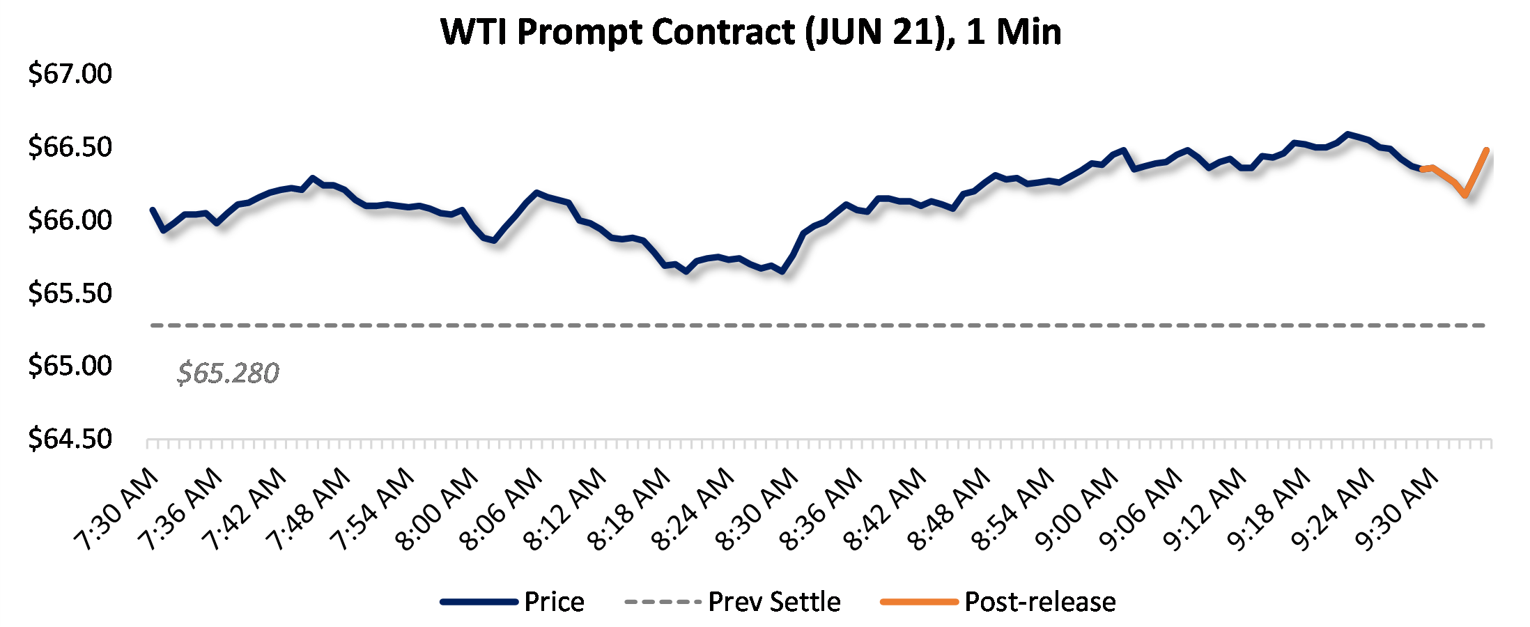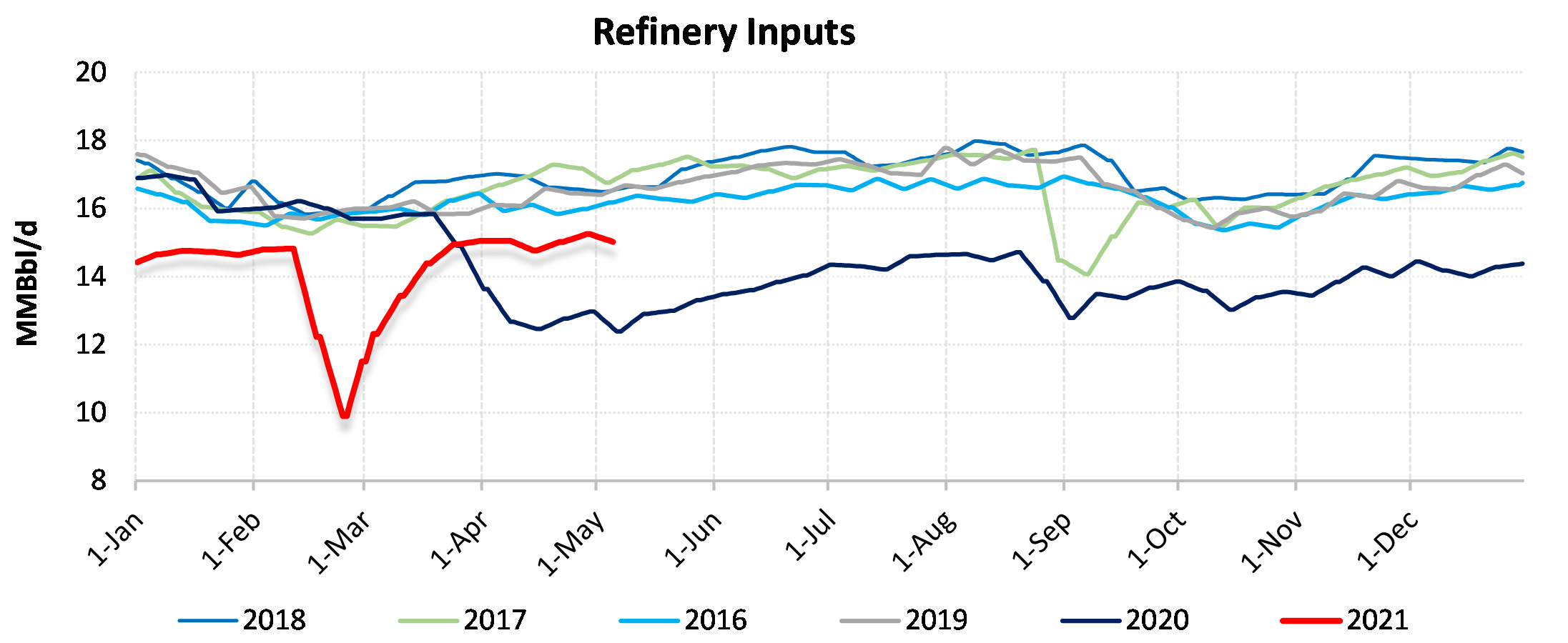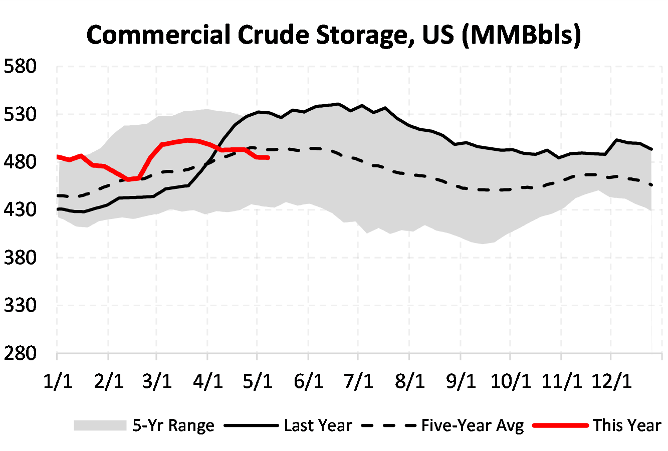 EIA reported a draw of -426 MBbls in U.S. crude-oil inventories for the week ending 5/7/2021. This was smaller than the average estimate of -2200 MBbls as reported by Bloomberg.