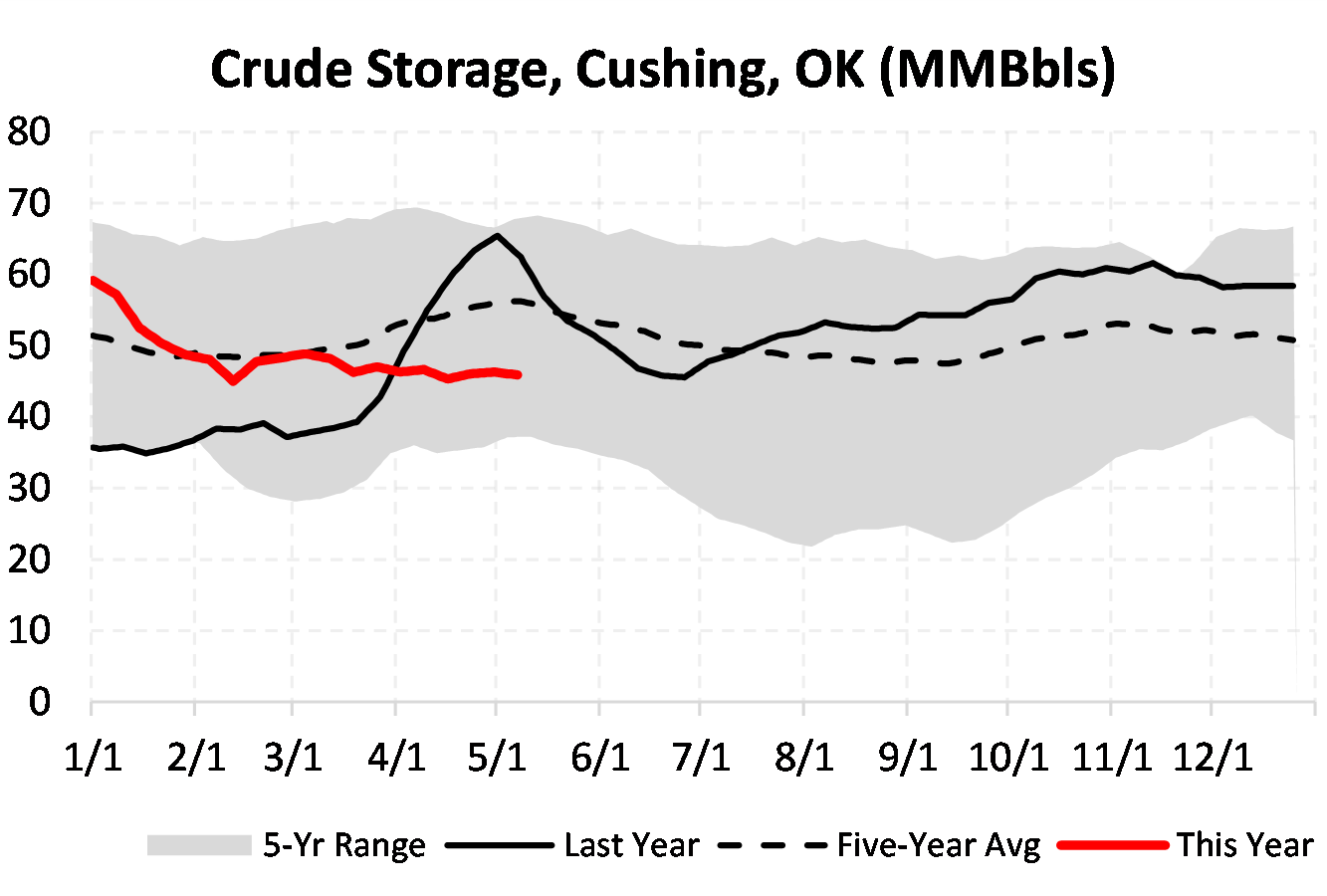 Inventories for the US are now at a deficit of 47.53 MBbls to last year and a deficit of 8.03 MBbls to the five-year average.