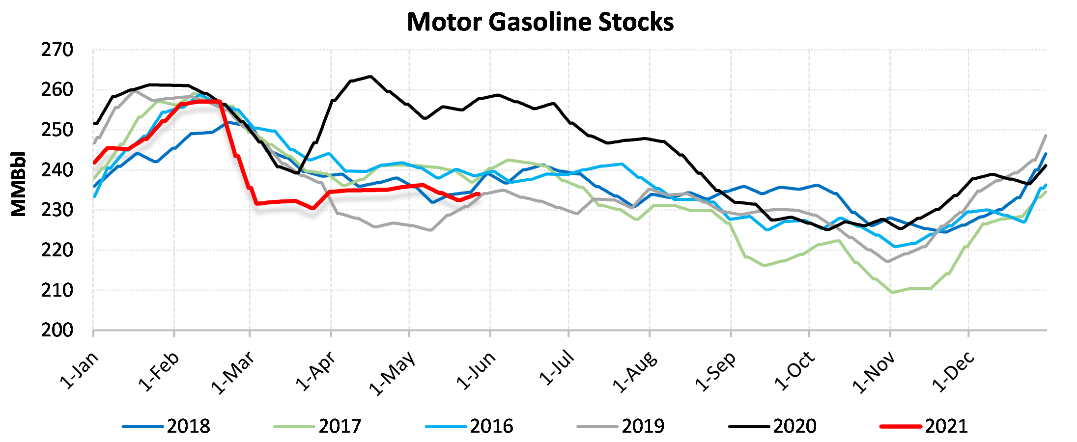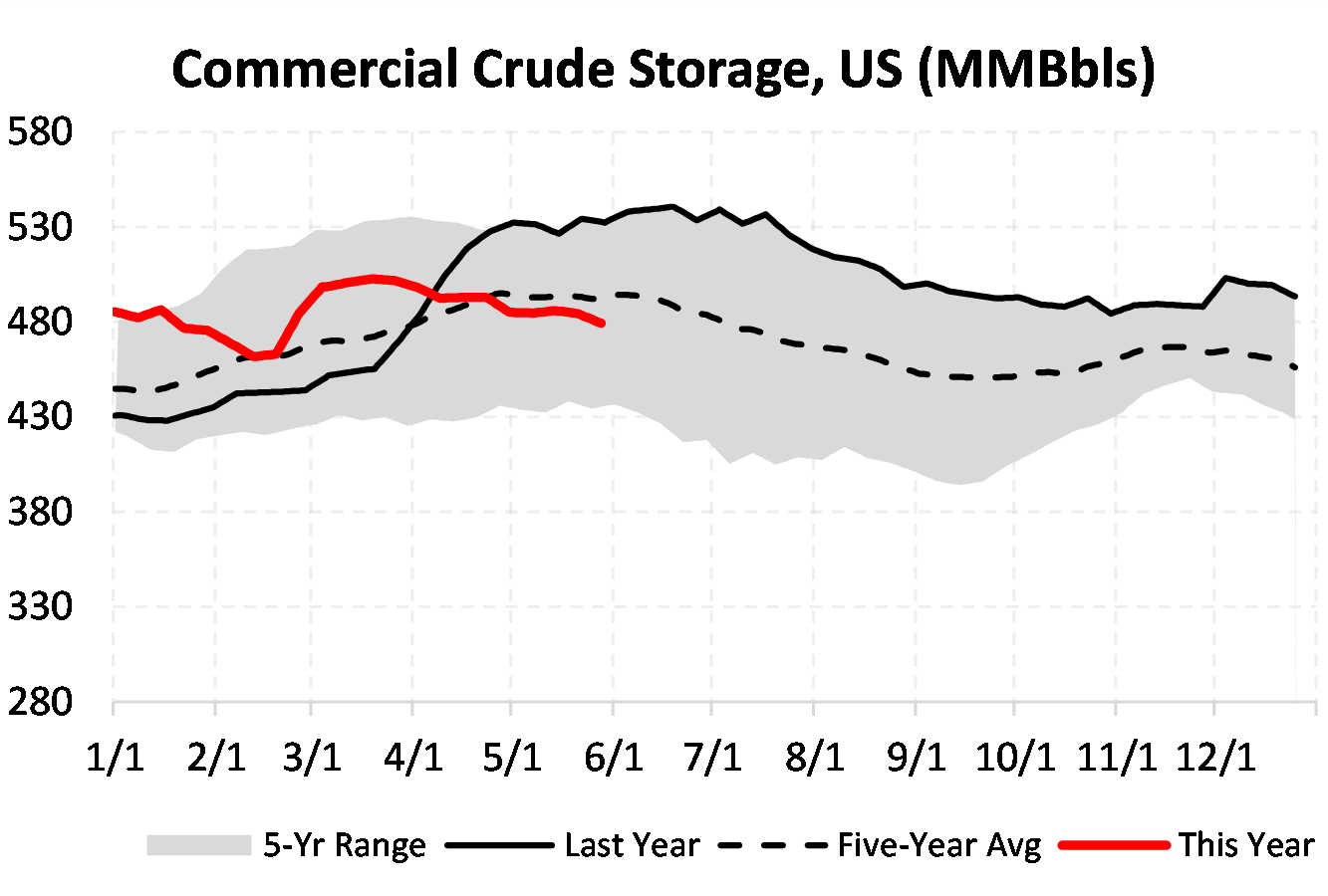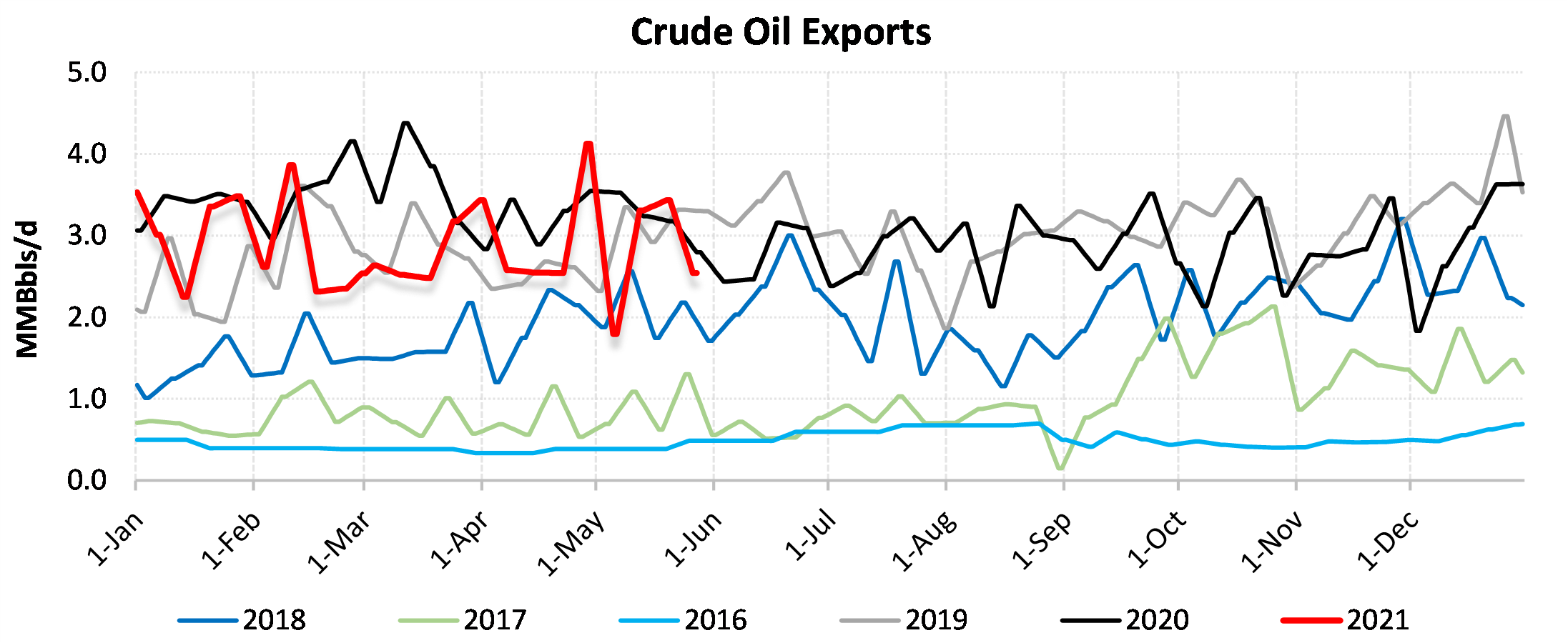 EIA reported a draw of -5079 MBbls in U.S. crude-oil inventories for the week ending 5/28/2021. This was larger than the average estimate of -2409 MBbls as reported by Bloomberg.