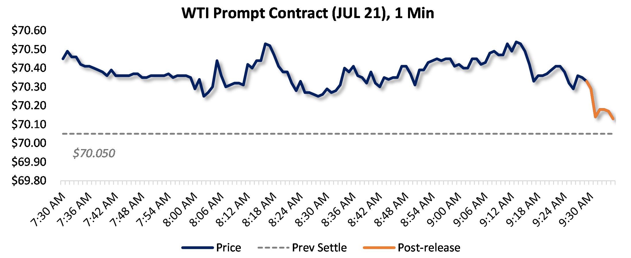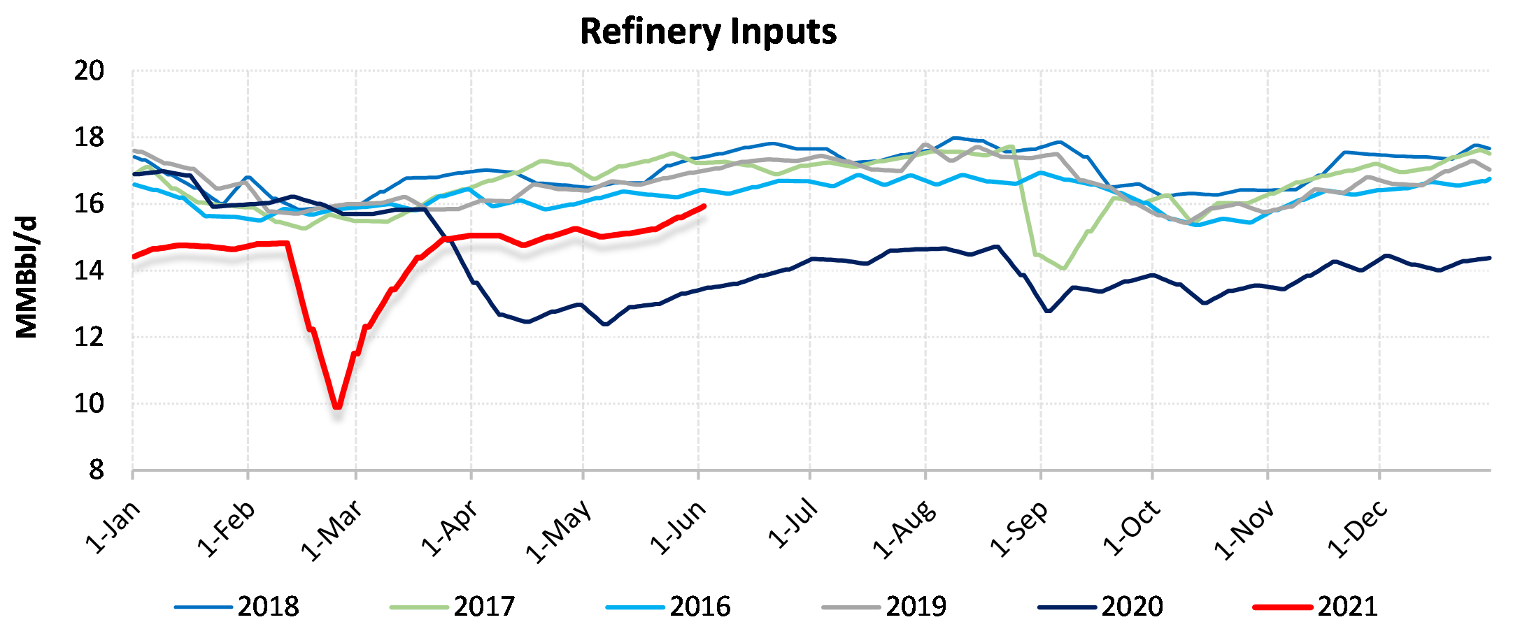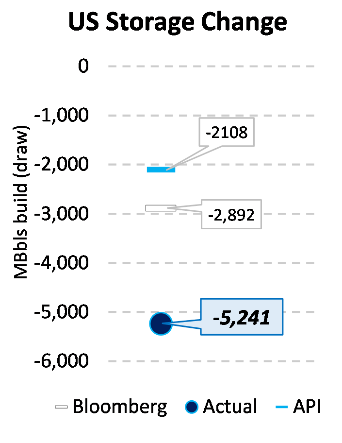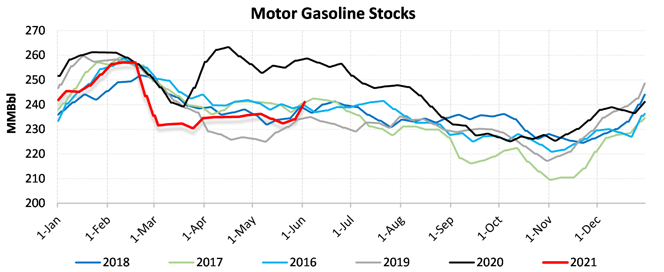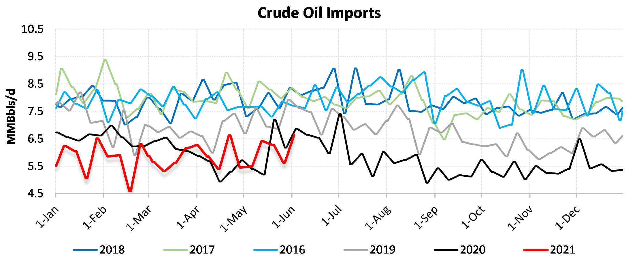 EIA reported a draw of -5241 MBbls in U.S. crude-oil inventories for the week ending 6/4/2021. This was larger than the average estimate of -2892 MBbls as reported by Bloomberg.