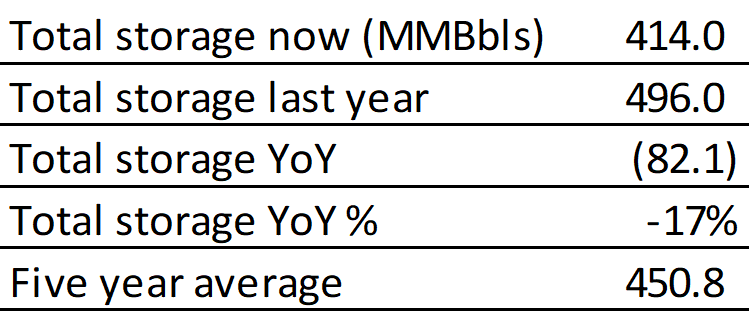 Inventories for the US are now at a deficit of 82.081 MBbls to last year and a deficit of 36.86 MBbls to the five-year average.