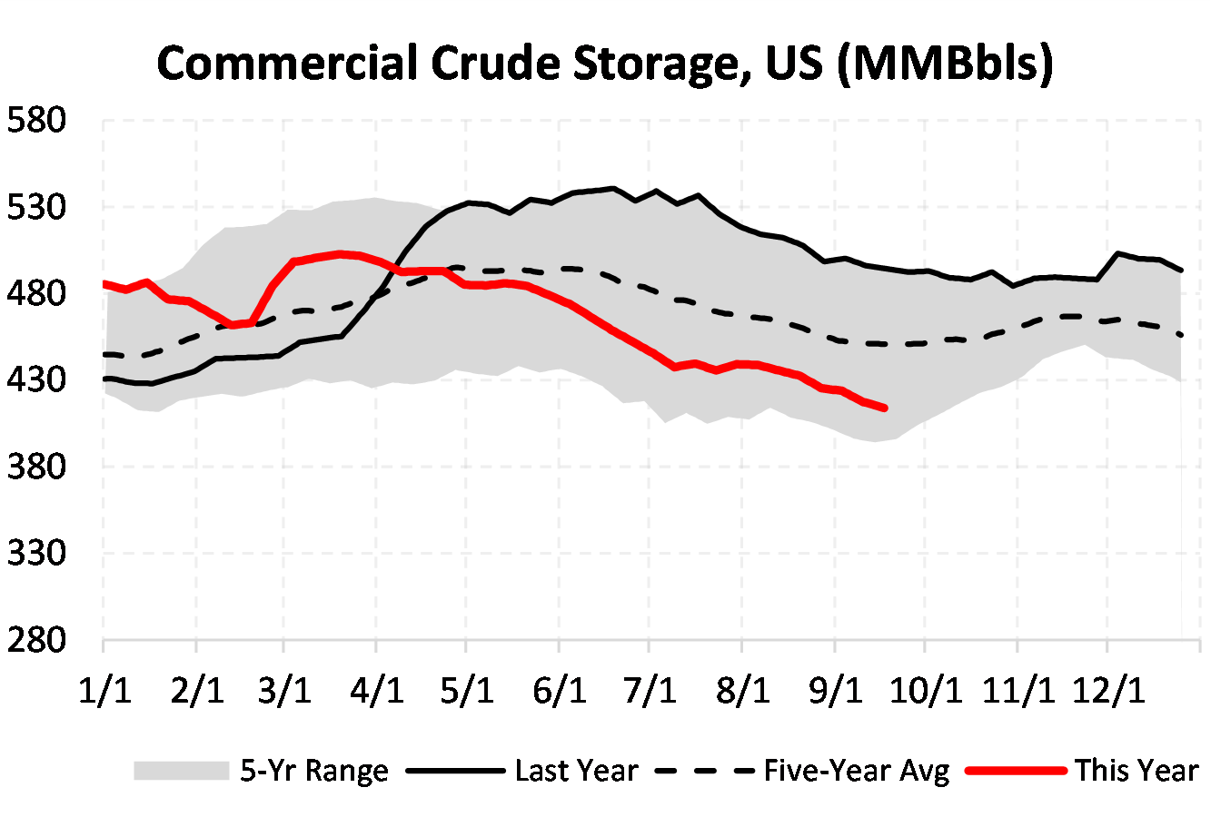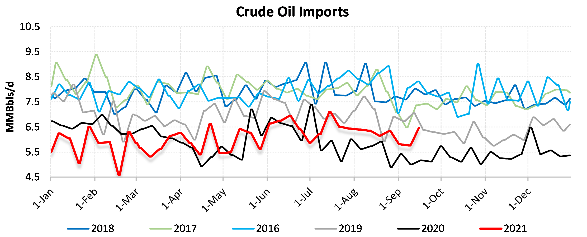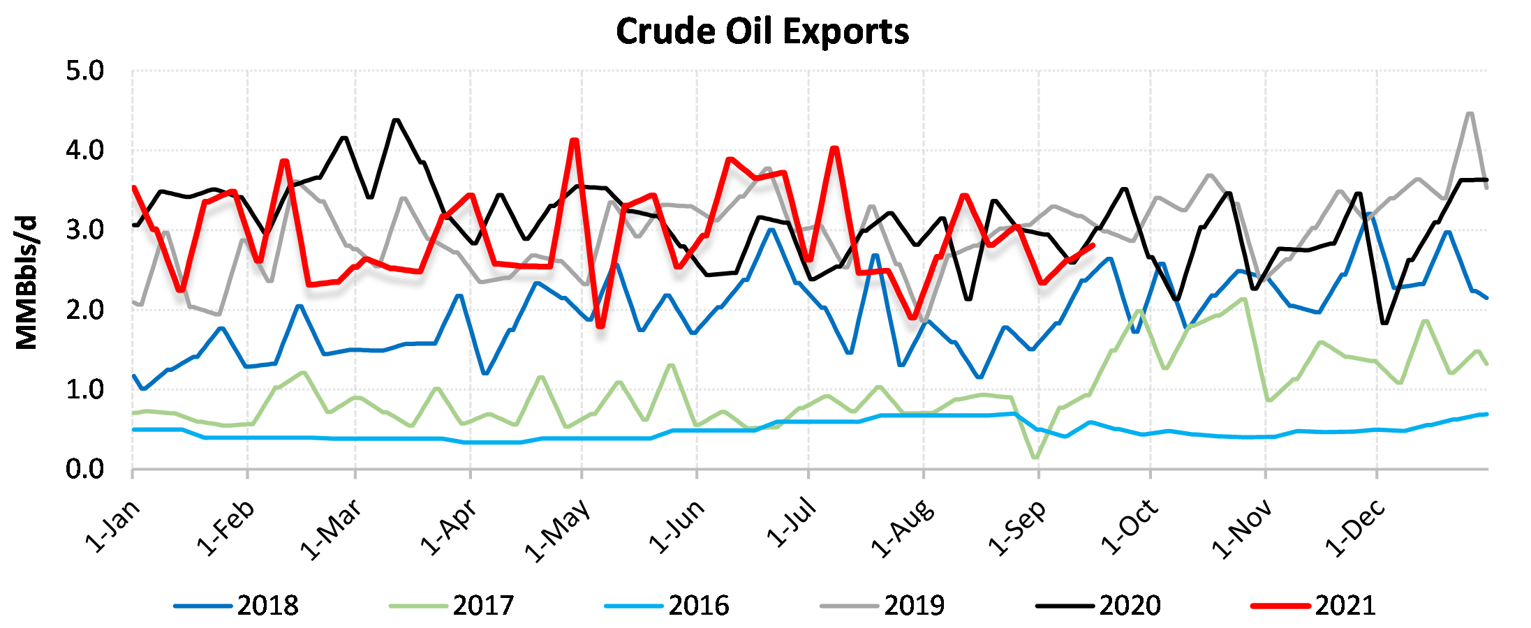 EIA reported a draw of -3481 MBbls in U.S. crude-oil inventories for the week ending 9/17/2021. This was larger than the average estimate of -3016 MBbls as reported by Bloomberg.