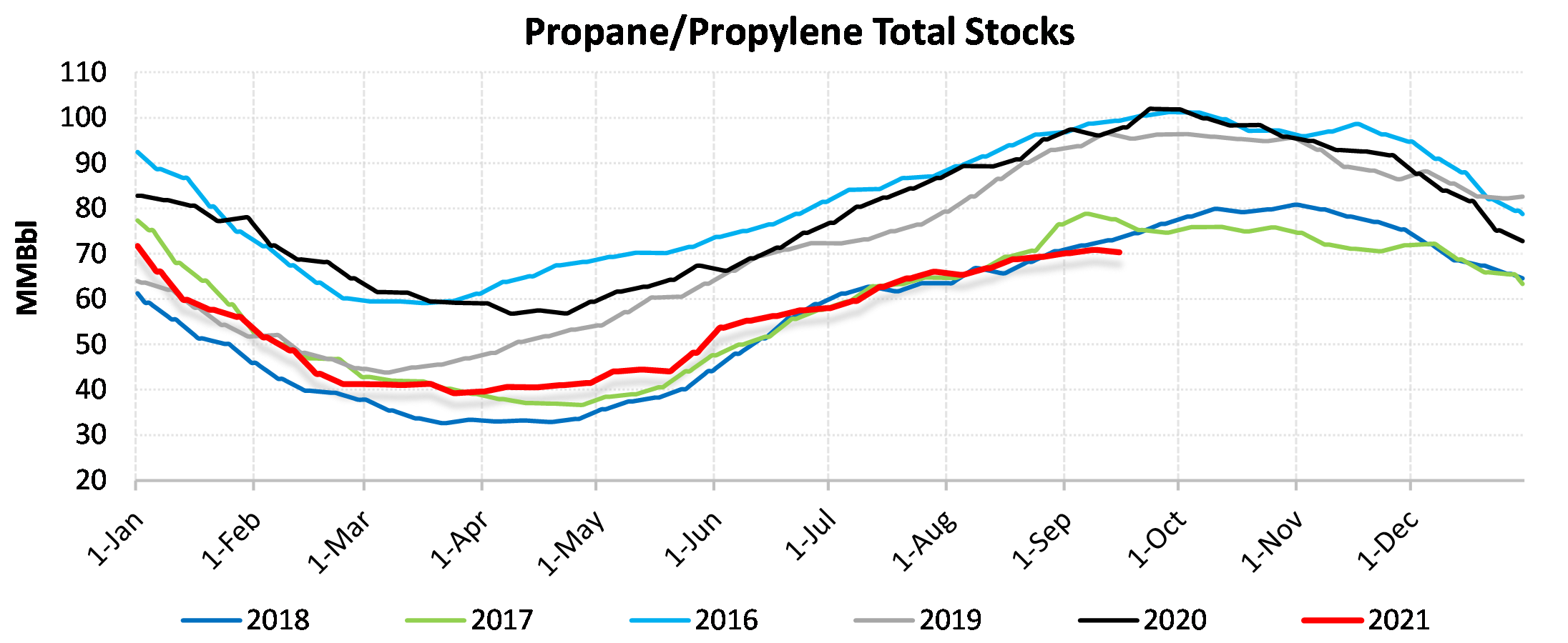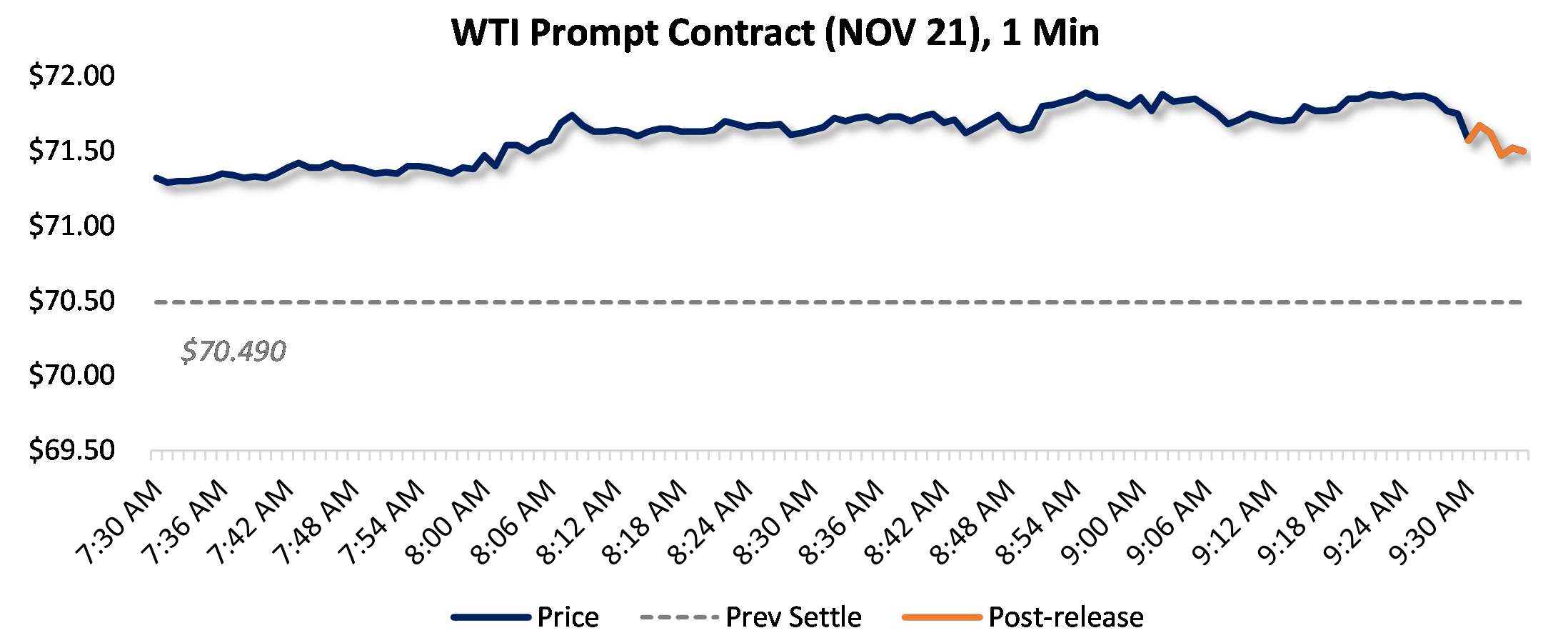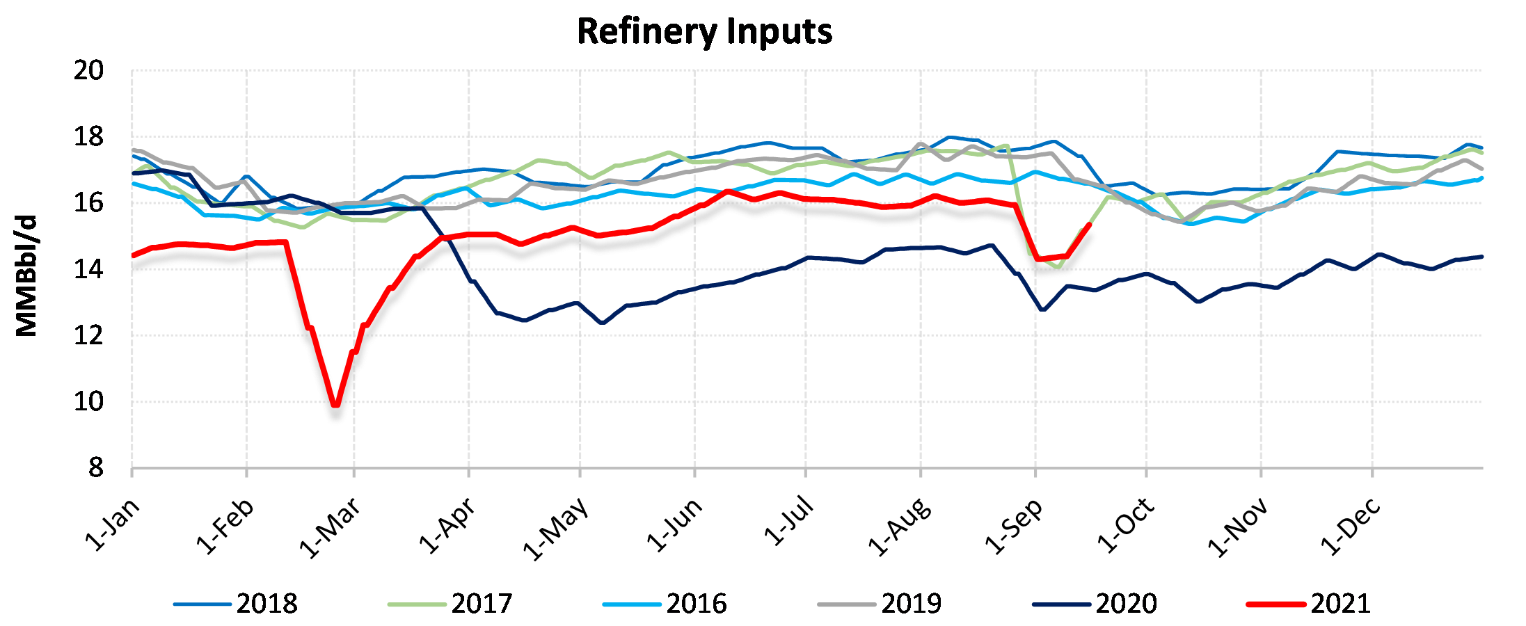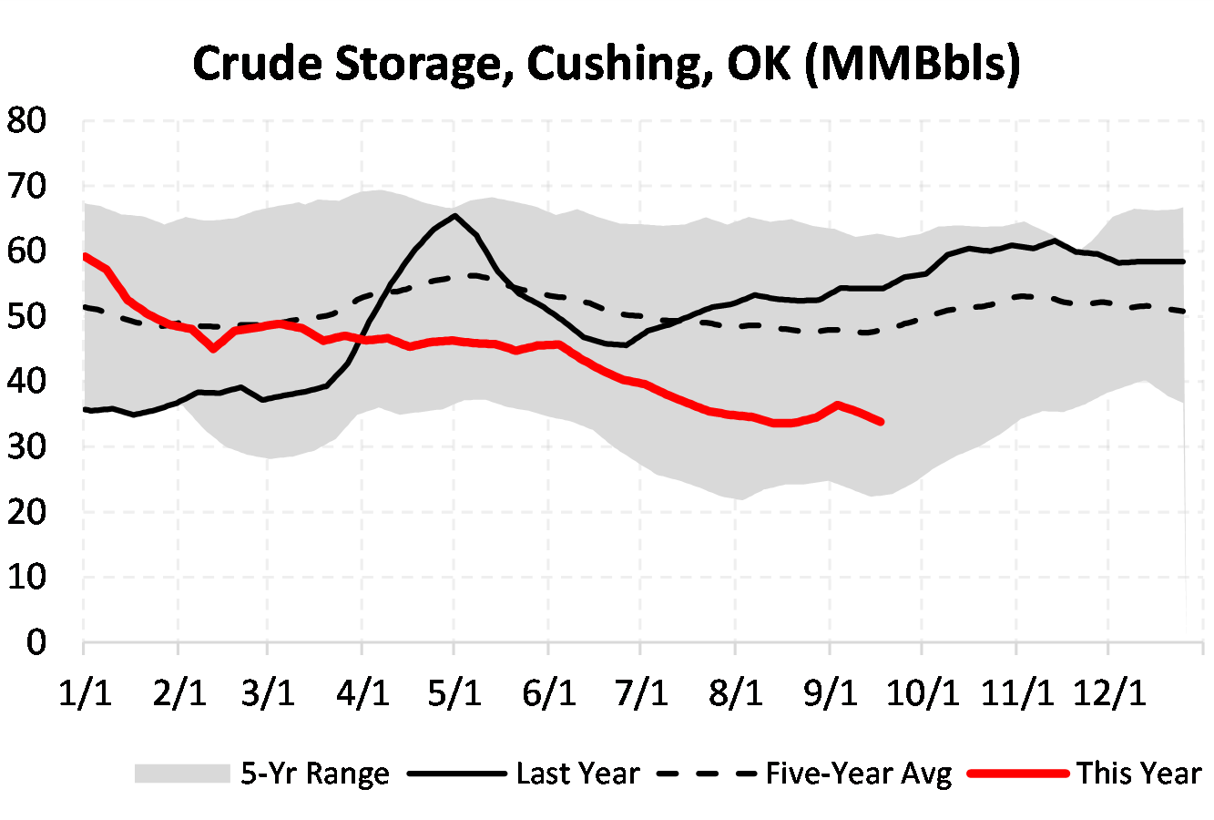 EIA reported a draw of -3481 MBbls in U.S. crude-oil inventories for the week ending 9/17/2021. This was larger than the average estimate of -3016 MBbls as reported by Bloomberg.