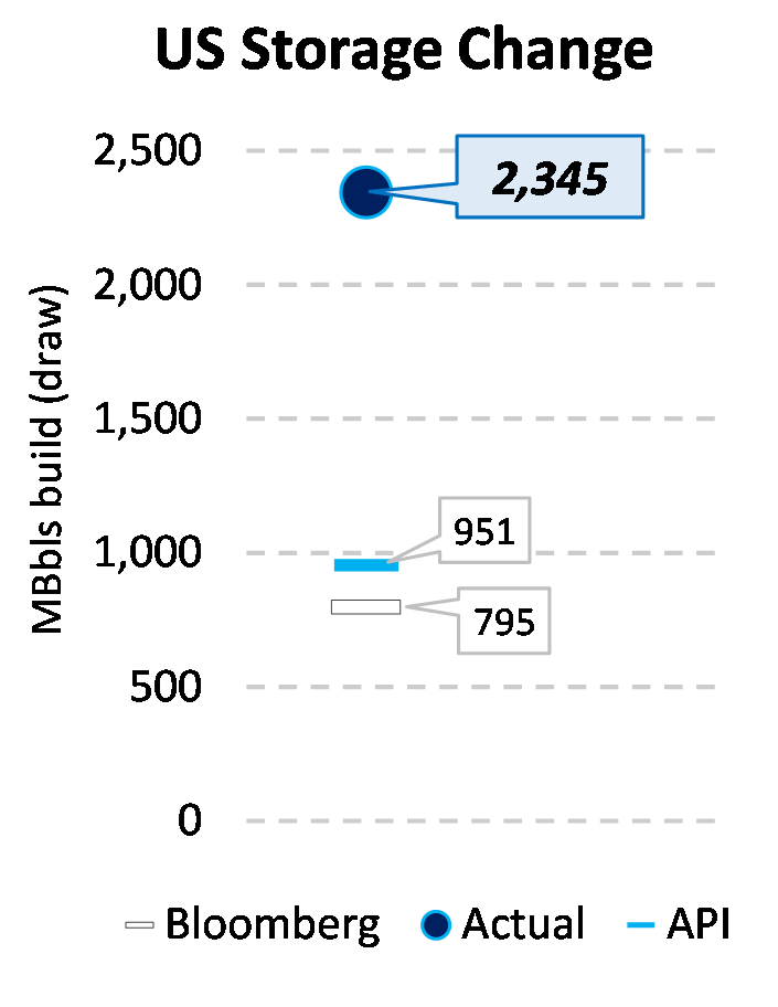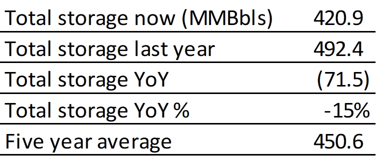 Inventories for the US are now at a deficit of 71.539 MBbls to last year and a deficit of 29.73 MBbls to the five-year average.