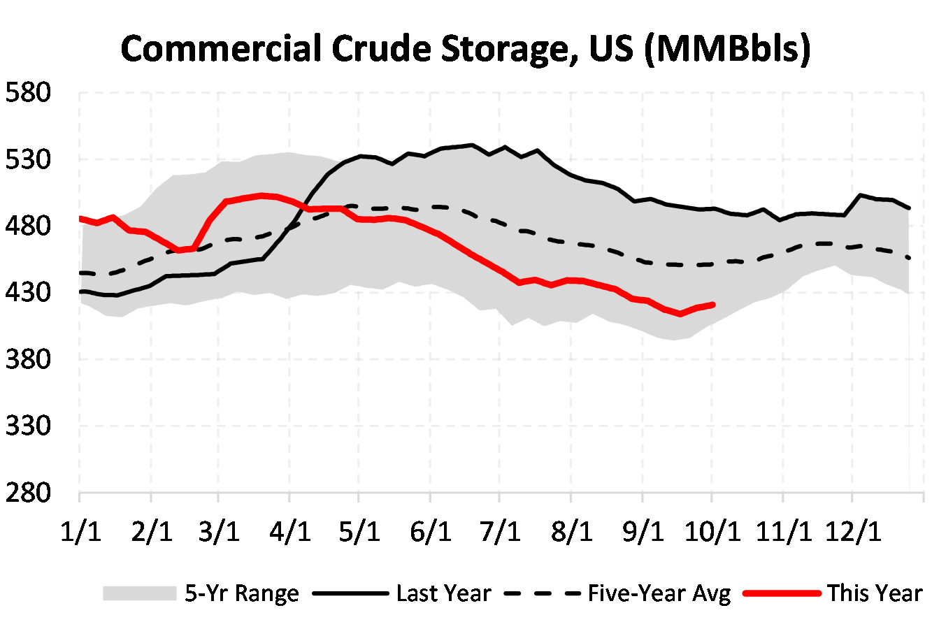 EIA reported a build of 2345 MBbls in U.S. crude-oil inventories for the week ending 10/1/2021. This was larger than the average estimate of 795 MBbls as reported by Bloomberg.