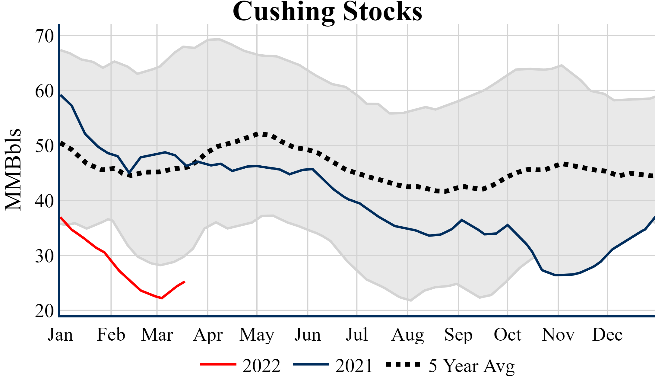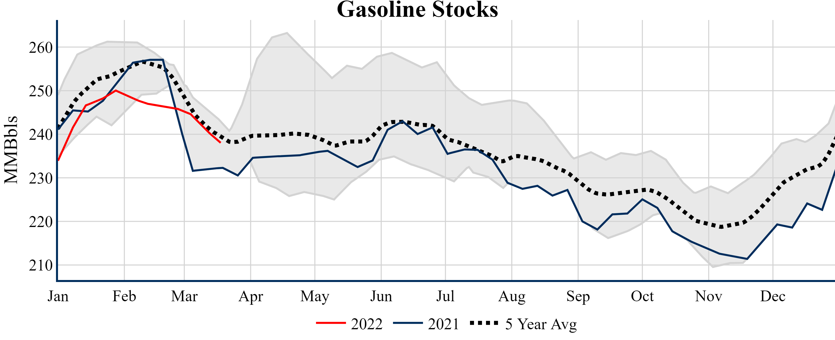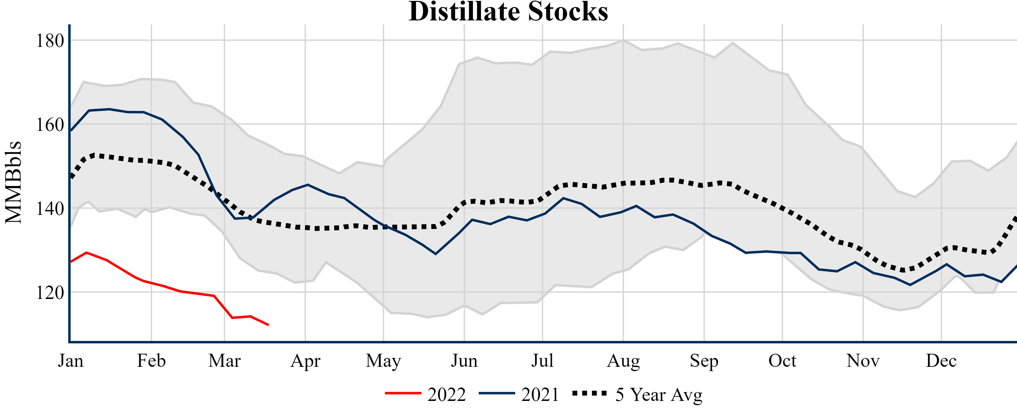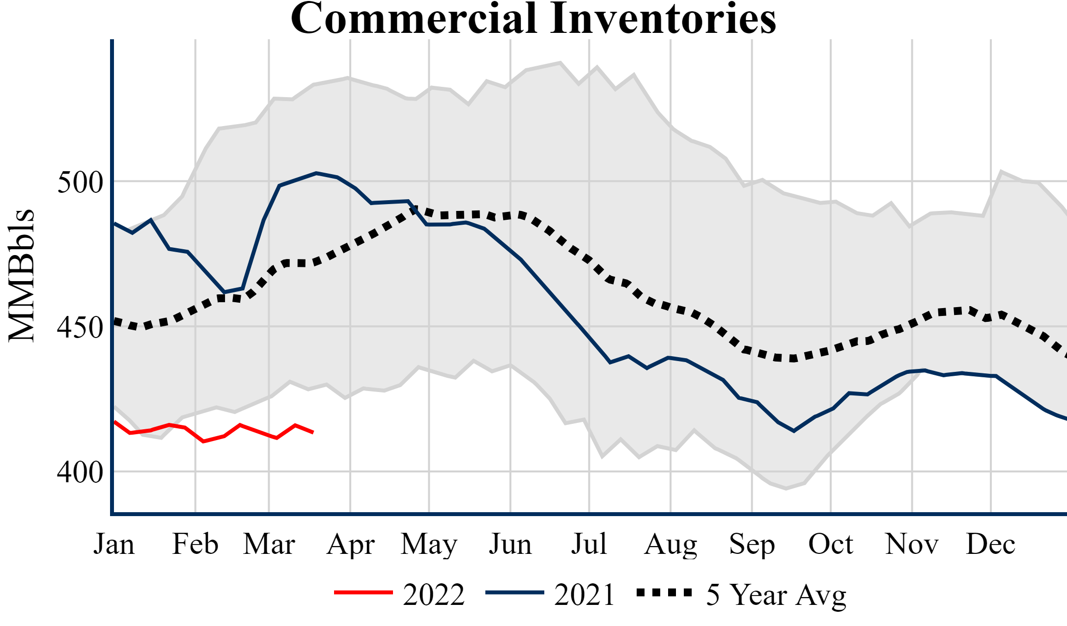 Inventories for the U.S. are now at a deficit of 89.00 MMBbls (-17.7%) to last year, and a deficit of 58.60 MMBbls (-12.4%) to the five-year average.