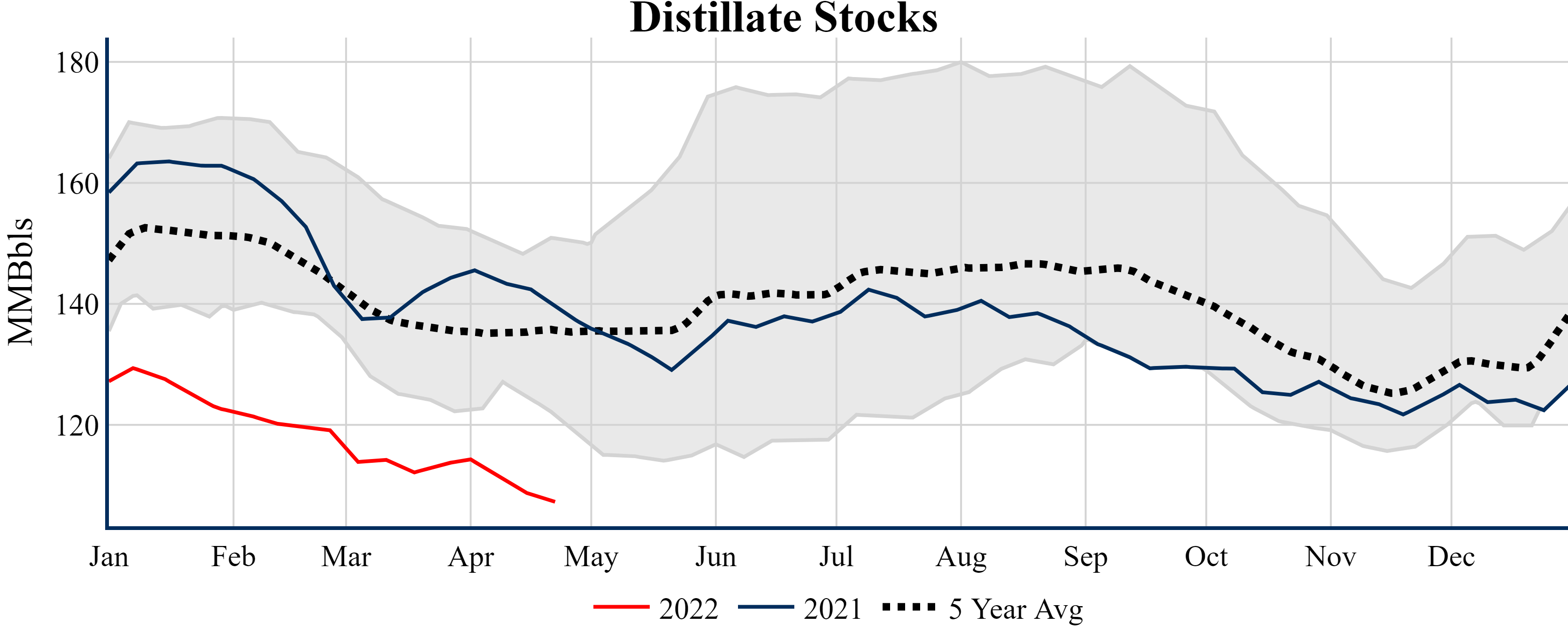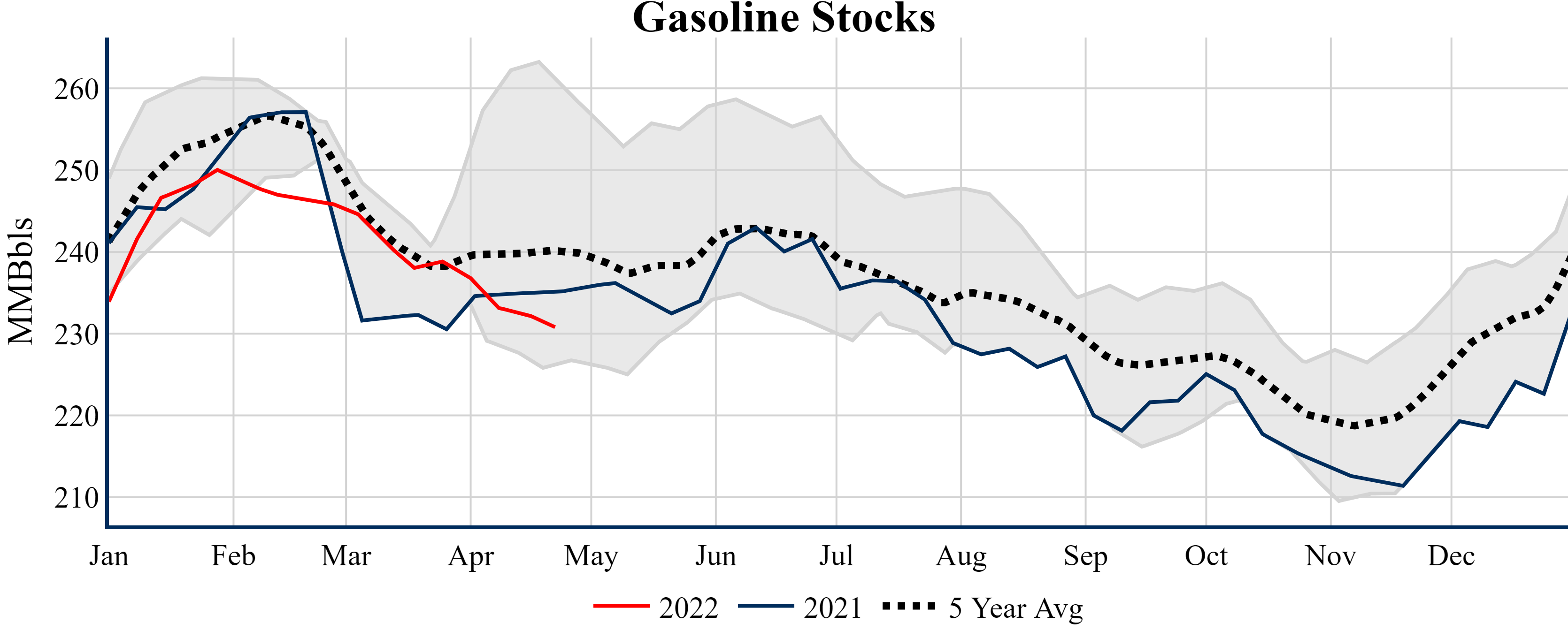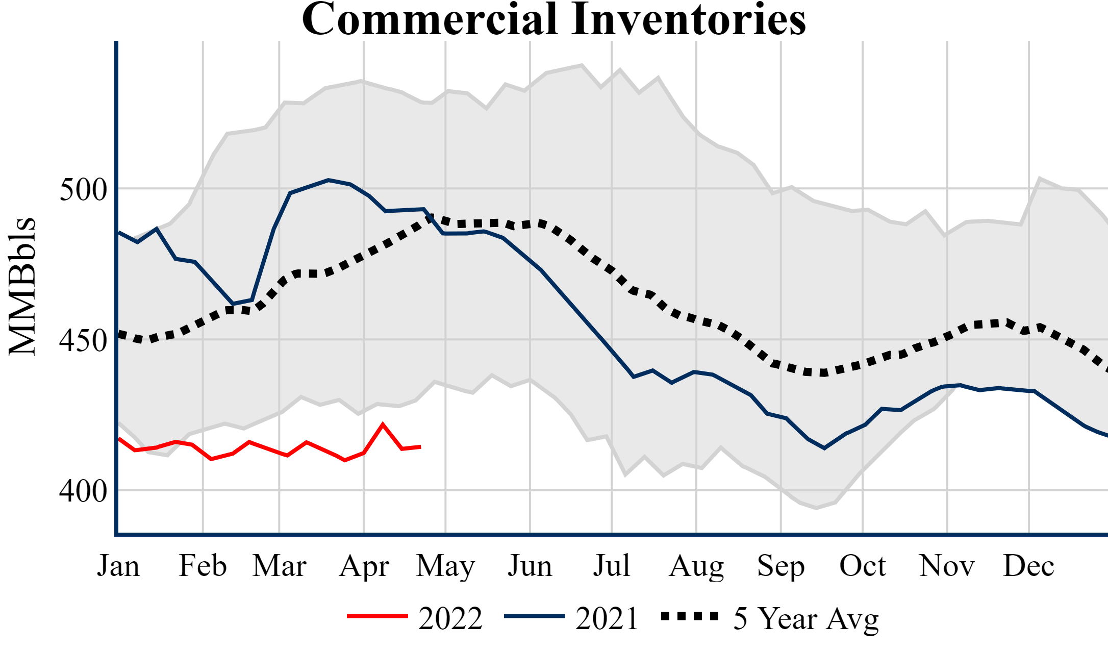 Inventories for the U.S. are now at a deficit of 78.70 MMBbls (-16.0%) to last year, and a deficit of 73.90 MMBbls (-15.1%) to the five-year average.