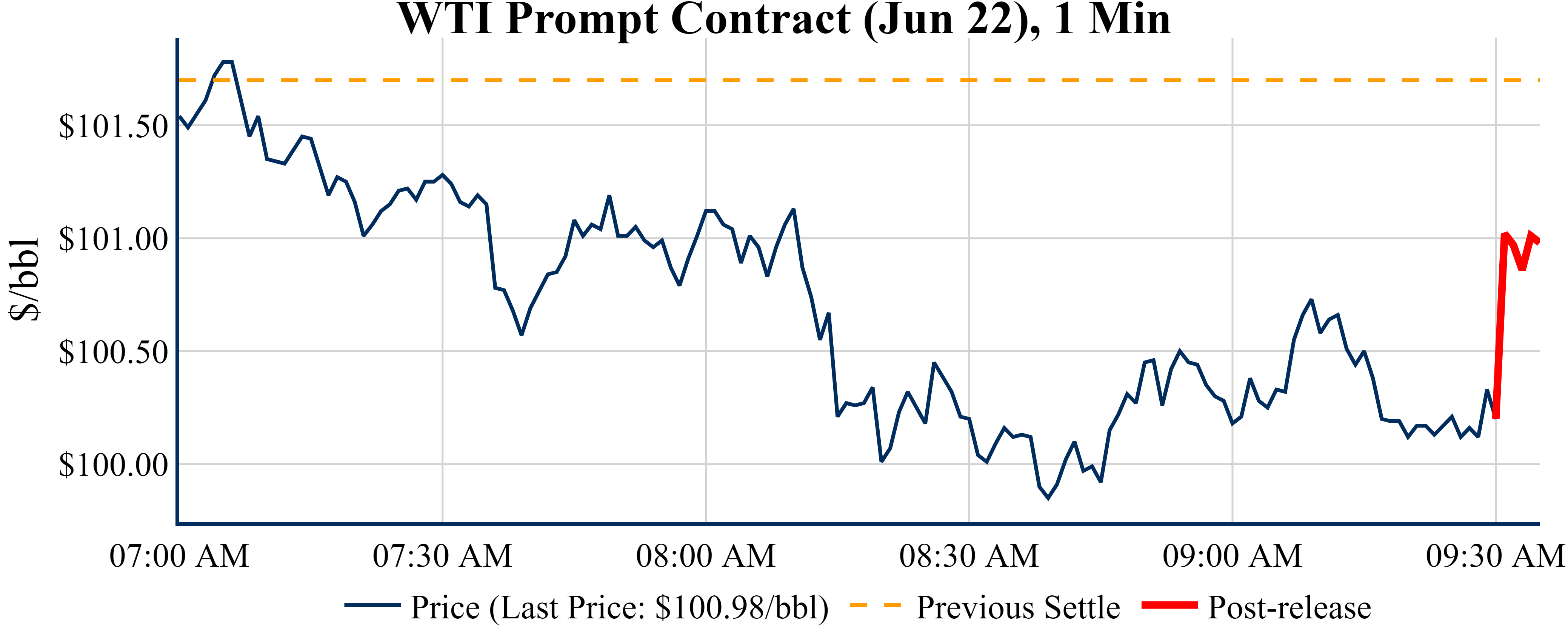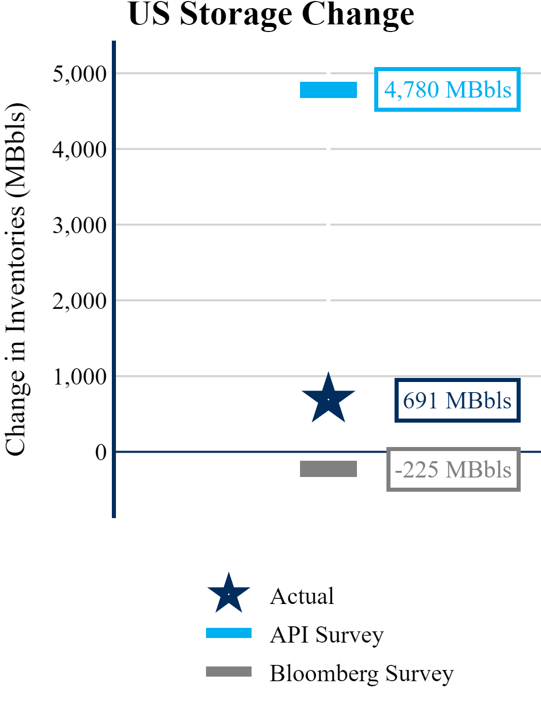 The EIA reported a build of +691 MBbls in U.S. crude-oil inventories. In contrast, the market expected a draw of -225 MBbls as reported by Bloomberg.