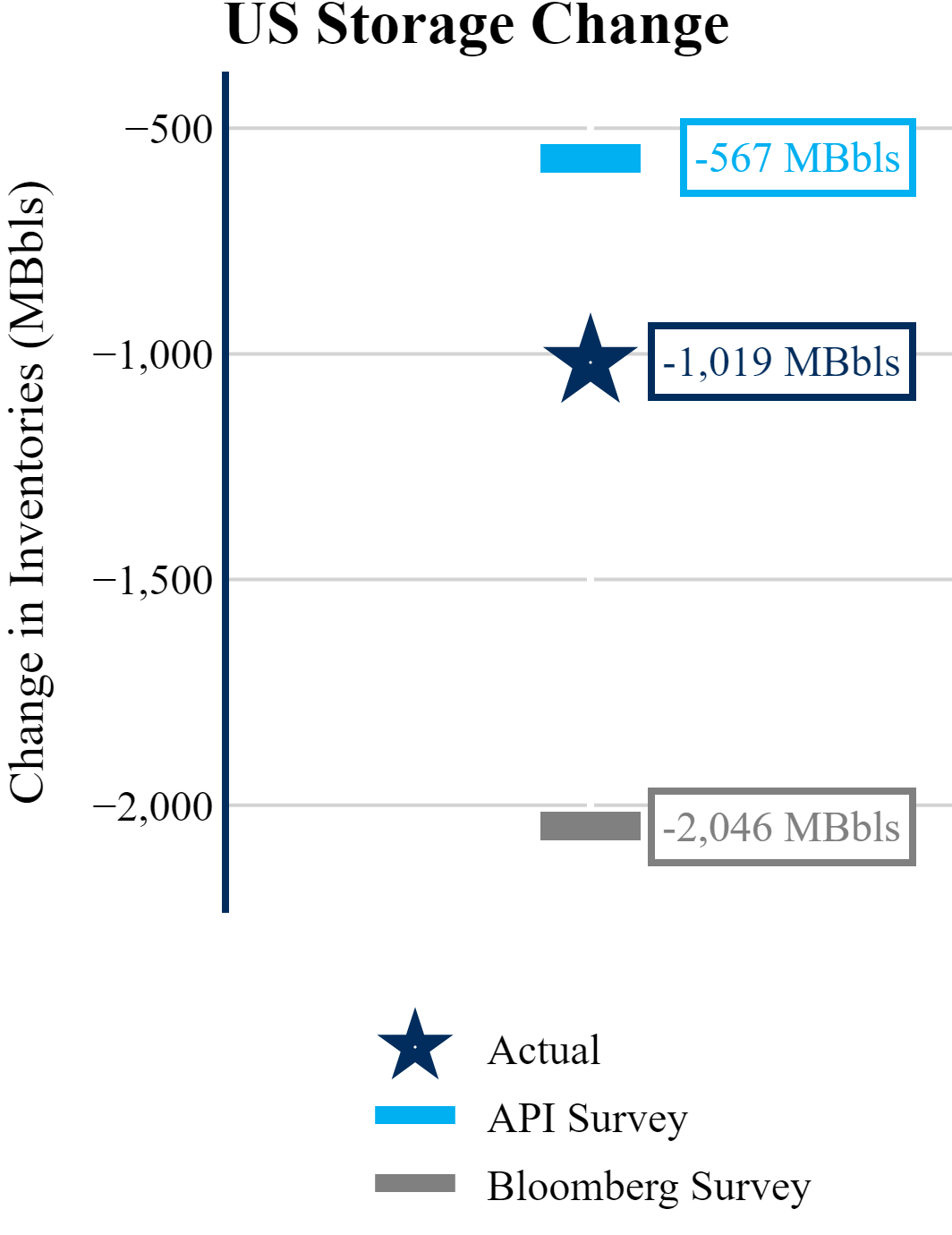 The EIA reported a draw of -1,019 MBbls in U.S. crude-oil inventories. The draw was smaller than the average estimate of -2,046 as reported by Bloomberg.