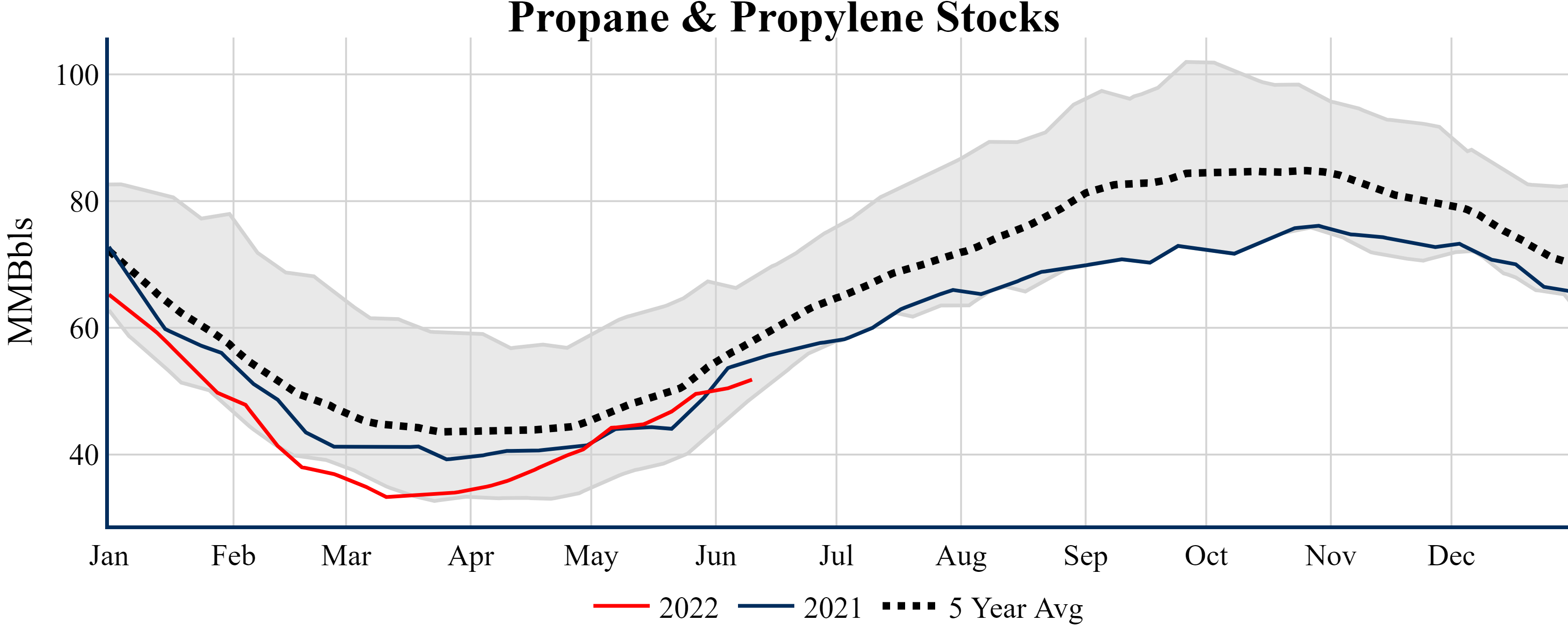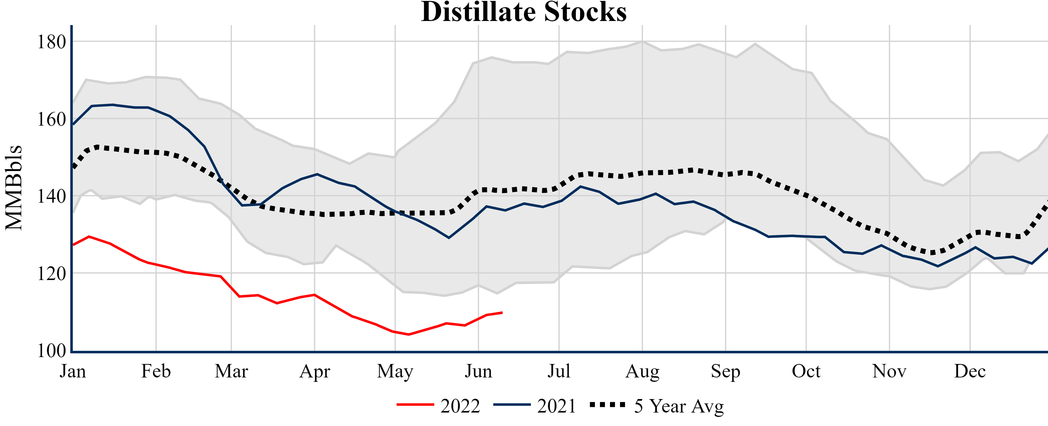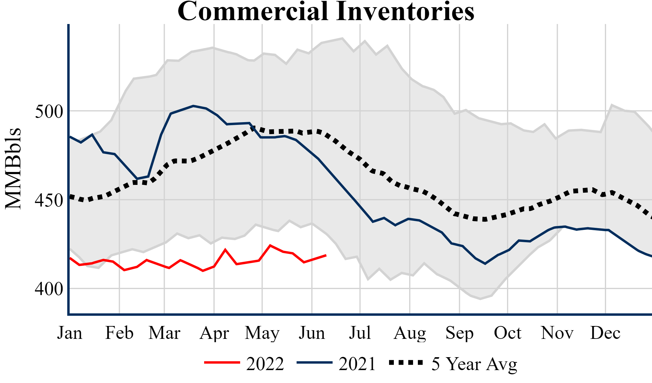 Inventories for the U.S. are now at a deficit of 49.00 MMBbls (-10.5%) to last year, and a deficit of 67.80 MMBbls (-13.9%) to the five-year average.