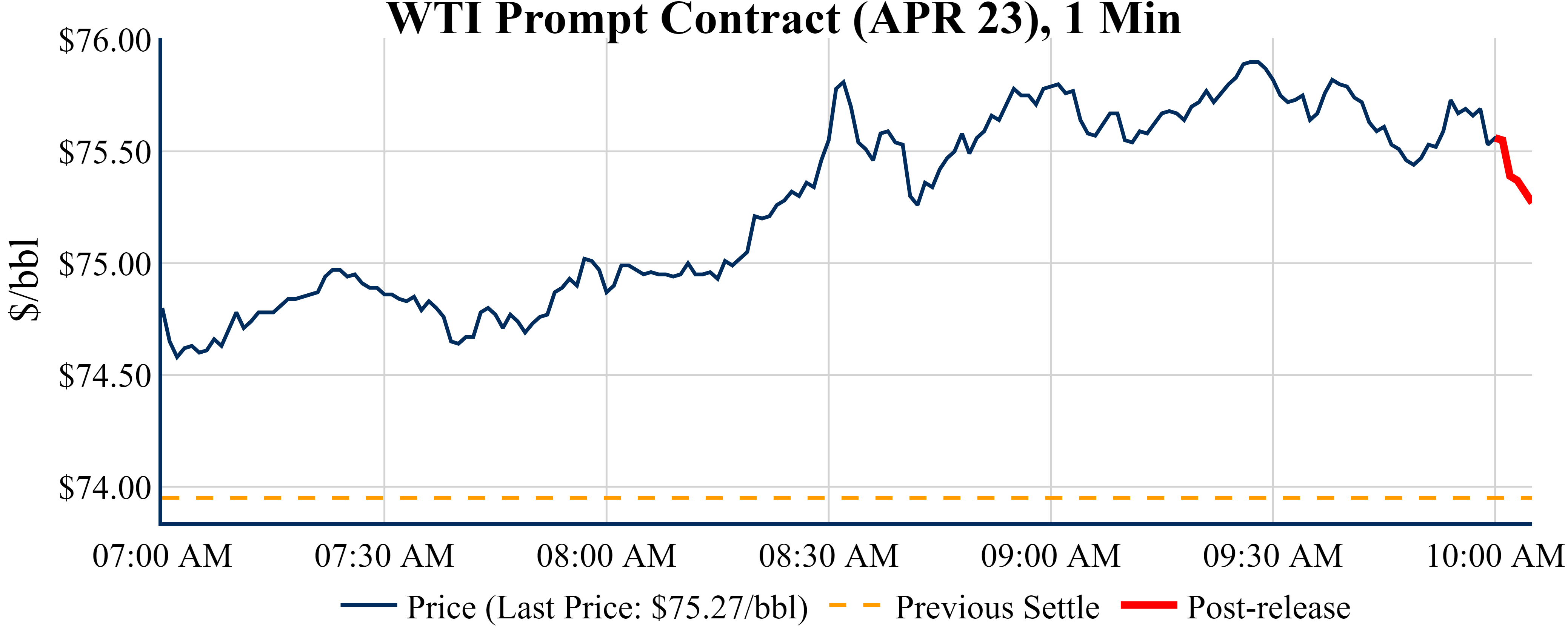 Prices were down in the five minutes following the announcement, to $75.27 from $75.56 just before 10:00 AM.