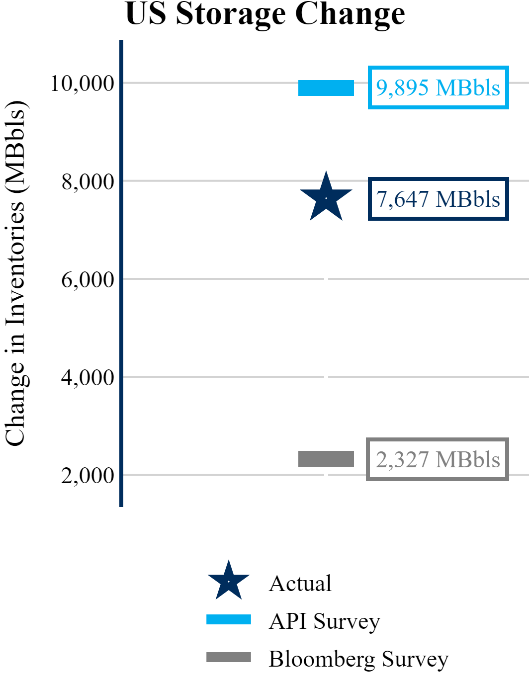 The EIA reported a build of +7,647 MBbls in U.S. crude-oil inventories. The build was larger than the average estimate of +2,327 as reported by Bloomberg.
