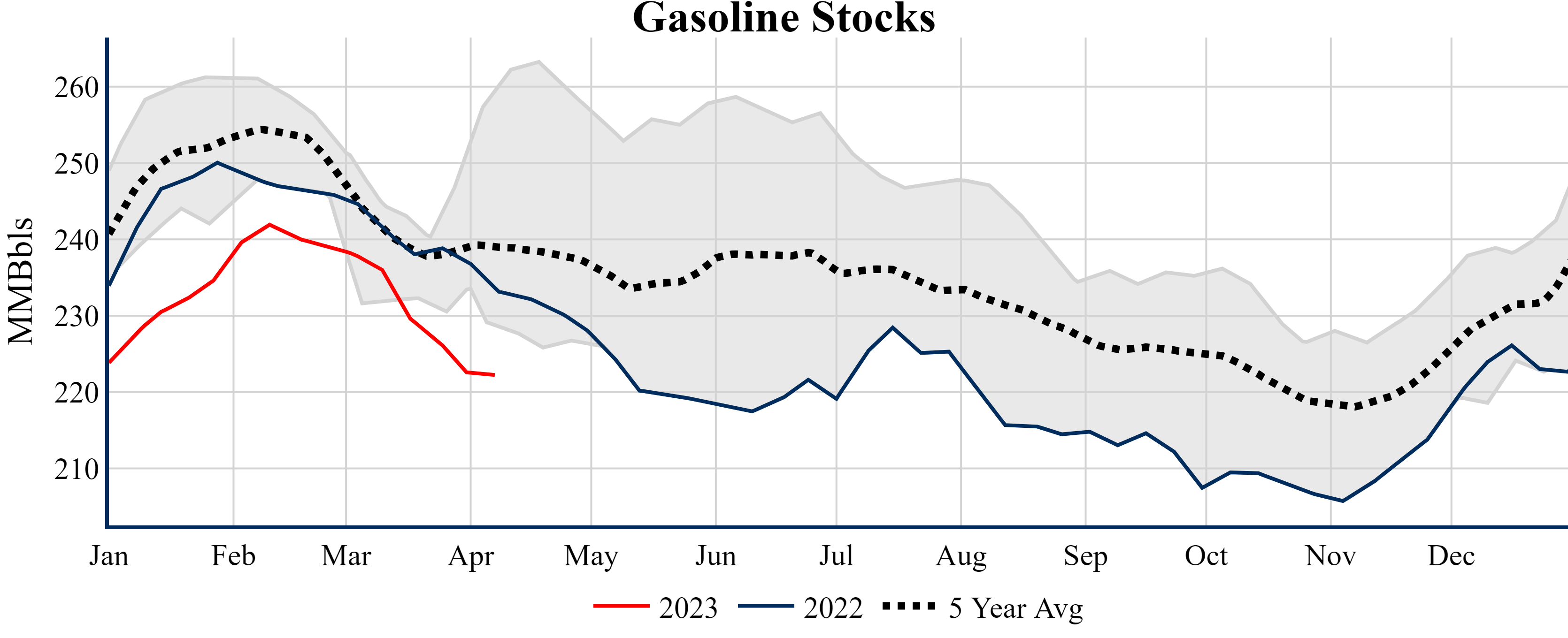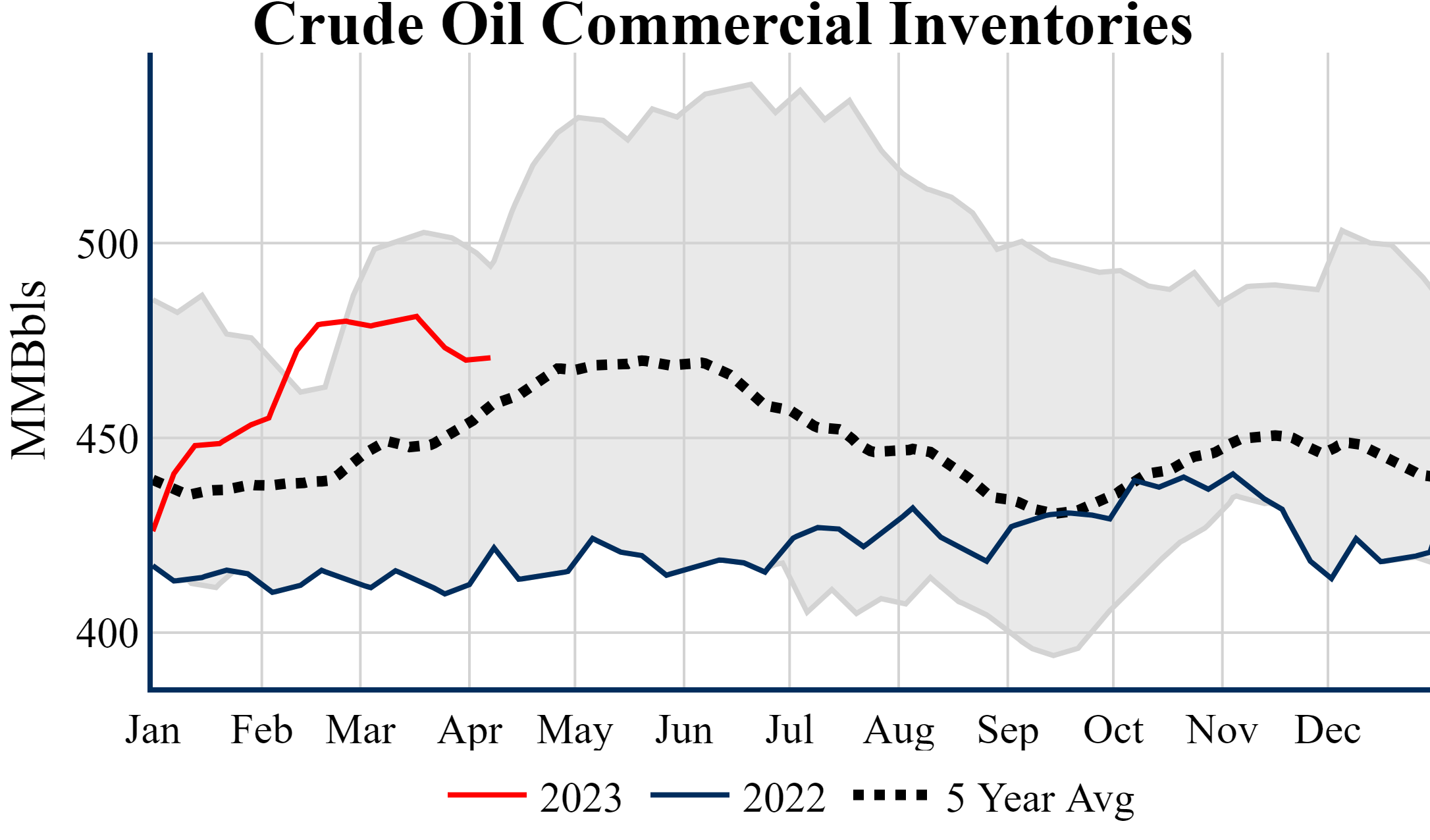 Inventories for the U.S. are now at a surplus of 50.10 MMBbls (11.9%) to last year, and a surplus of 12.20 MMBbls (2.7%) to the five-year average.
