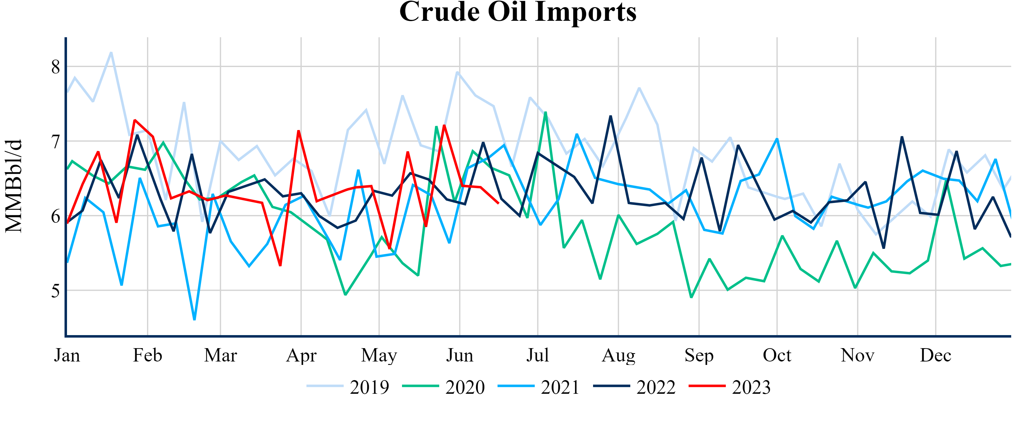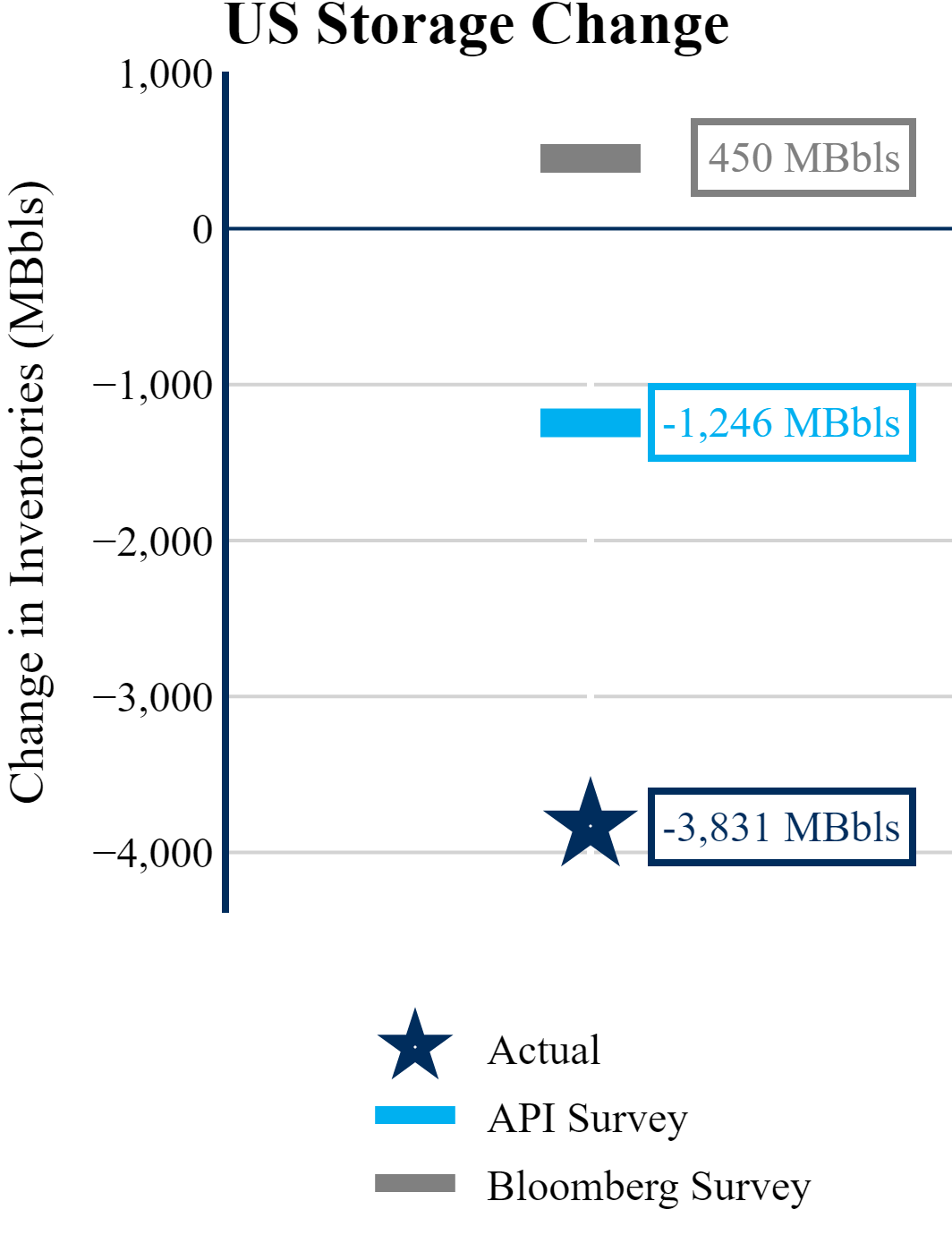 The EIA reported a draw of -3,831 MBbls in U.S. crude-oil inventories. In contrast, the market expected a build of +450 MBbls as reported by Bloomberg.