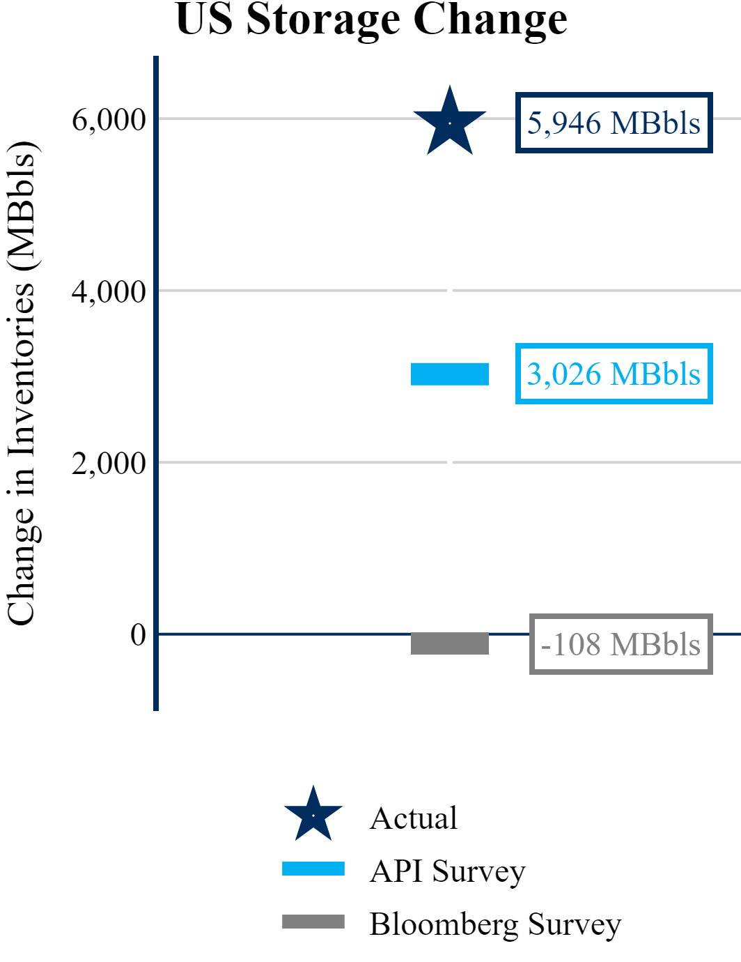 The EIA reported a build of +5,946 MBbls in U.S. crude-oil inventories. In contrast, the market expected a draw of -108 MBbls as reported by Bloomberg.
