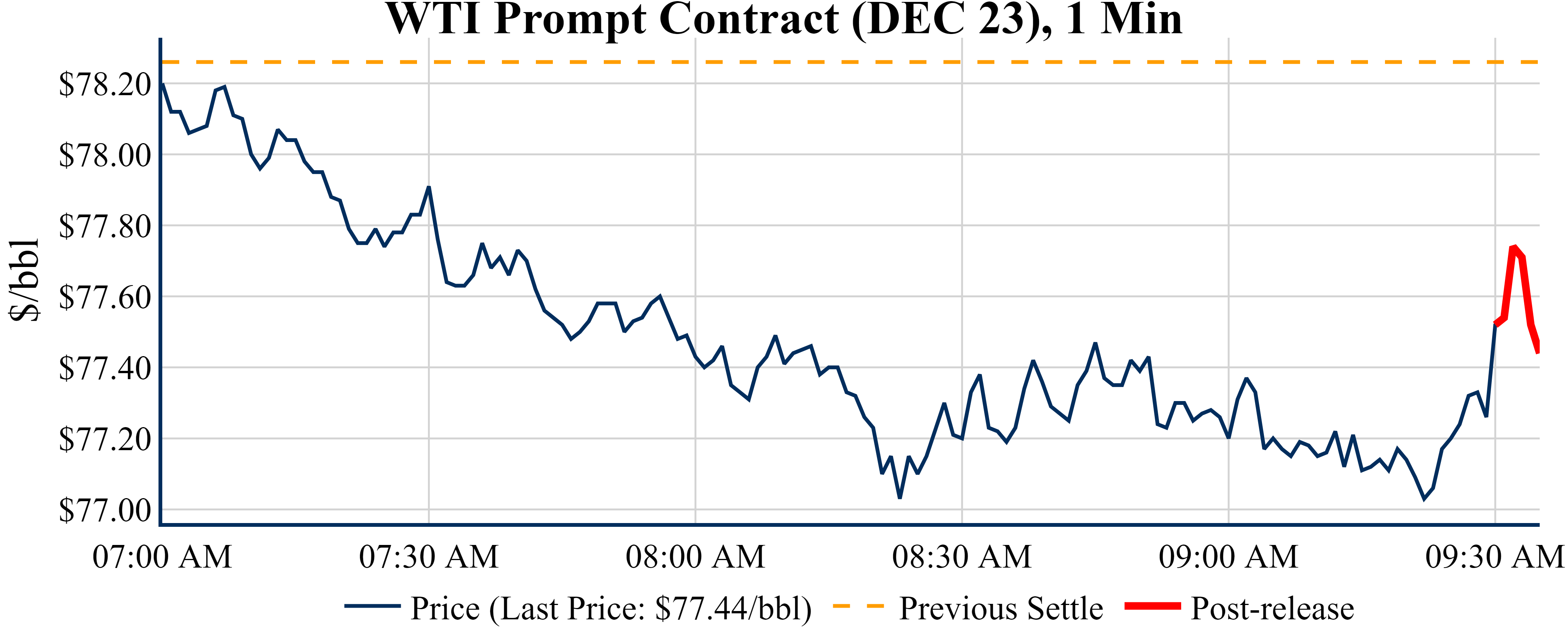 Prices were down in the five minutes following the announcement, to $77.44 from $77.52 just before 09:30 AM.