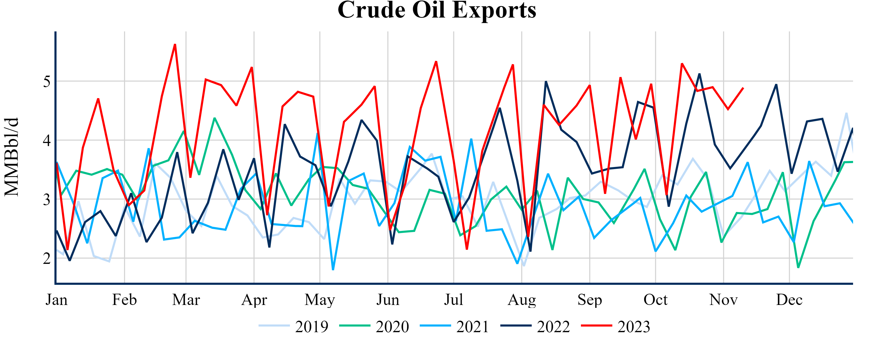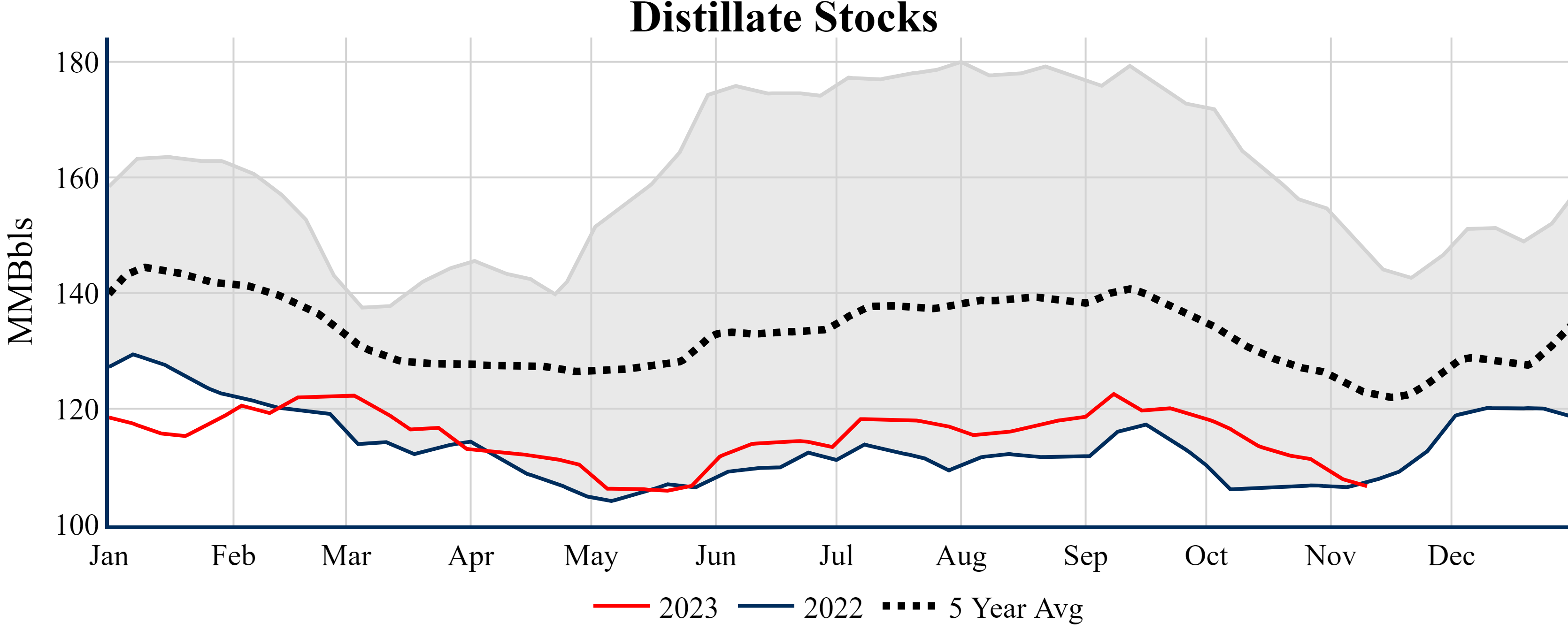 Inventories for the U.S. are now at a surplus of 3.30 MMBbls (0.8%) to last year, and a deficit of 10.80 MMBbls (-2.4%) to the five-year average.