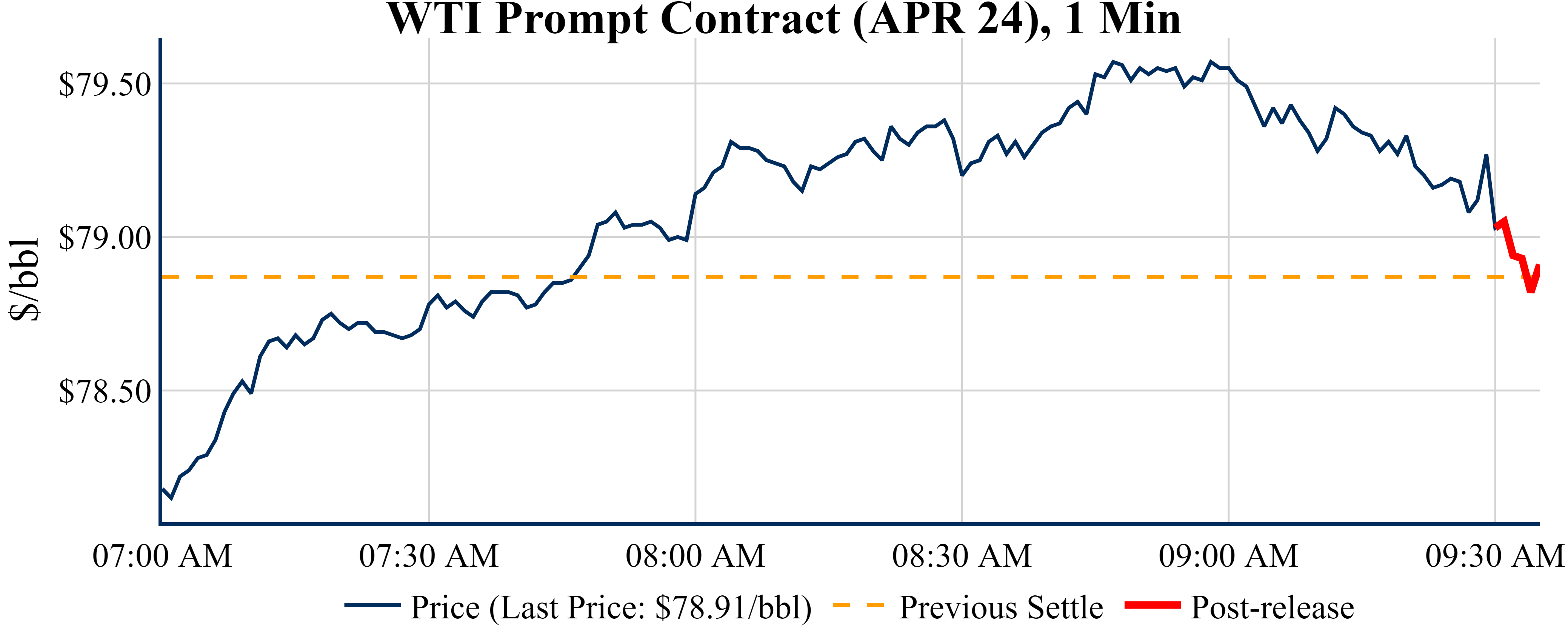 The EIA reported a build of +4,199 MBbls in U.S. crude-oil inventories. The build was larger than the average estimate of +2,563 as reported by Bloomberg.