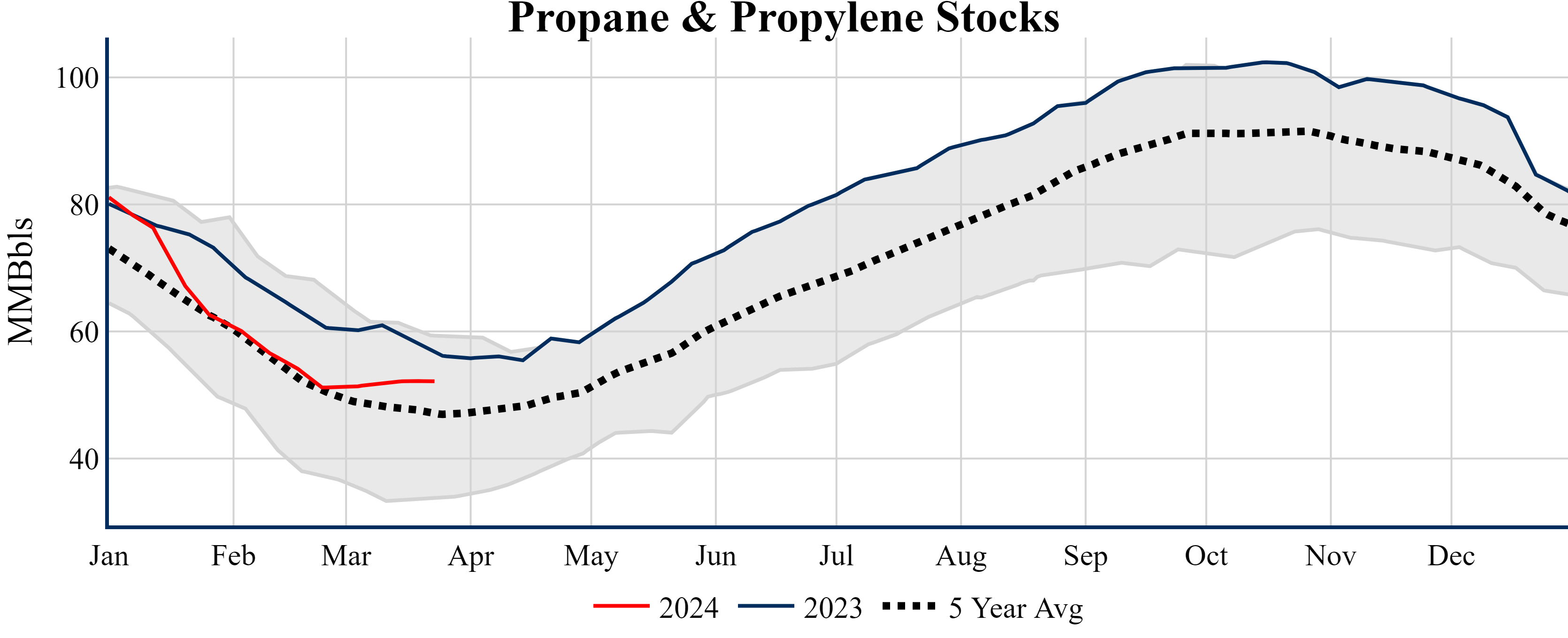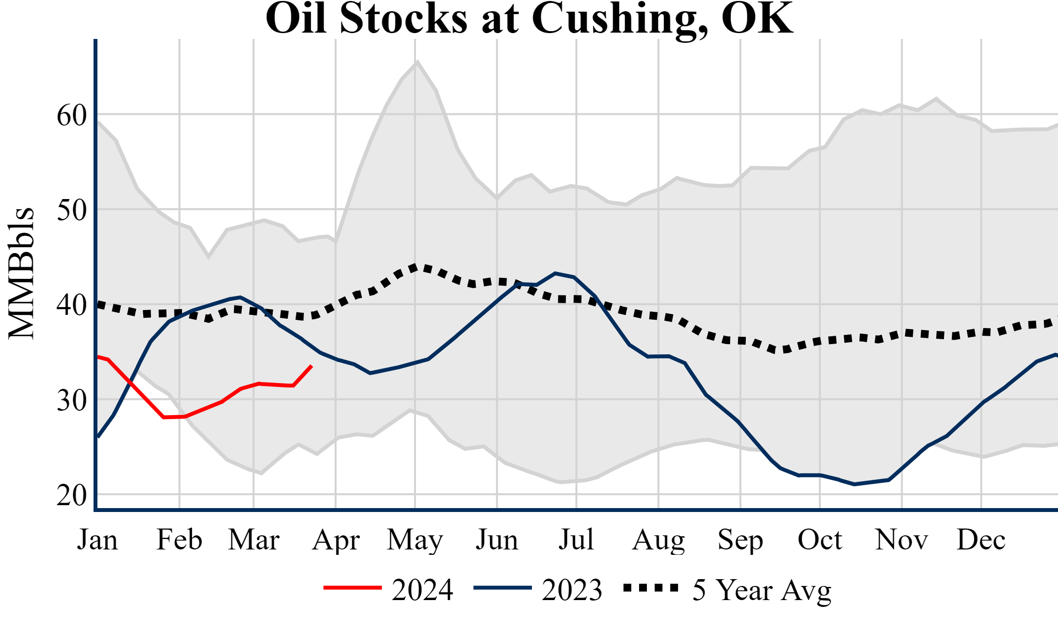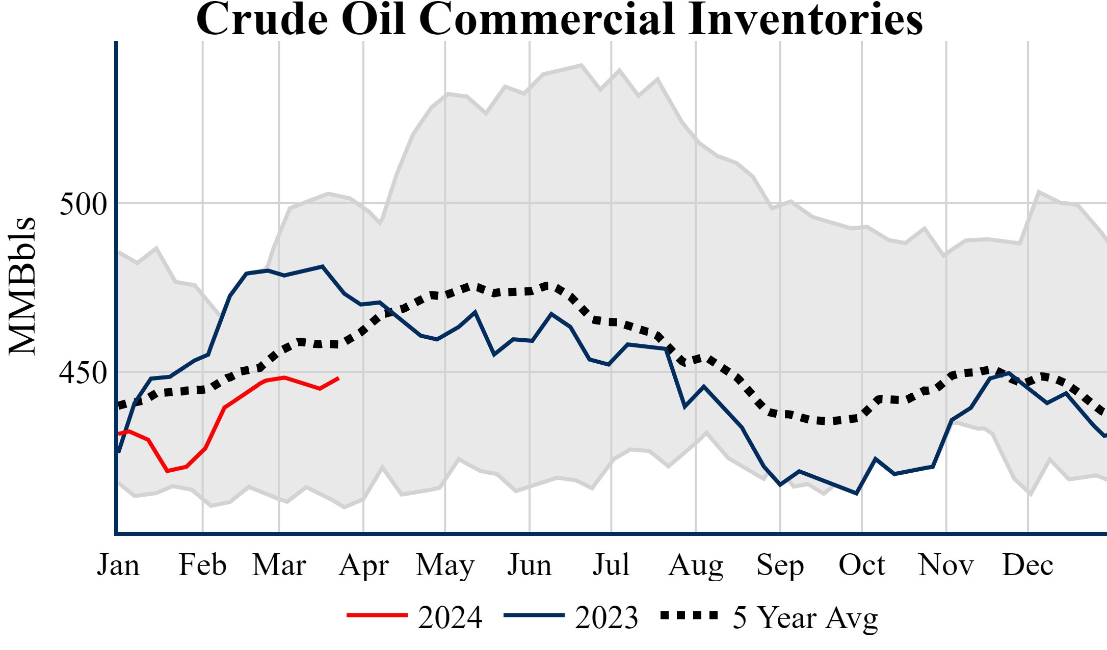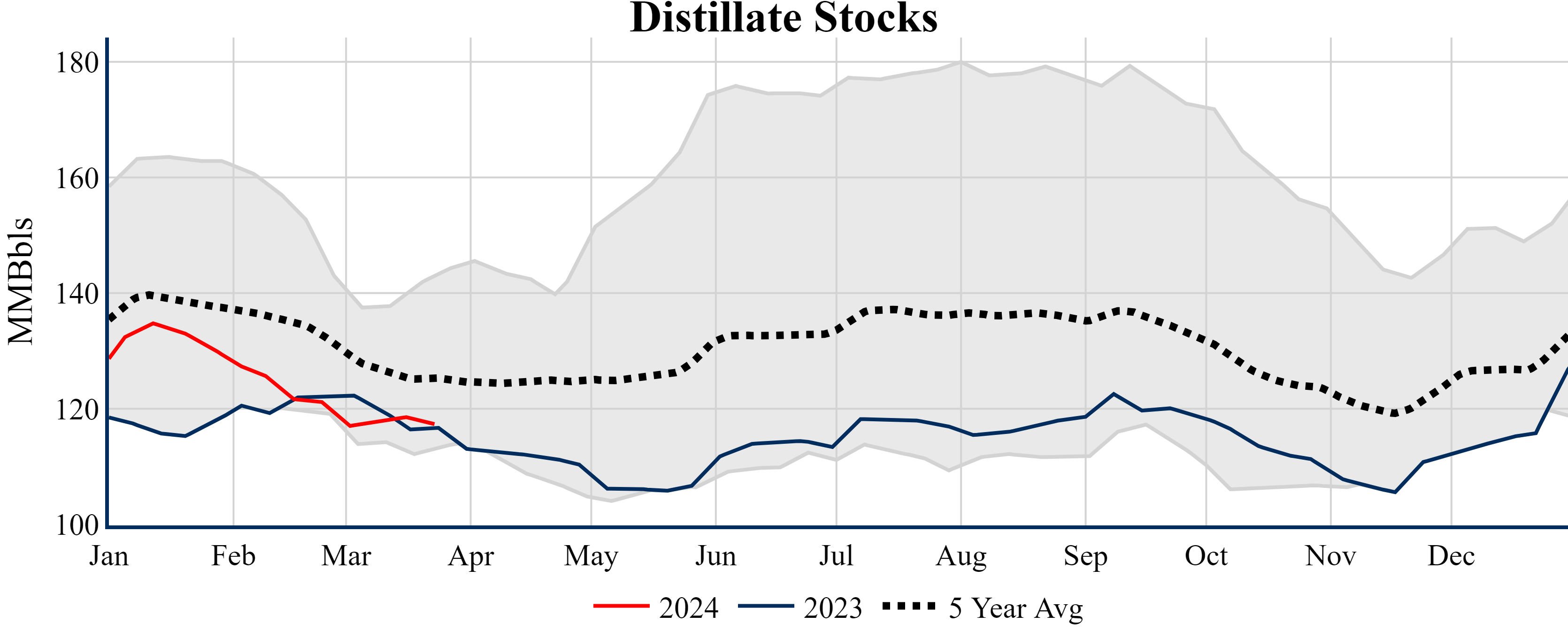 Inventories for the U.S. are now at a deficit of 26.60 MMBbls (-5.6%) to last year, and a deficit of 9.90 MMBbls (-2.2%) to the five-year average.