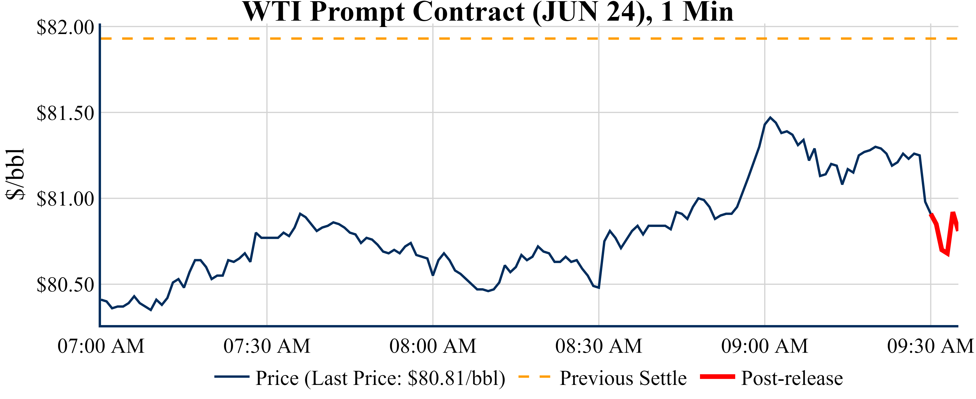 Prices were down in the five minutes following the announcement, to $80.81 from $80.91 just before 09:30 AM.