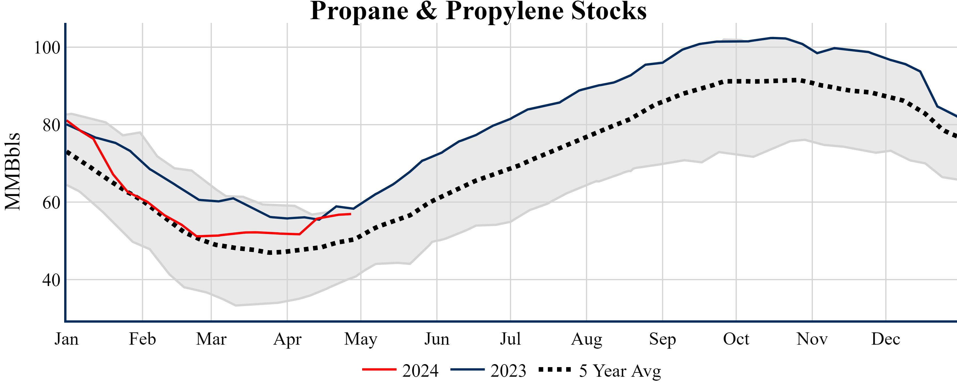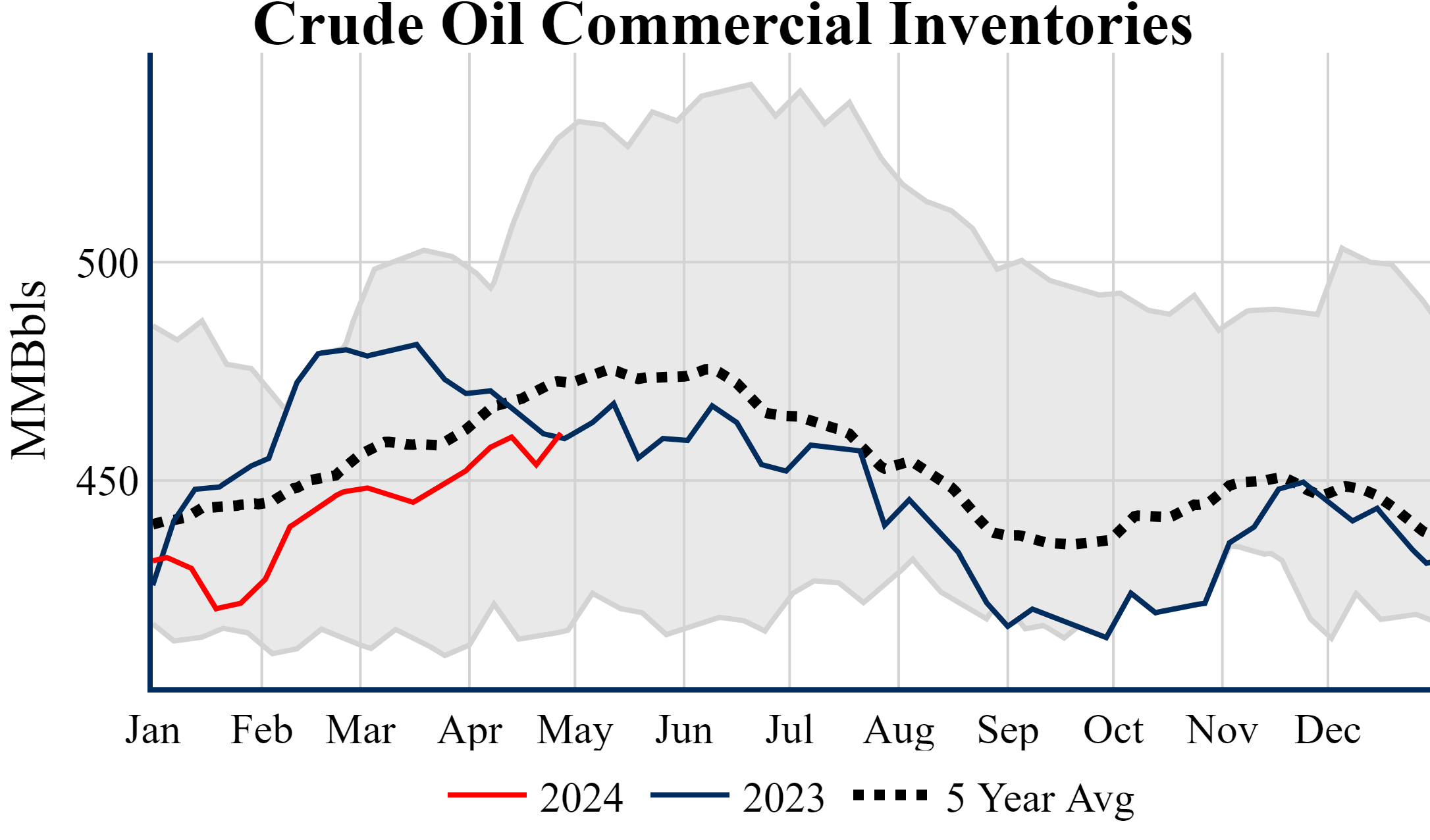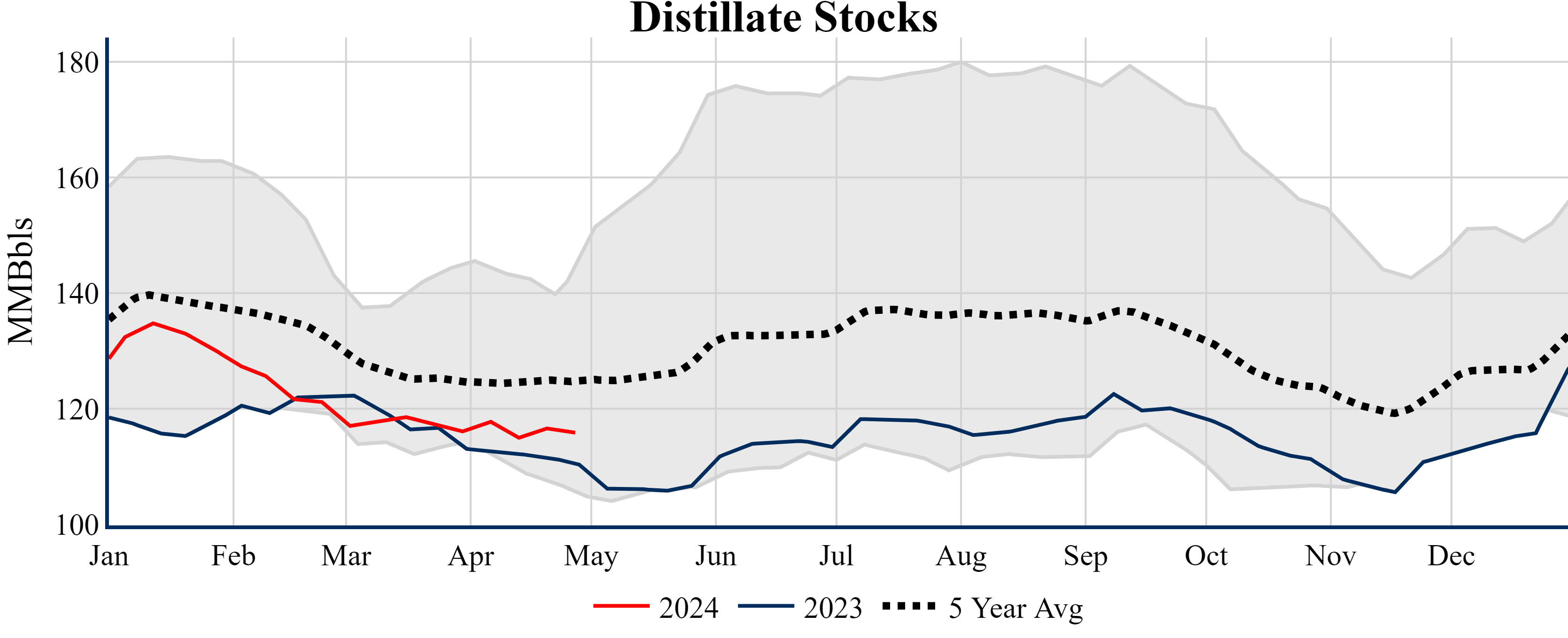 Inventories for the U.S. are now at a surplus of 1.10 MMBbls (0.2%) to last year, and a deficit of 11.60 MMBbls (-2.5%) to the five-year average.