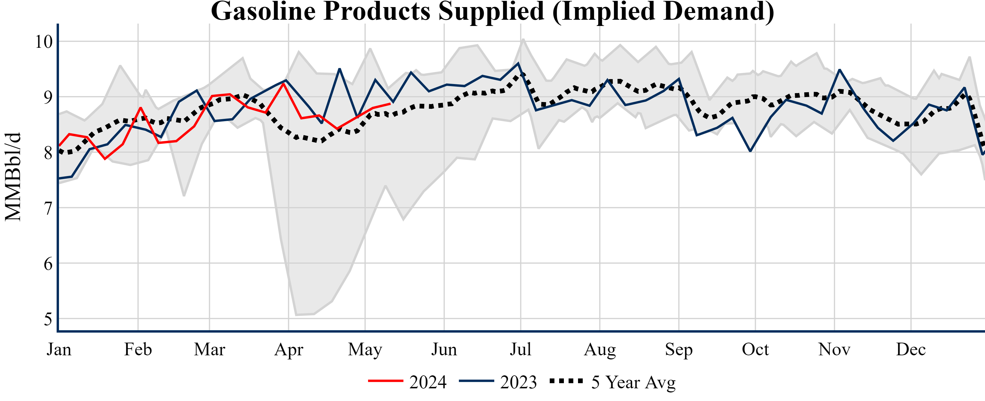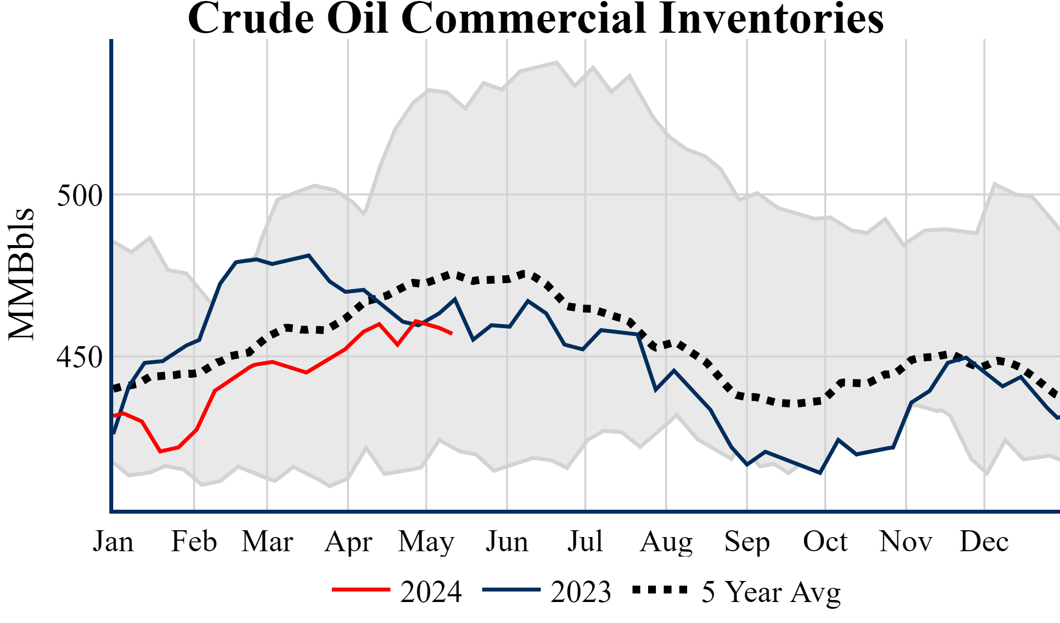 Inventories for the U.S. are now at a deficit of 9.90 MMBbls (-2.1%) to last year, and a deficit of 18.40 MMBbls (-3.9%) to the five-year average.
