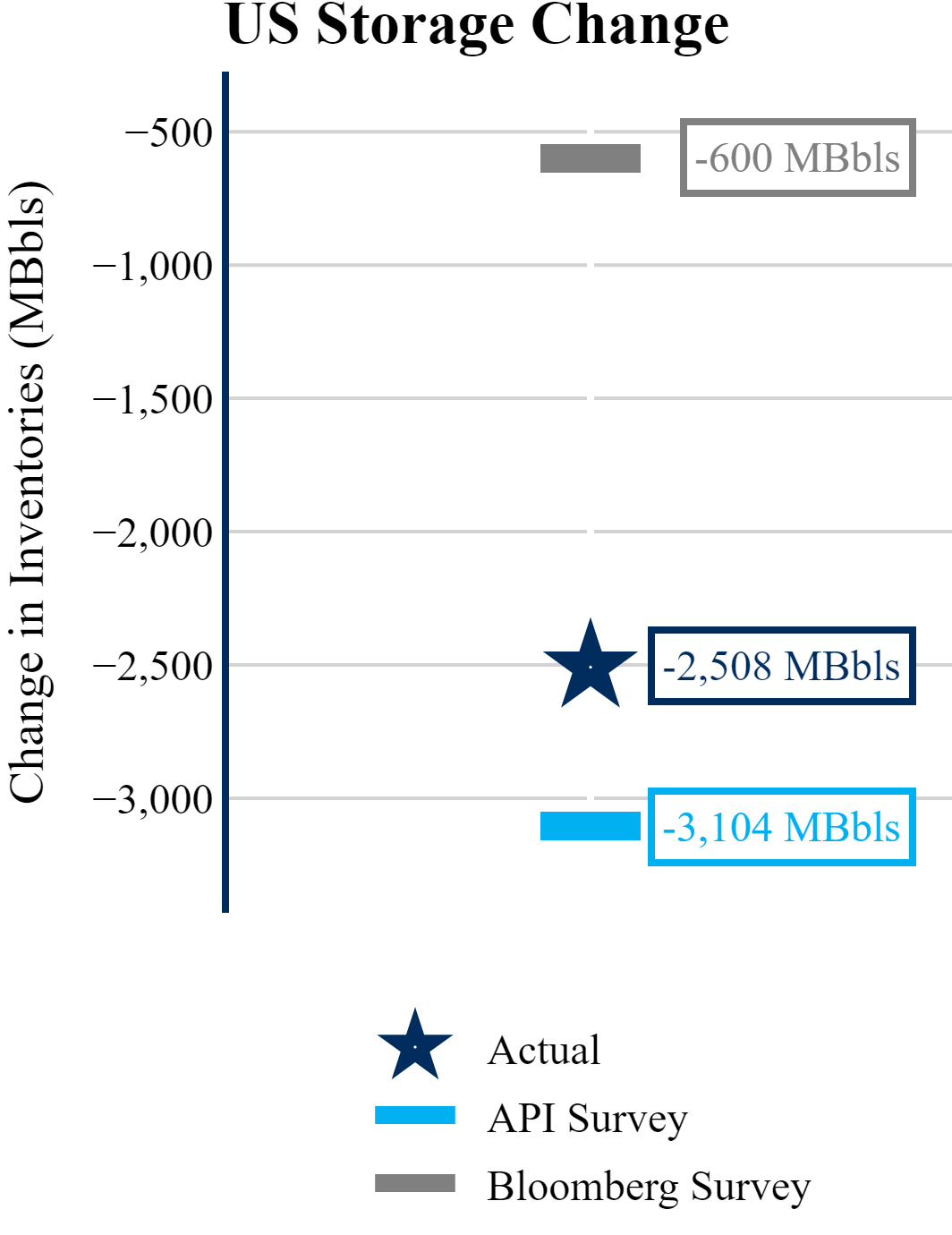 The EIA reported a draw of -2,508 MBbls in U.S. crude-oil inventories. The draw was larger than the average estimate of -600 as reported by Bloomberg.