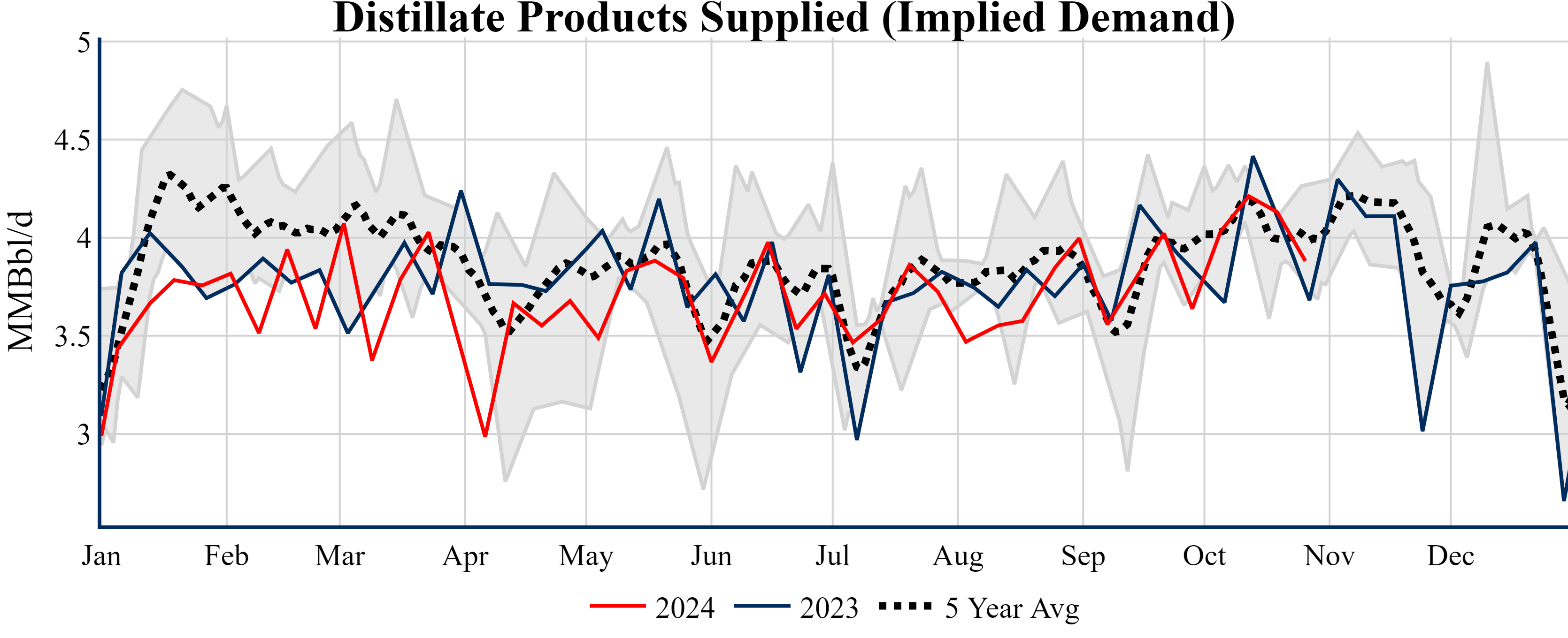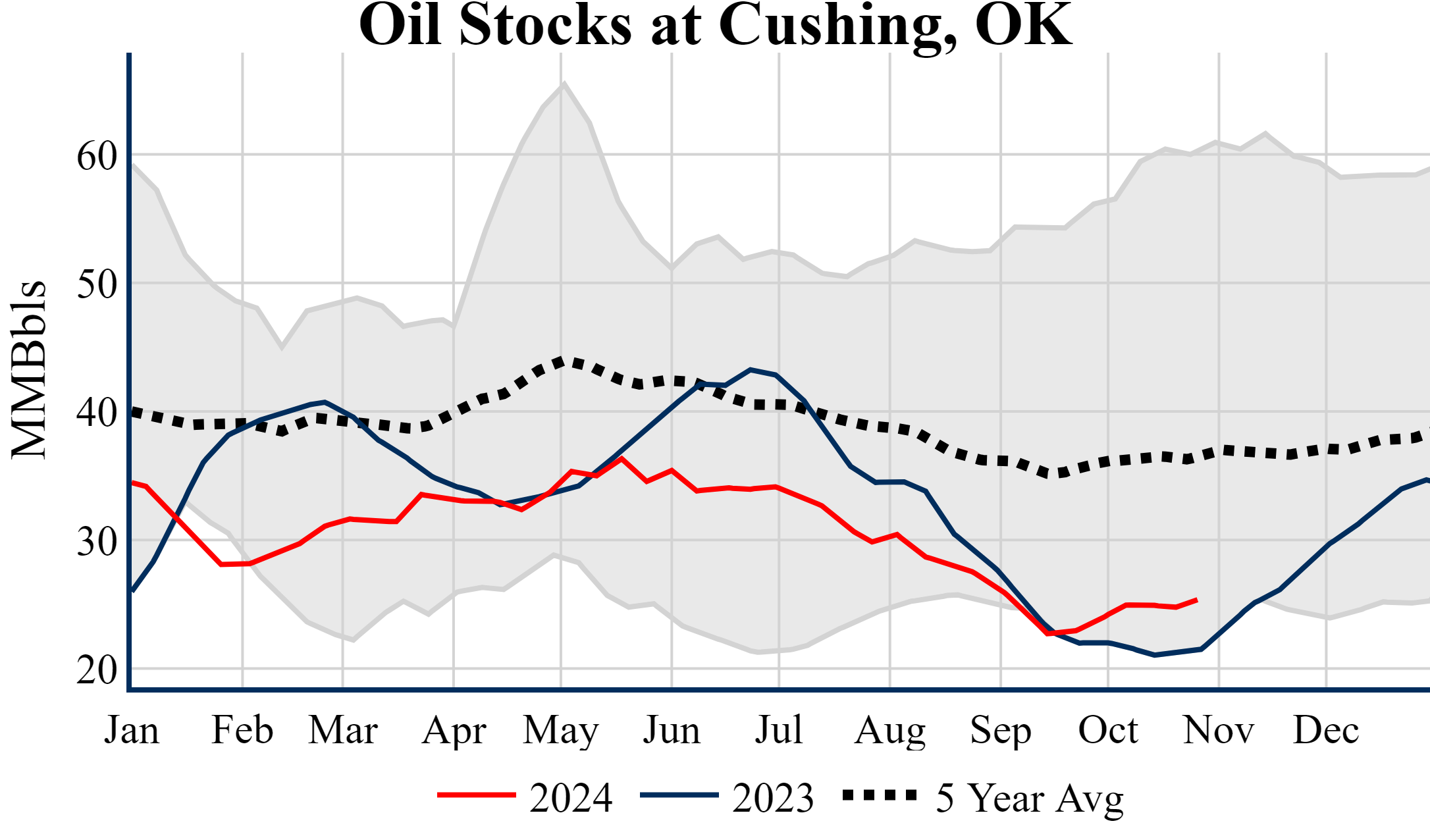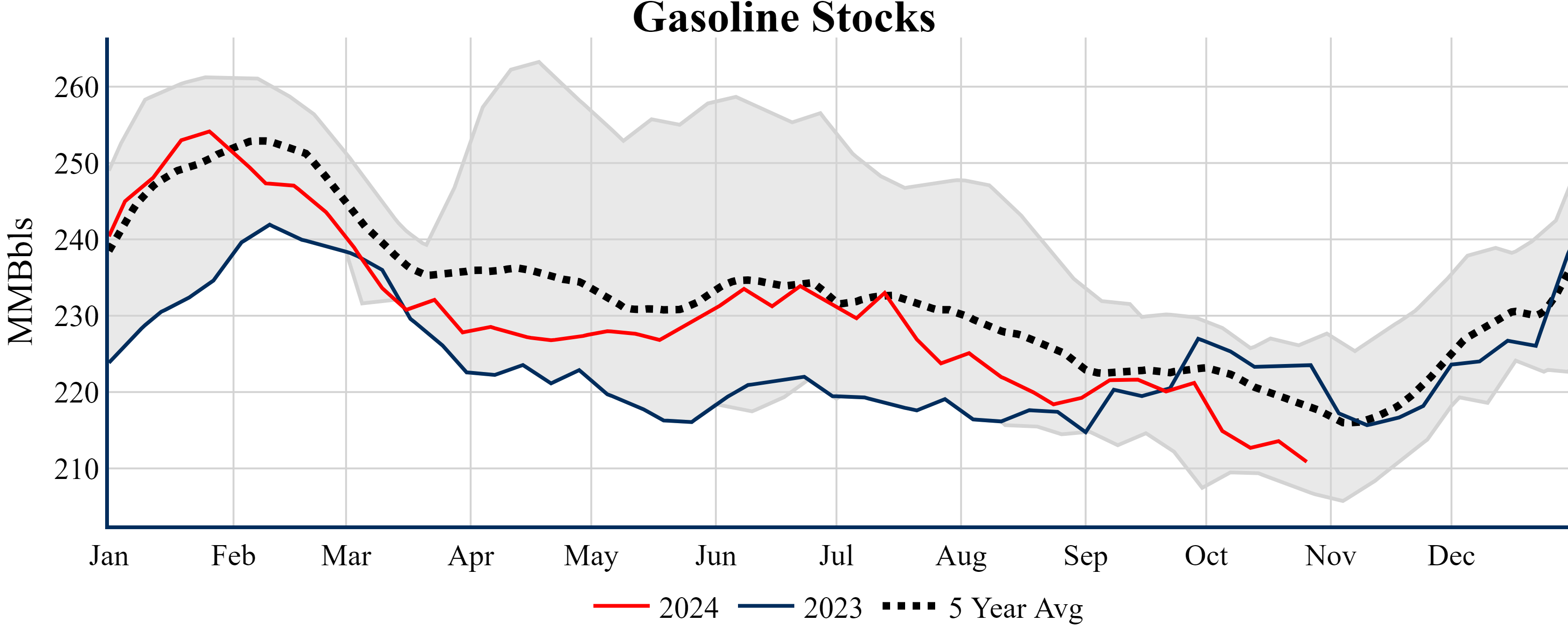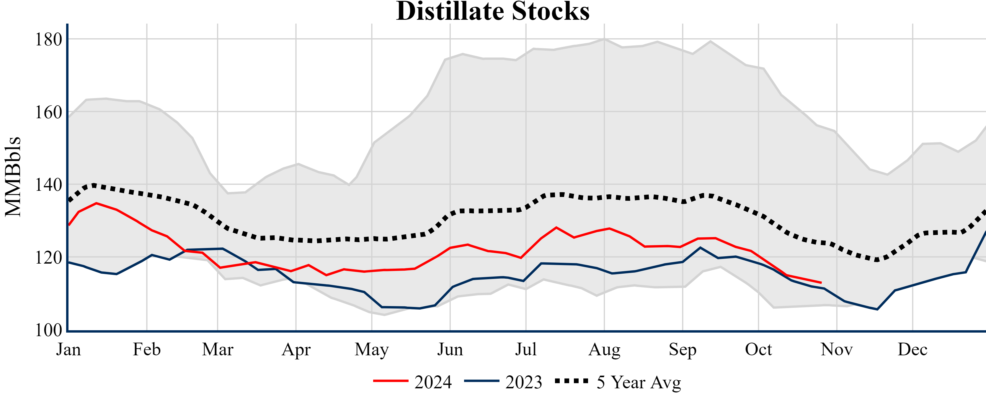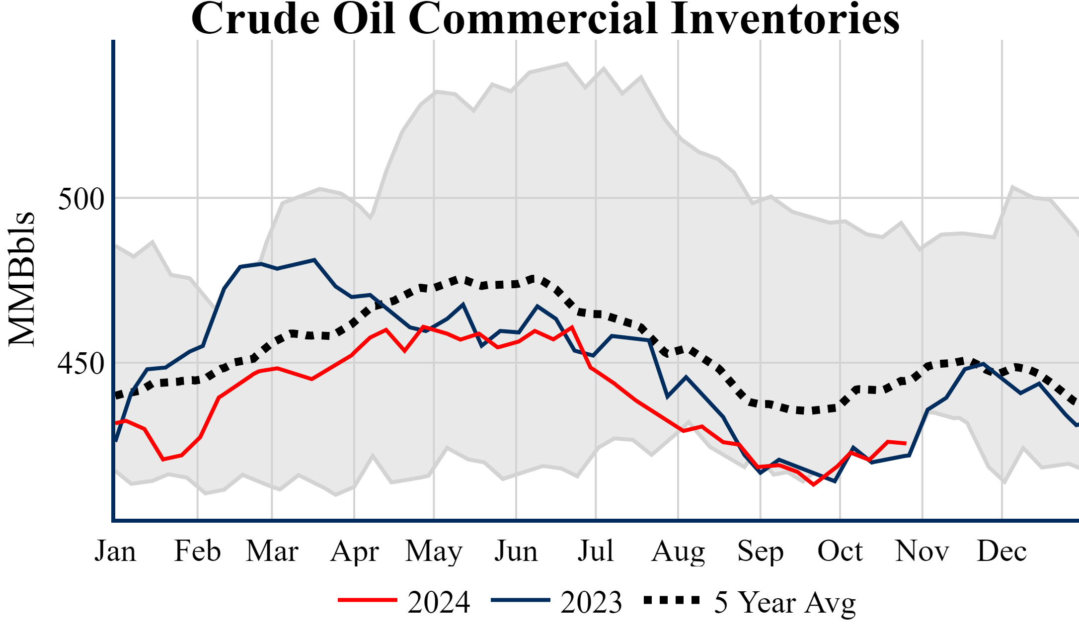 Inventories for the U.S. are now at a surplus of 3.70 MMBbls (0.9%) to last year, and a deficit of 19.00 MMBbls (-4.3%) to the five-year average.