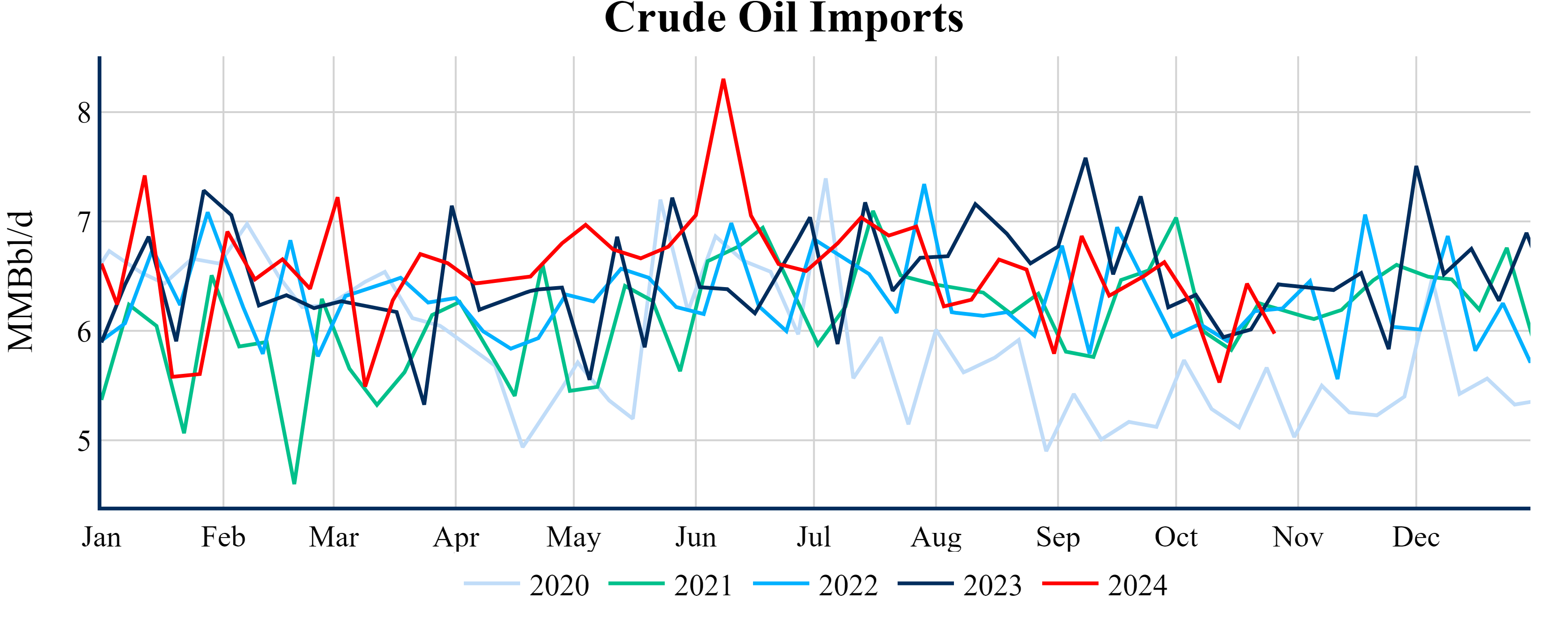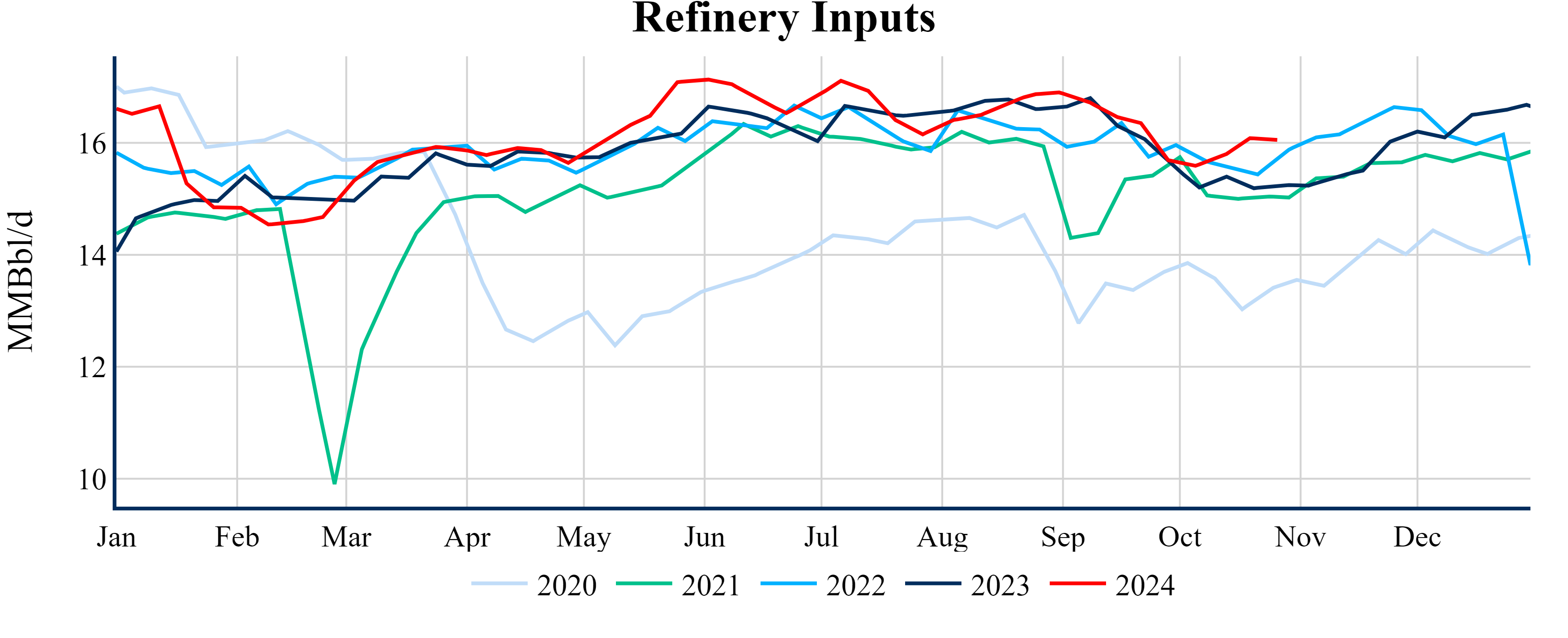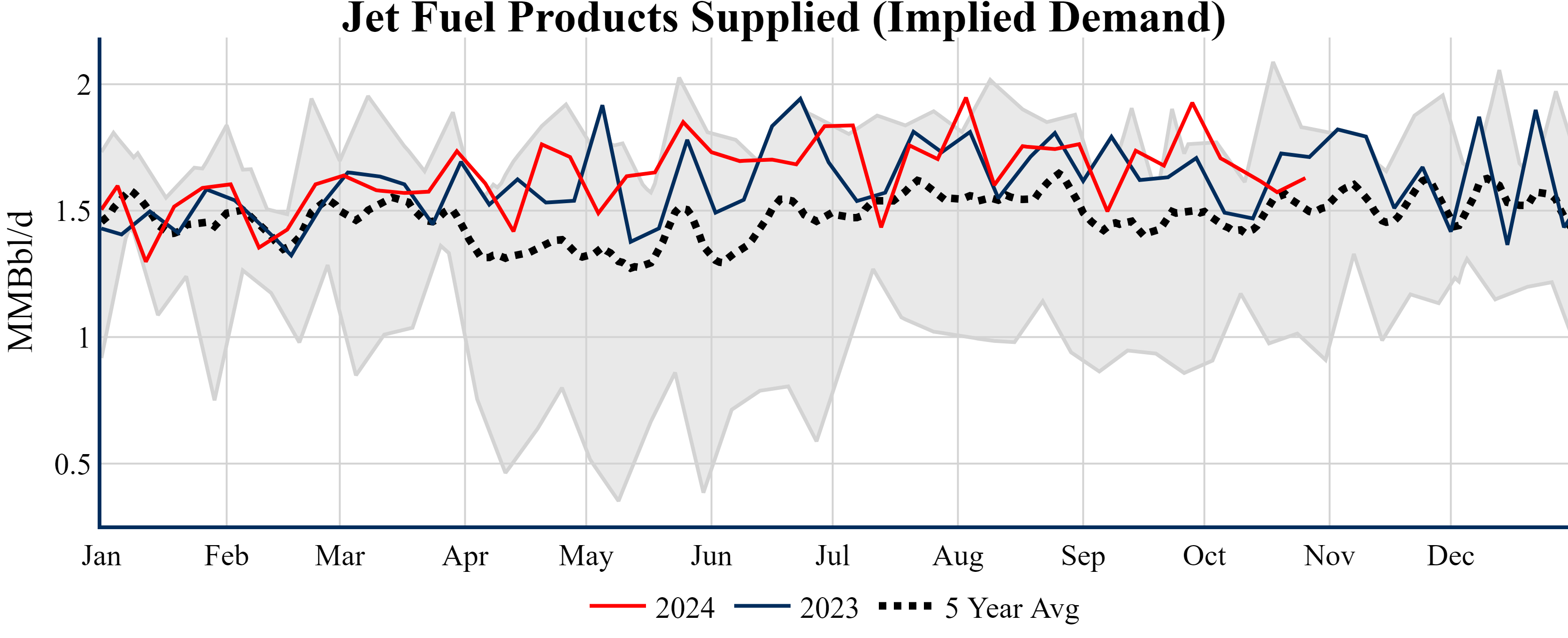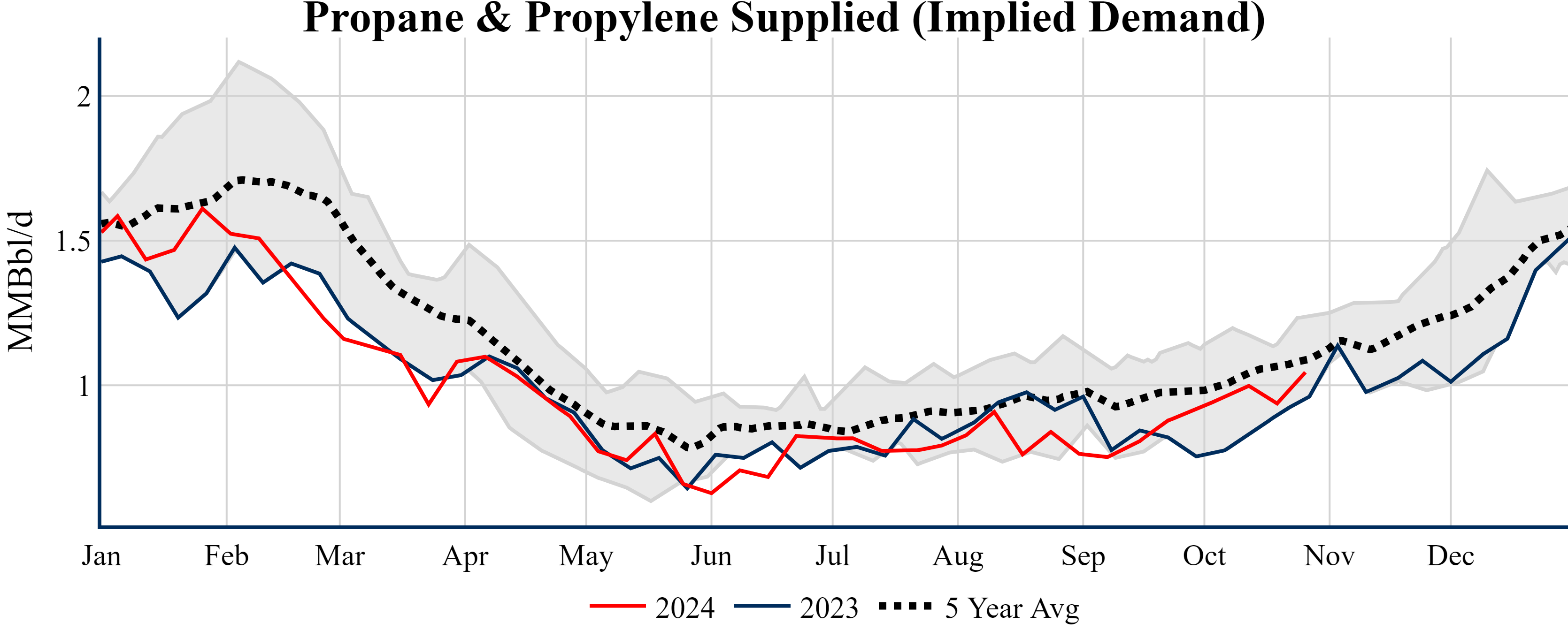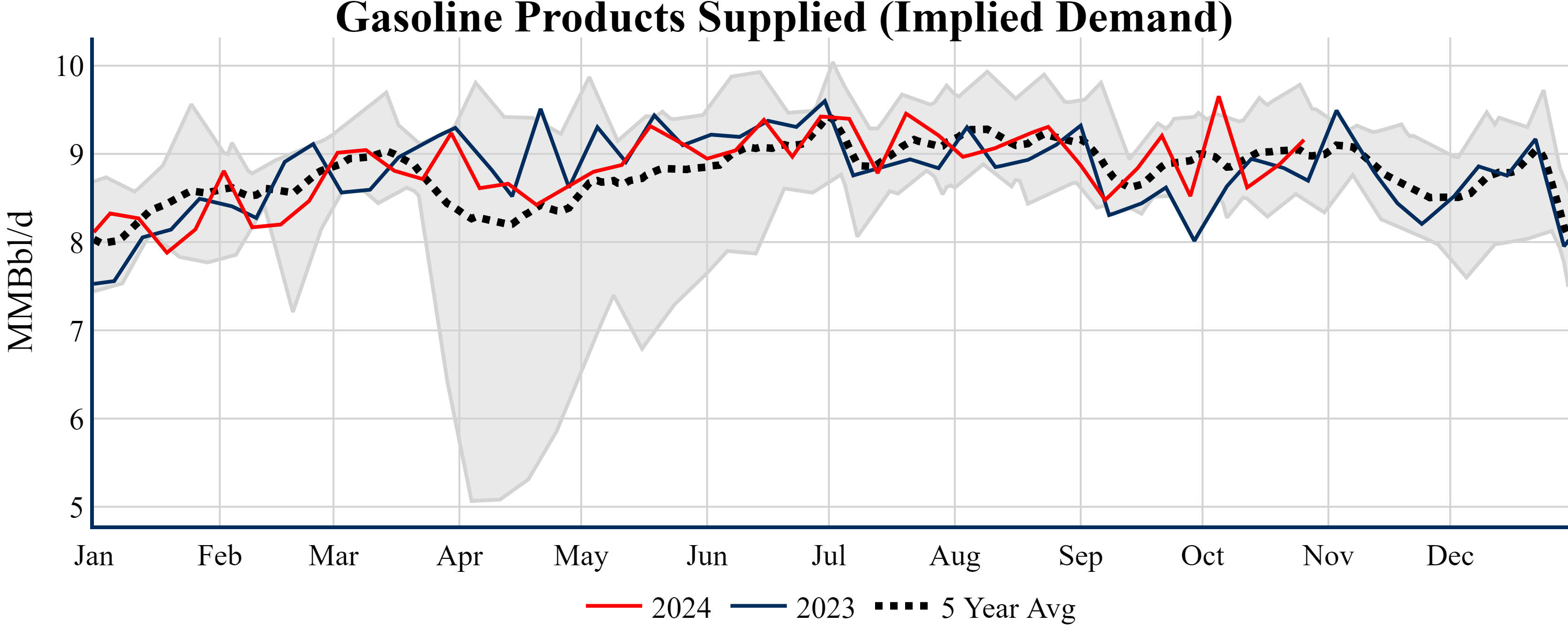 Inventories for the U.S. are now at a surplus of 3.70 MMBbls (0.9%) to last year, and a deficit of 19.00 MMBbls (-4.3%) to the five-year average.