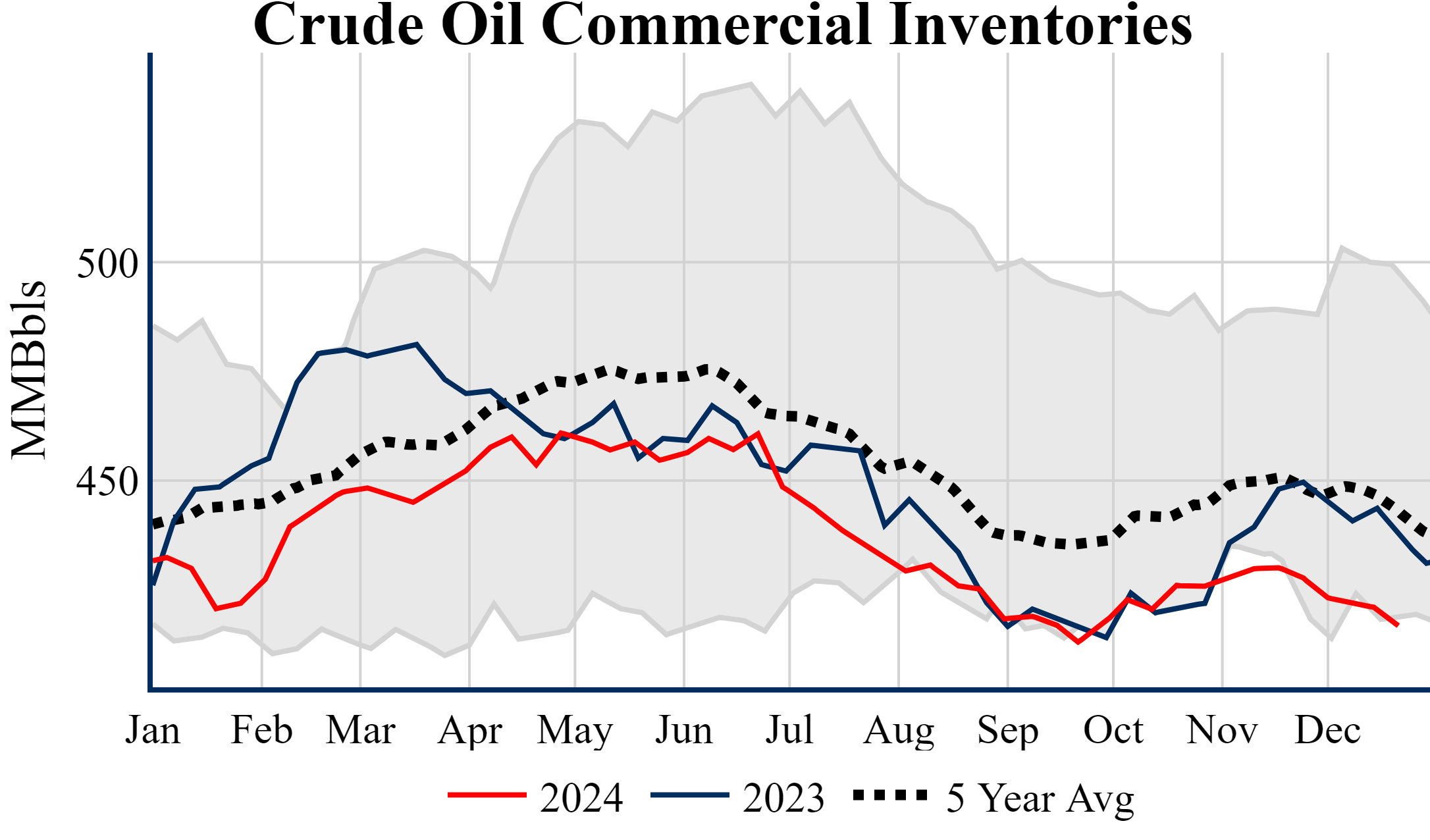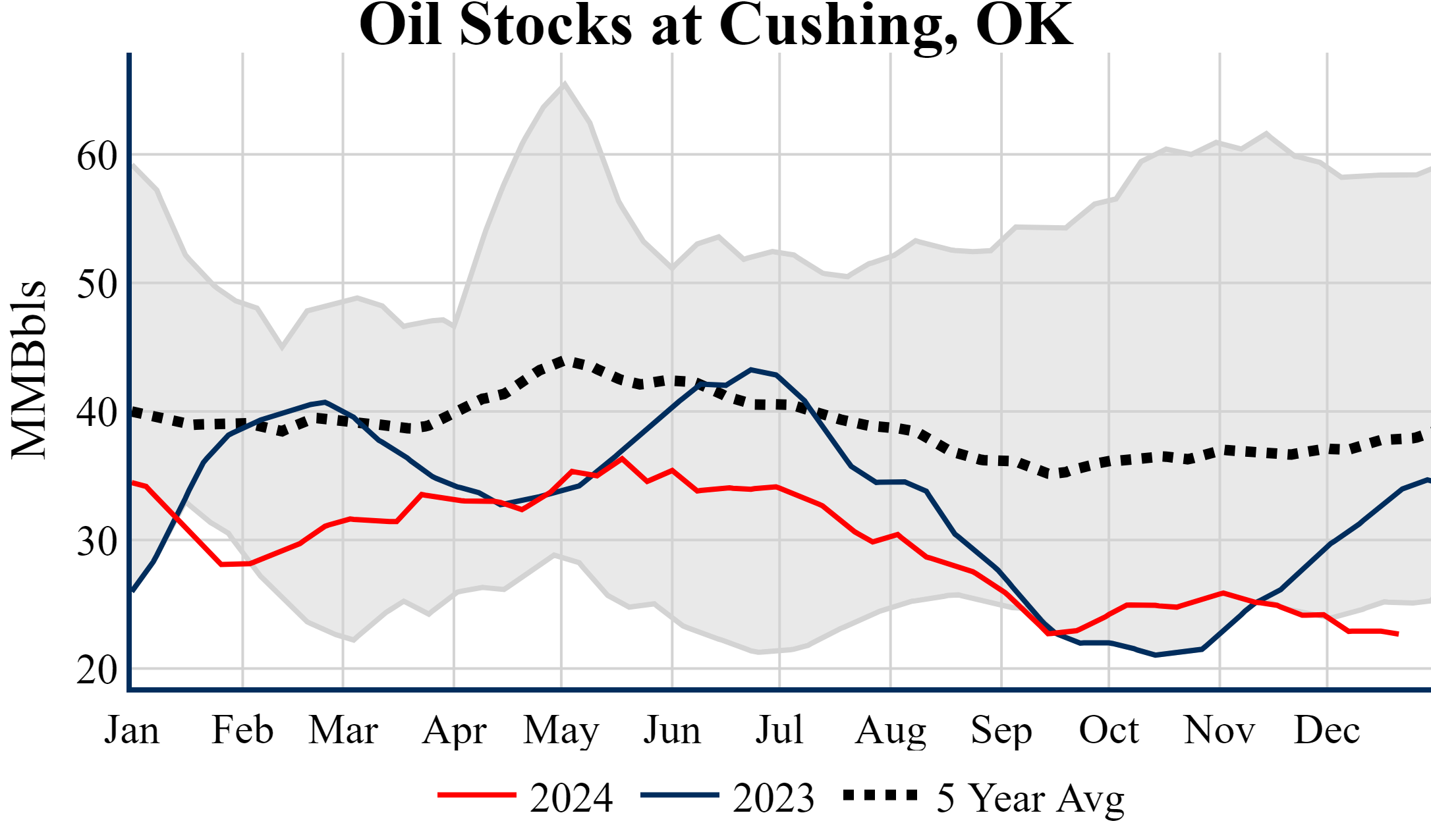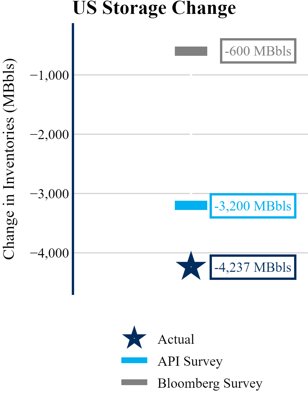 The EIA reported a draw of -4,237 MBbls in U.S. crude-oil inventories. The draw was larger than the average estimate of -600 as reported by Bloomberg. Prices were up in the five minutes following the announcement, to $70.39 from $70.33 just before 12:00 PM. Inventories for the U.S. are now at a deficit of 20.80 MMBbls (-4.8%) to last year, and a deficit of 26.30 MMBbls (-5.9%) to the five-year average.