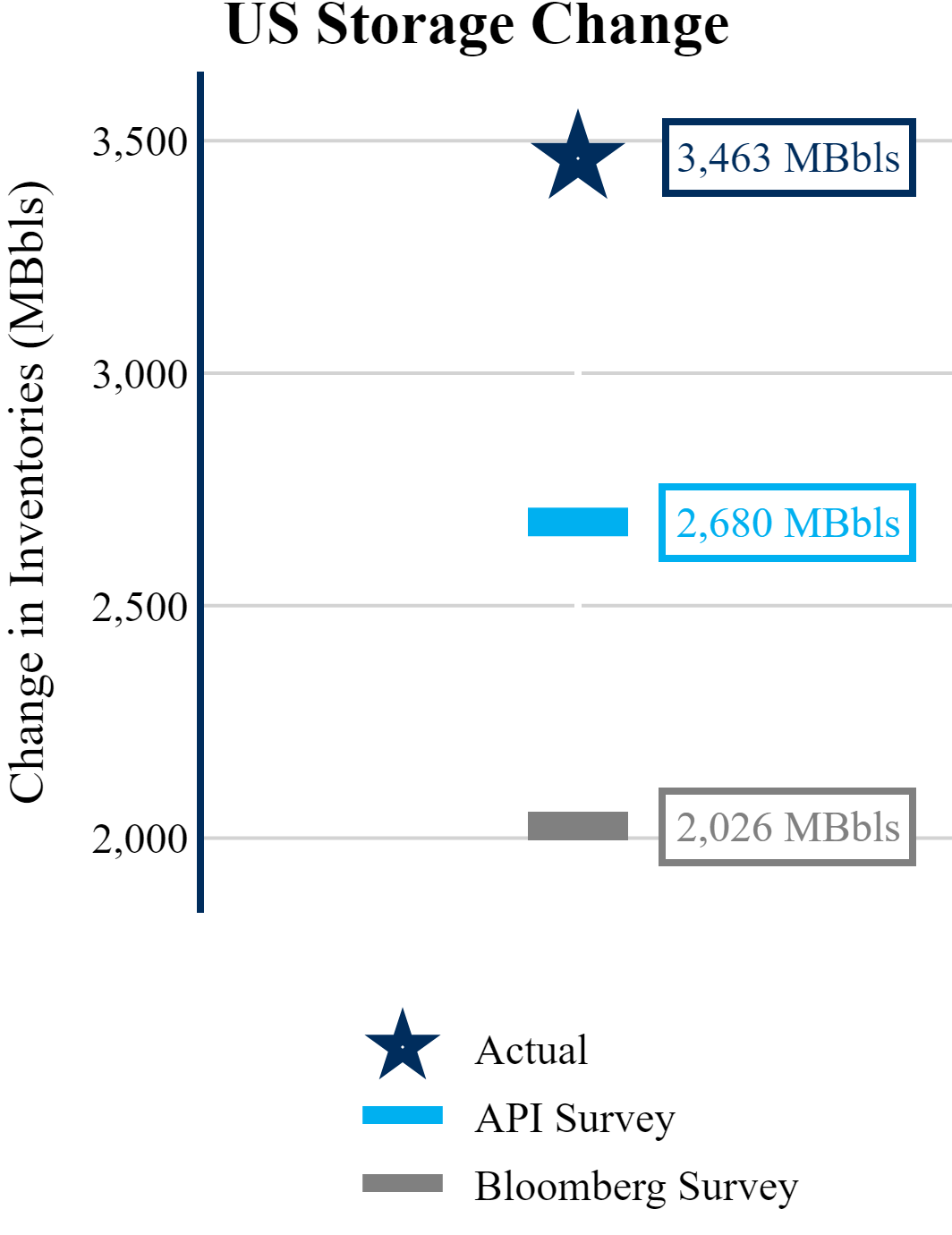 The EIA reported a build of +3,463 MBbls in U.S. crude-oil inventories. The build was larger than the average estimate of +2,026 as reported by Bloomberg.