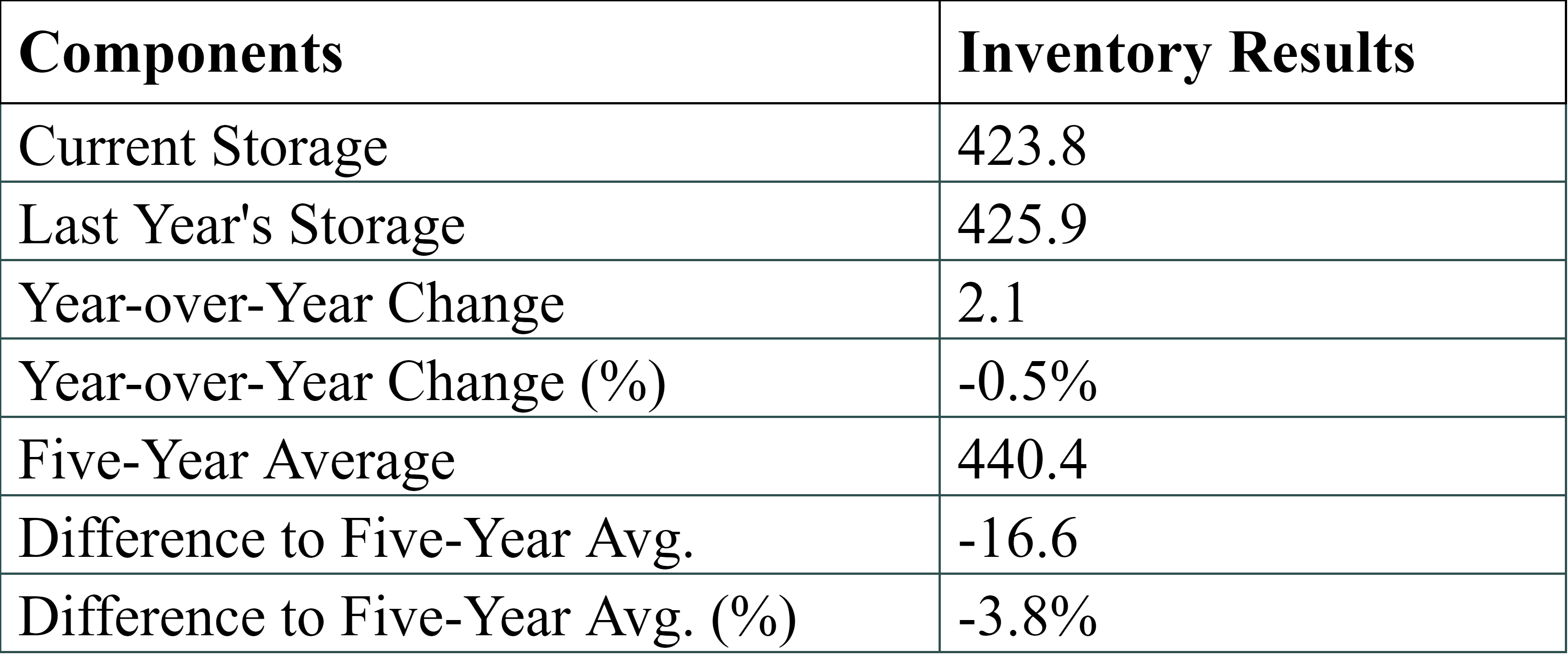 Inventories for the U.S. are now at a surplus of 2.10 MMBbls (-0.5%) to last year, and a deficit of 16.60 MMBbls (-3.8%) to the five-year average.