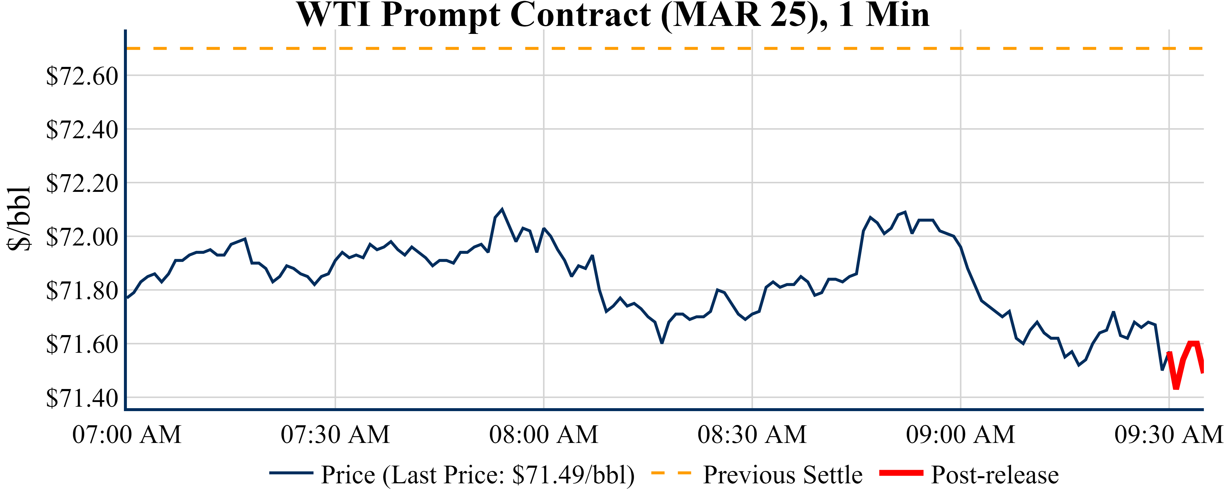 Prices were down in the five minutes following the announcement, to $71.49 from $71.57 just before 09:30 AM.