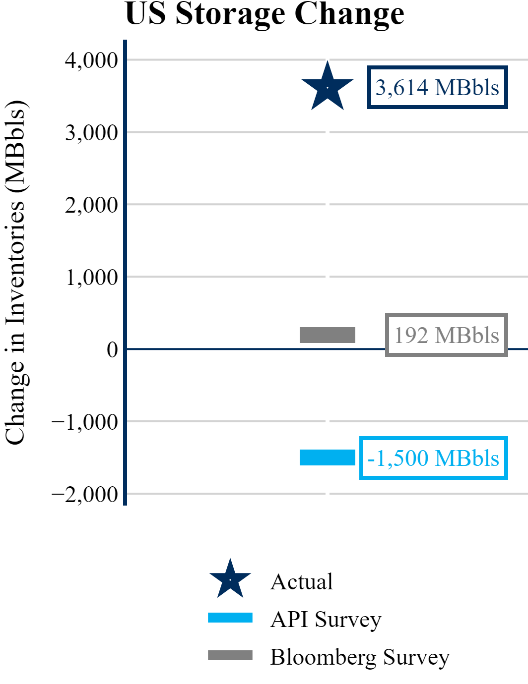 The EIA reported a build of +3,614 MBbls in U.S. crude-oil inventories. The build was larger than the average estimate of +192 as reported by Bloomberg.