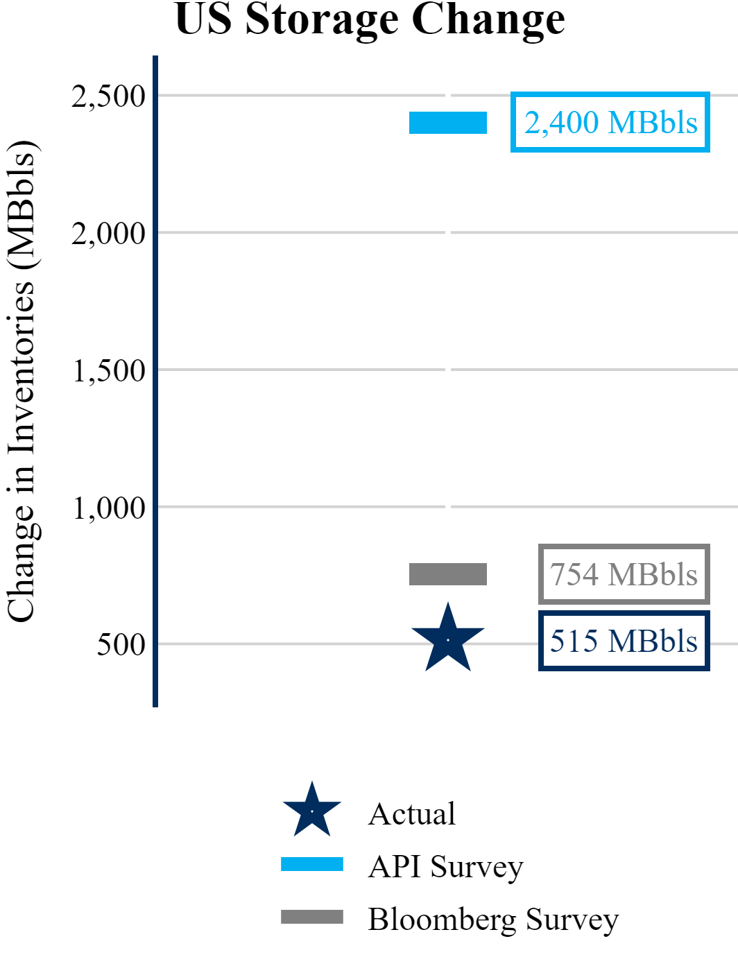 The EIA reported a build of +515 MBbls in U.S. crude-oil inventories. The build was smaller than the average estimate of +754 as reported by Bloomberg.