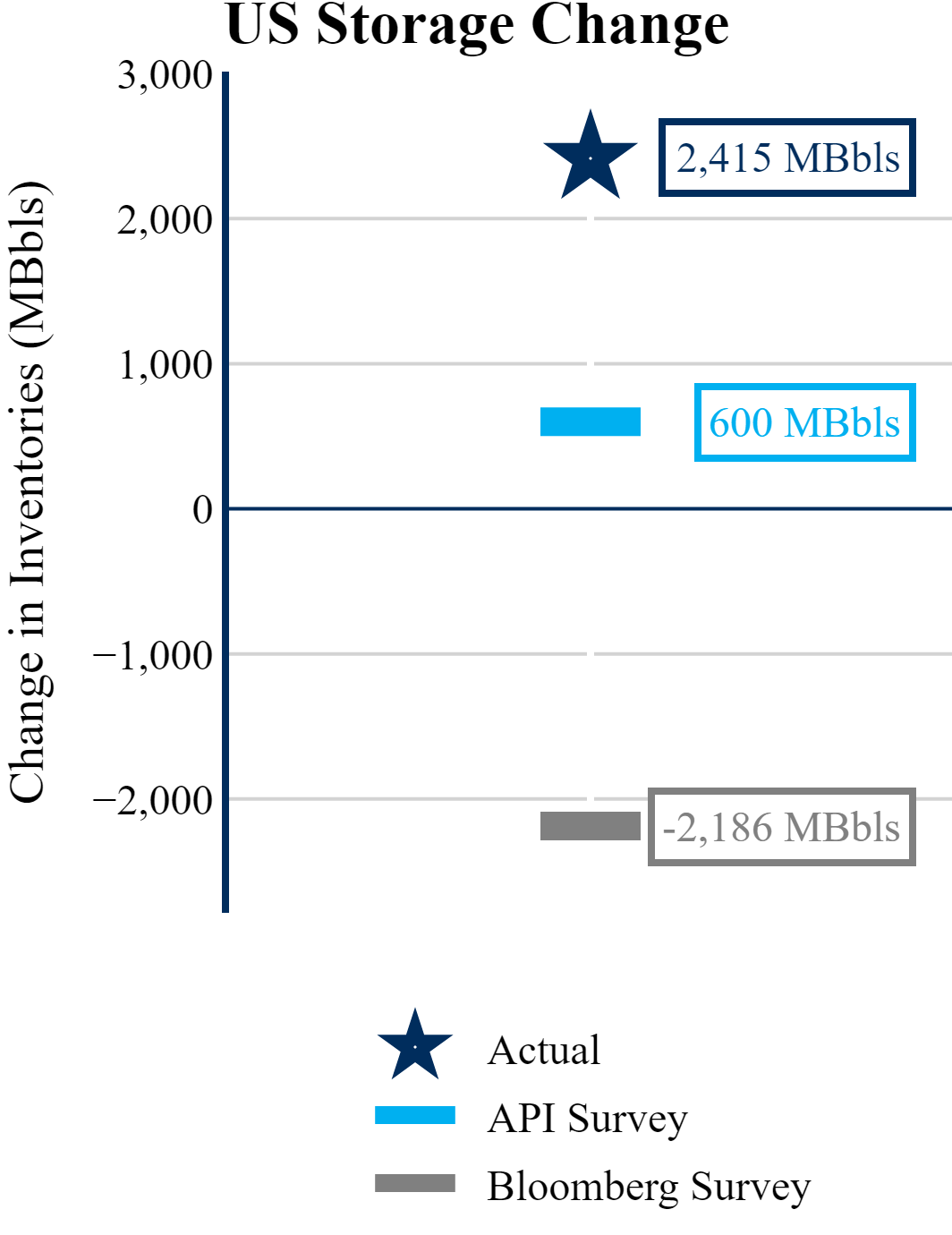The EIA reported a build of 2,415 MBbls in U.S. crude-oil inventories. In contrast, the market expected a draw of 2,186 MBbls as reported by Bloomberg.