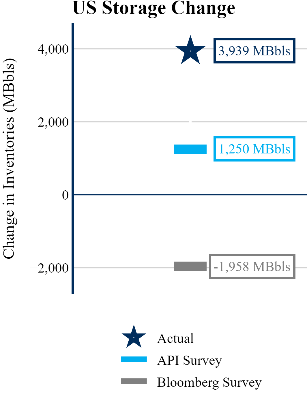 The EIA reported a build of +3,939 MBbls in U.S. crude-oil inventories. In contrast, the market expected a draw of -1,958 MBbls as reported by Bloomberg.
