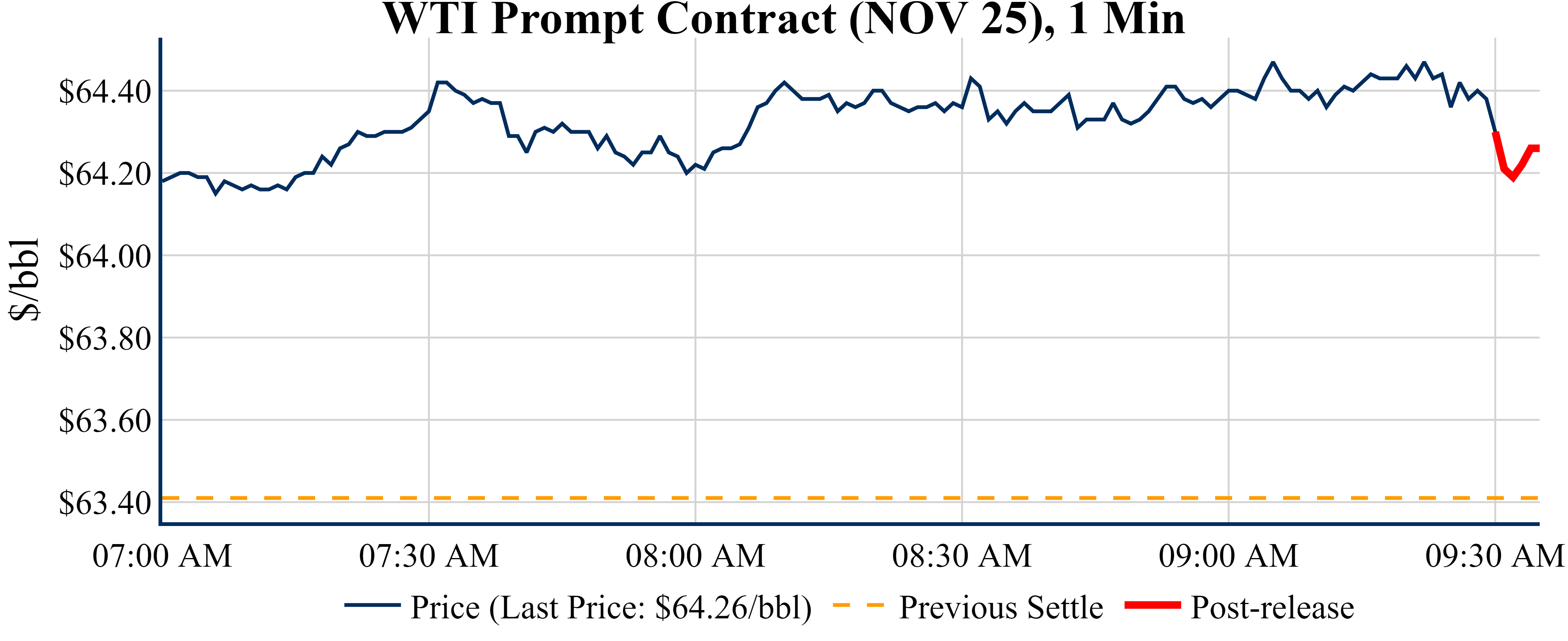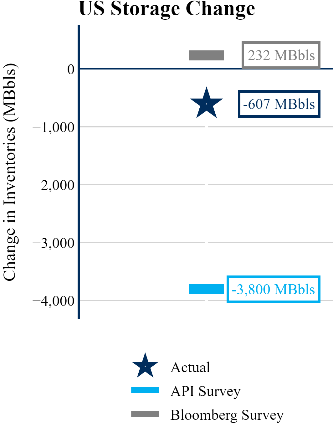 The EIA reported a draw of -607 MBbls in U.S. crude-oil inventories. In contrast, the market expected a build of +232 MBbls as reported by Bloomberg.