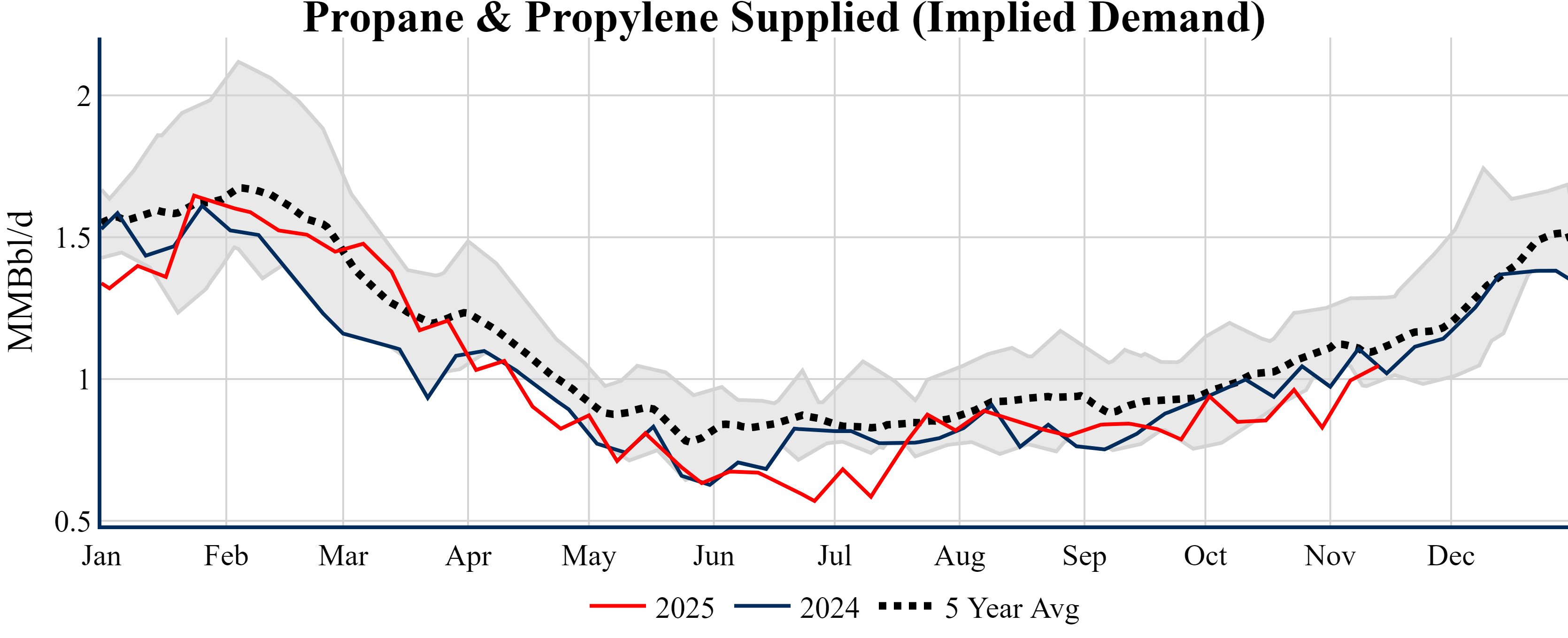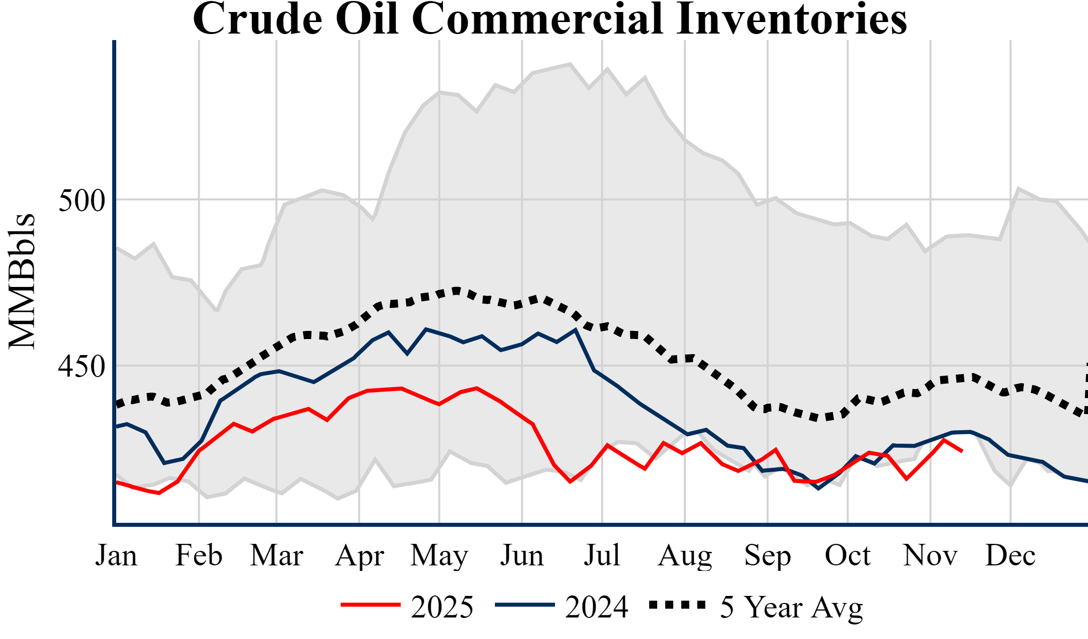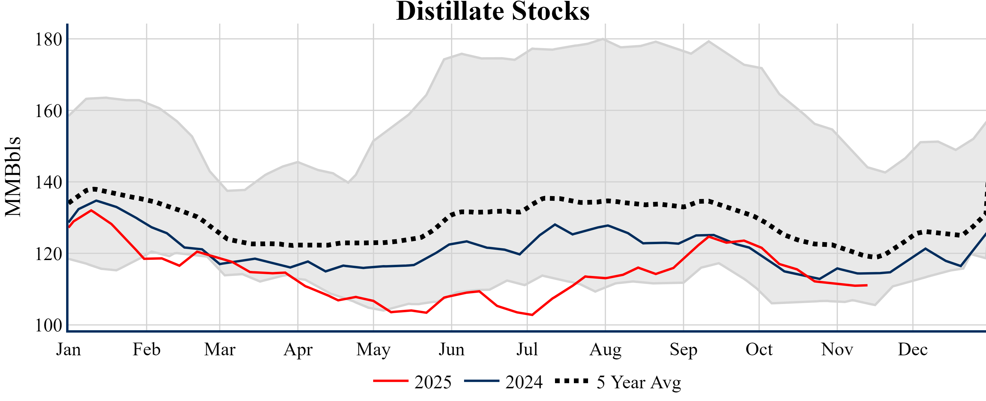 Inventories for the U.S. are now at a deficit of 6.00 MMBbls (-1.4%) to last year, and a deficit of 22.00 MMBbls (-4.9%) to the five-year average.