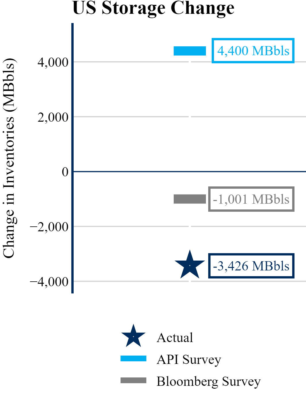 The EIA reported a draw of 3,426 MBbls in U.S. crude-oil inventories. The draw was larger than the average estimate of -1,001 as reported by Bloomberg.