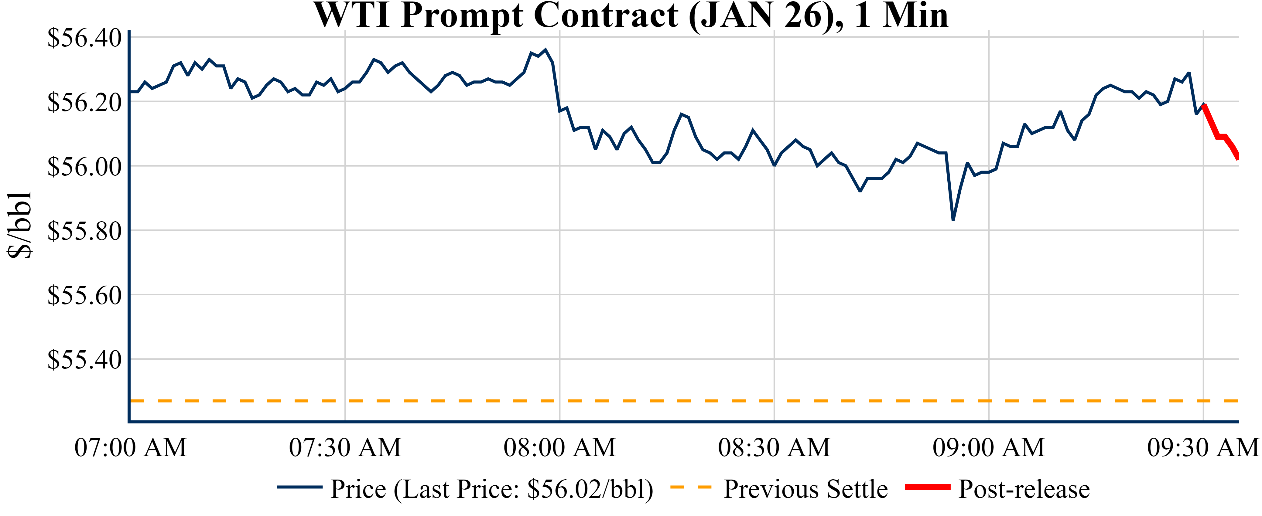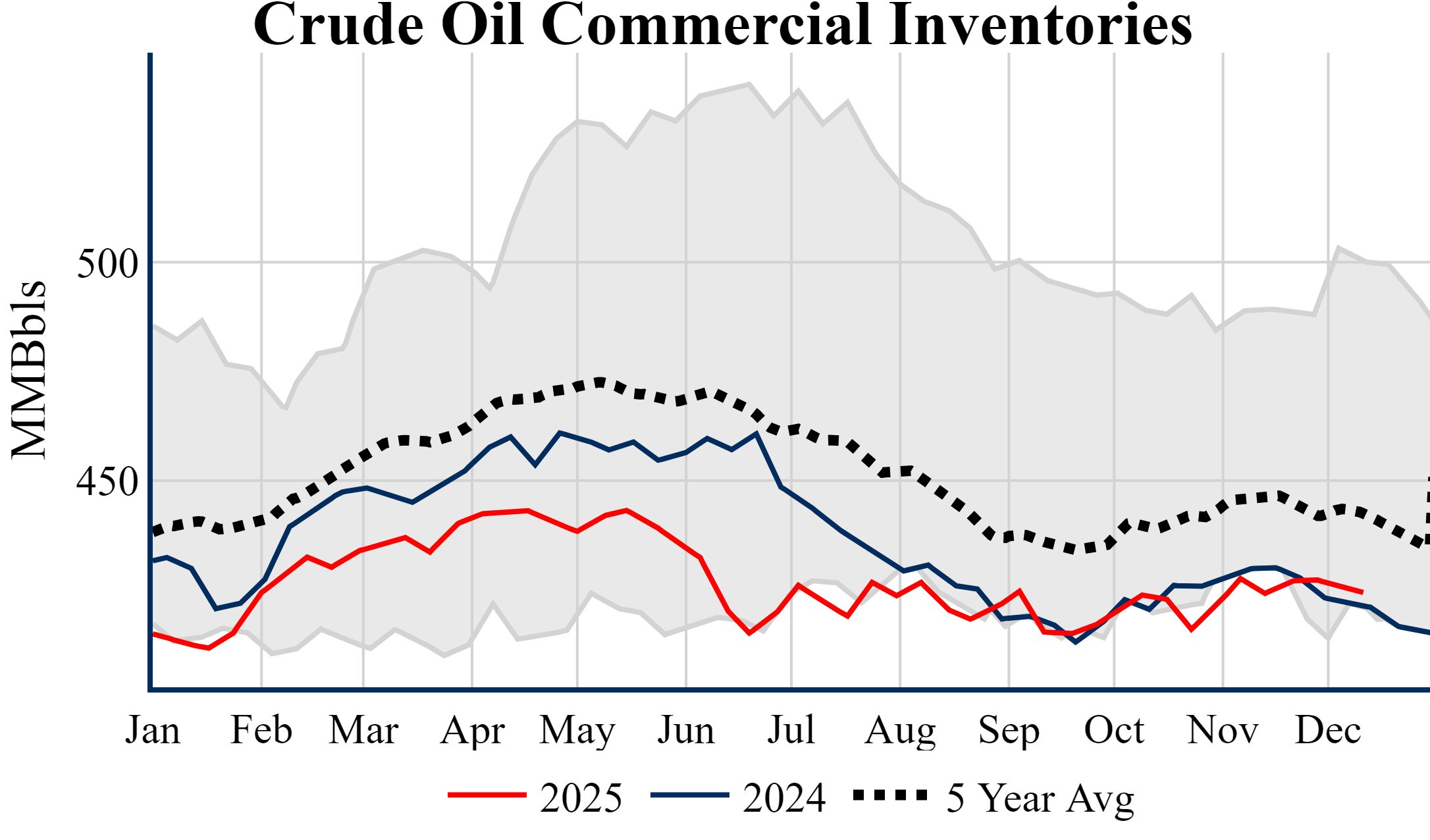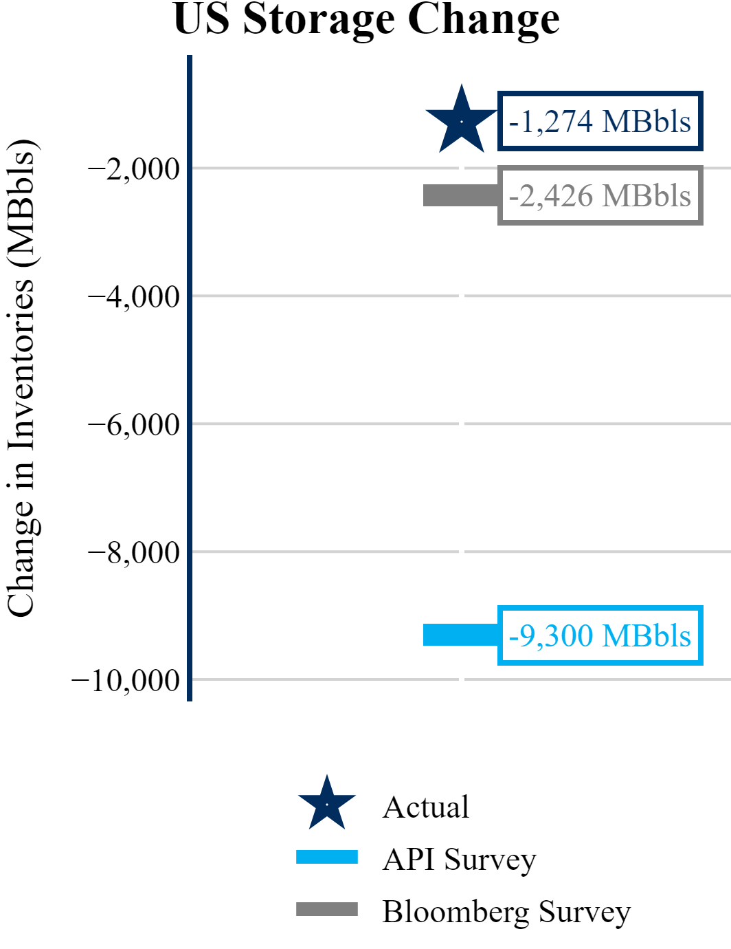 The EIA reported a draw of -1,274 MBbls in U.S. crude-oil inventories. The draw was smaller than the average estimate of -2,426 as reported by Bloomberg. Inventories for the U.S. are now at a surplus of 3.10 MMBbls (0.7%) to last year, and a deficit of 18.10 MMBbls (-4.1%) to the five-year average.